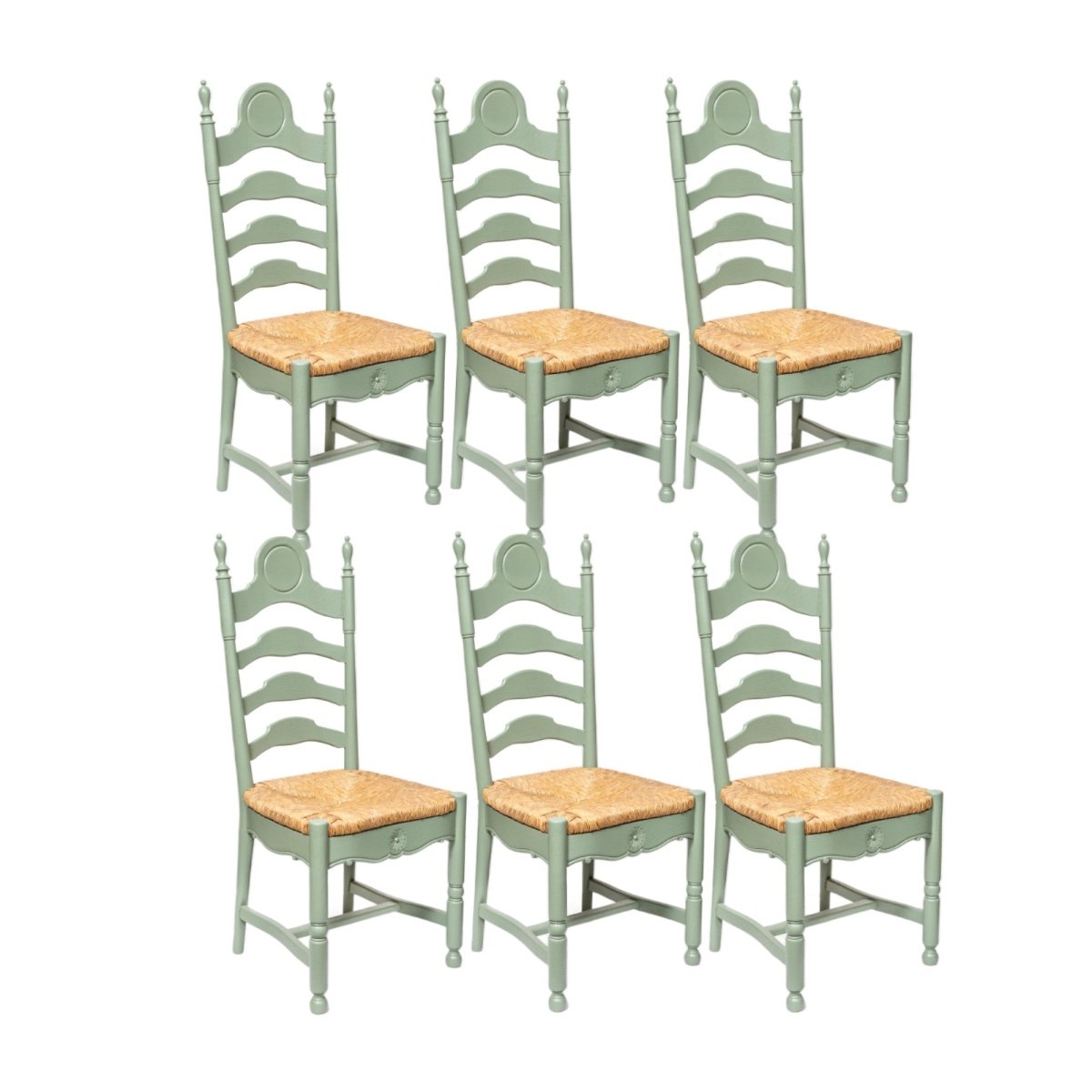 A stylish set of pale green painted oak provincial dining chairs, French 19th Century with rush seats
