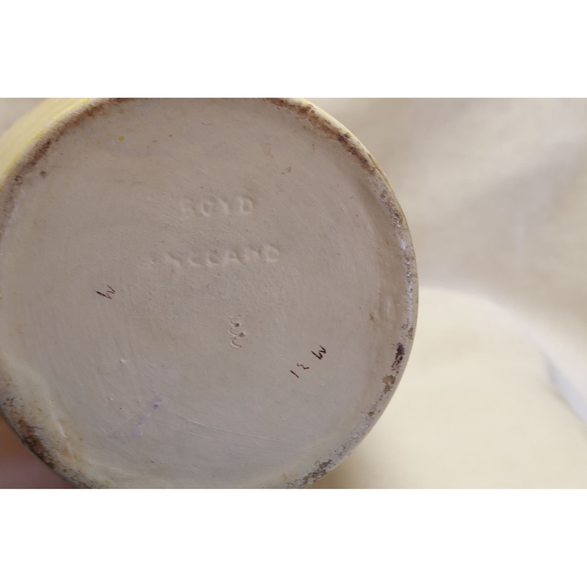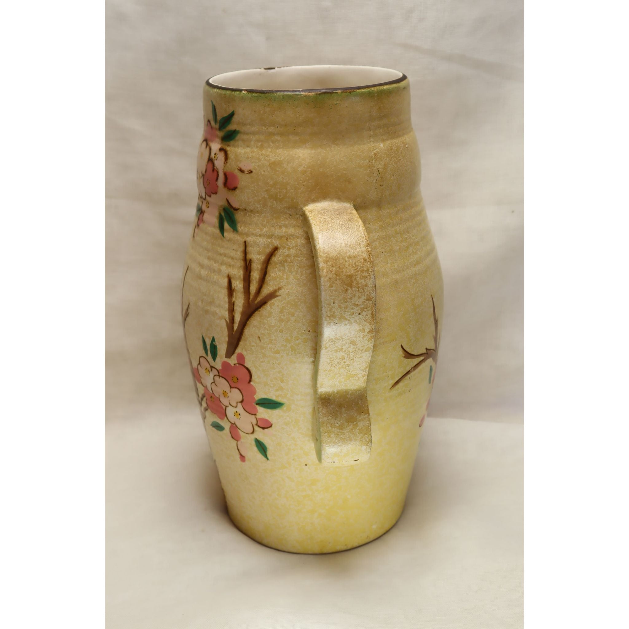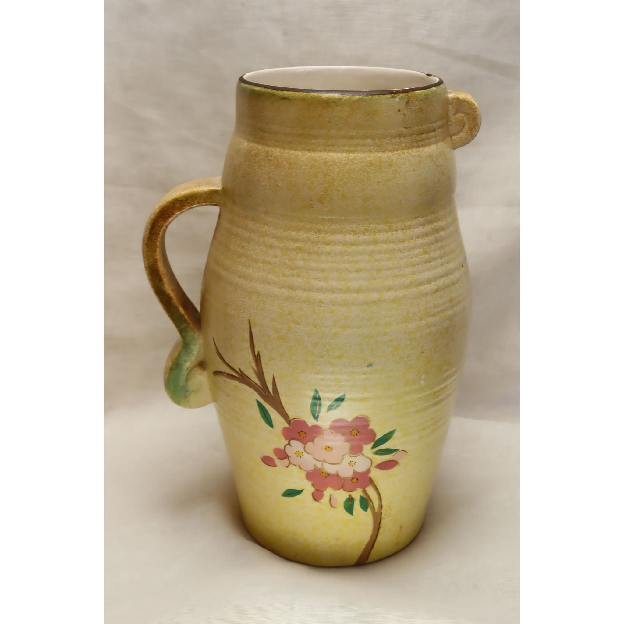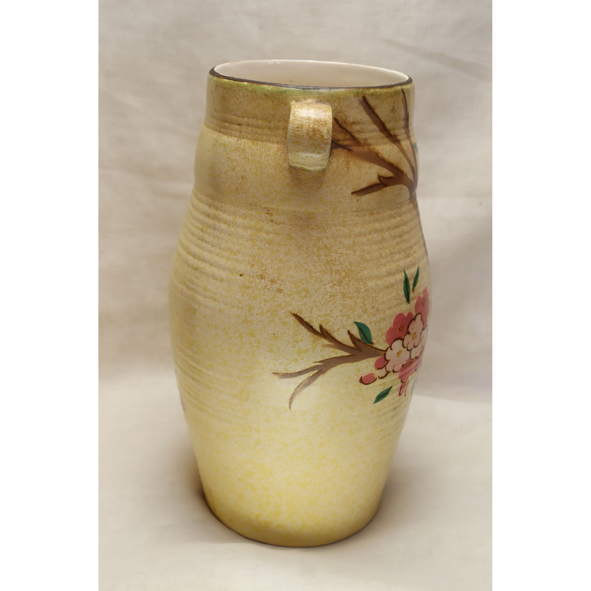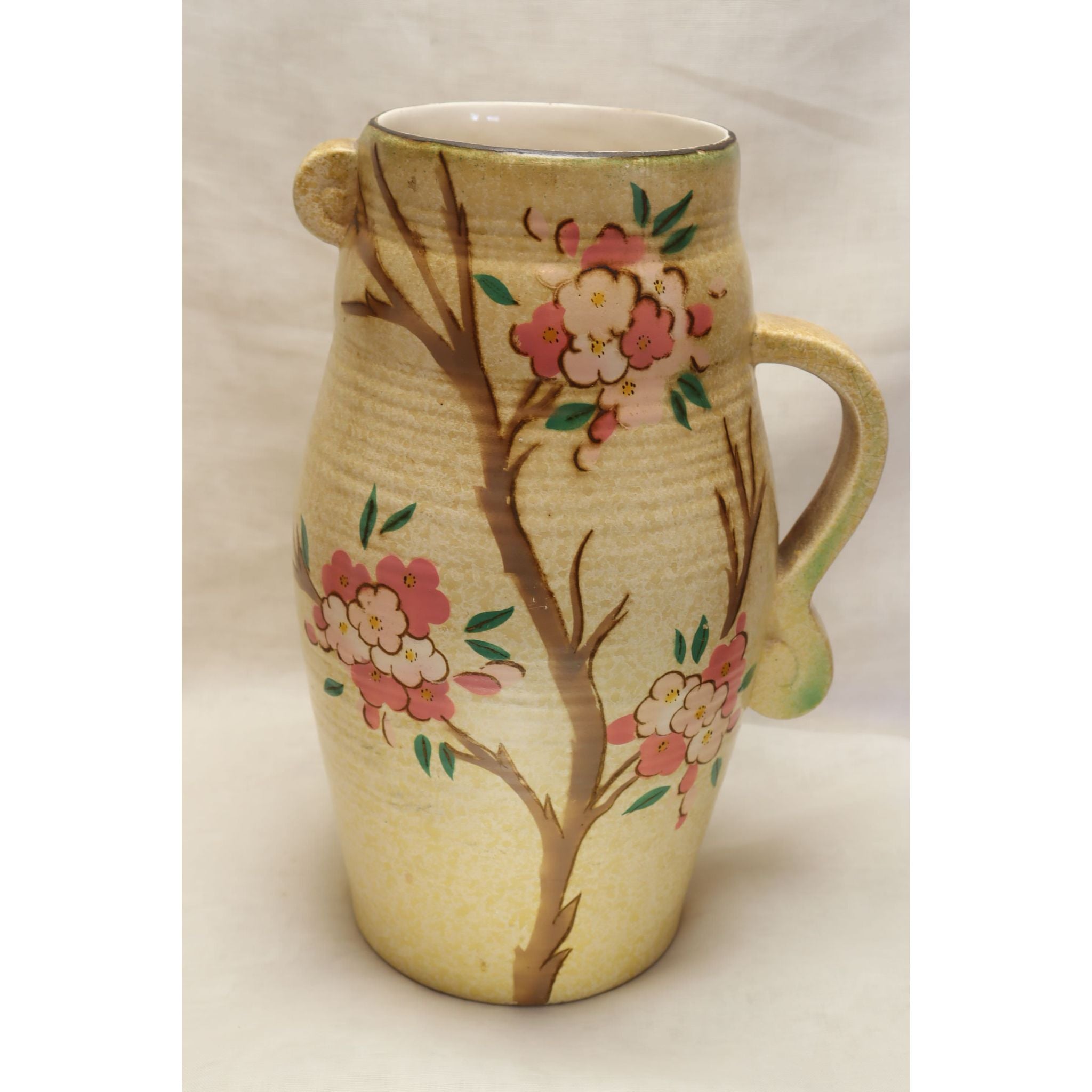 This Art Deco vase is decorated with a hand painted spray of pink and white flowers on a branch, all on a buff coloured ground. This motif is reprised in a smaller spray on the back. Shaped to resemble a wheel thrown jug, it stands 262 mm (10.25 inches) high and has a diameter of 150 mm (6 inches). The base carries the impressed mark "Boyd England". It does how some very slight signs of use, but overall it is in very good condition. It would date from the early 1930's.