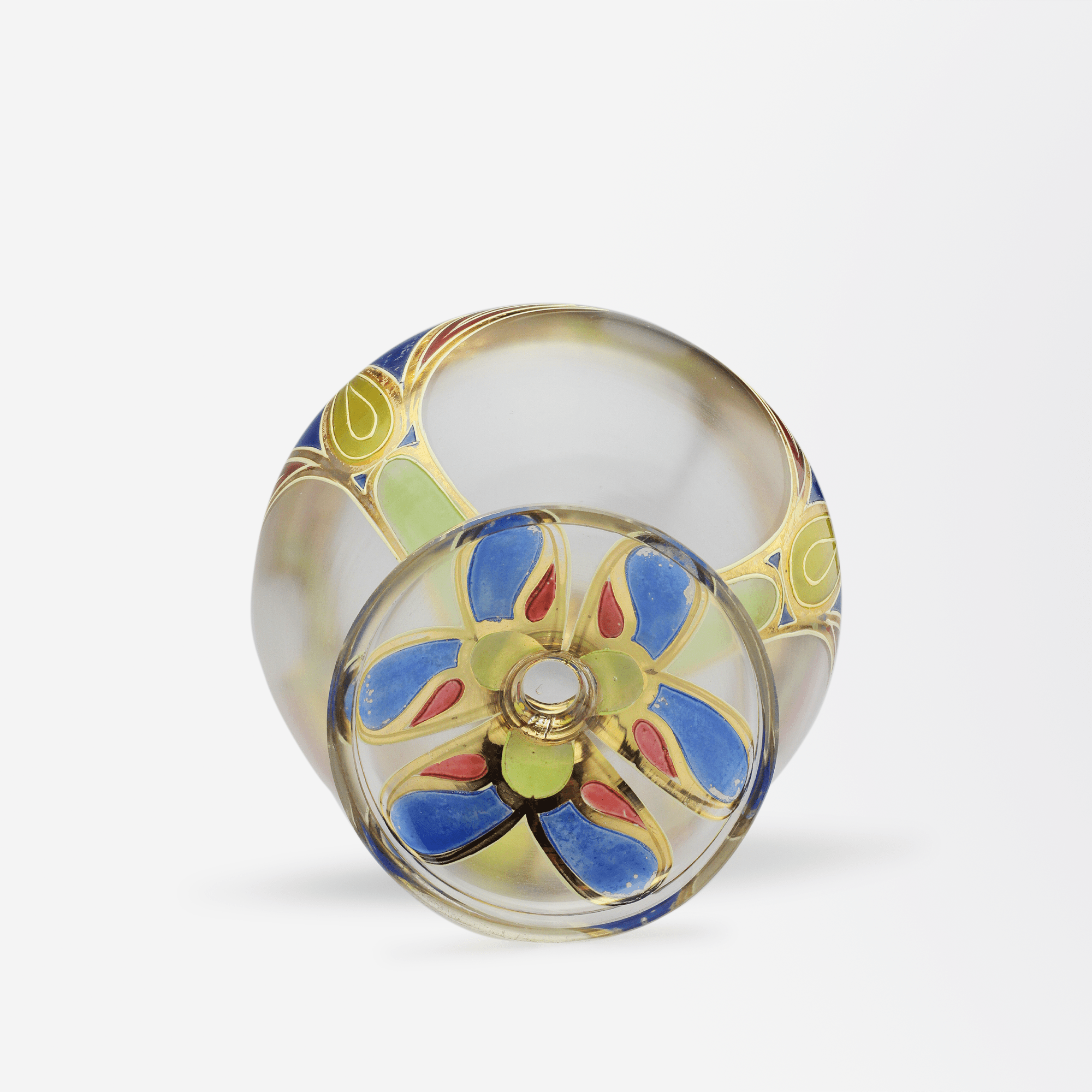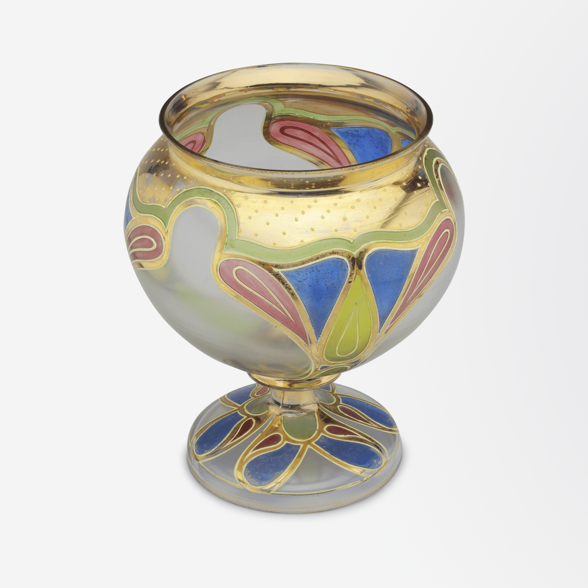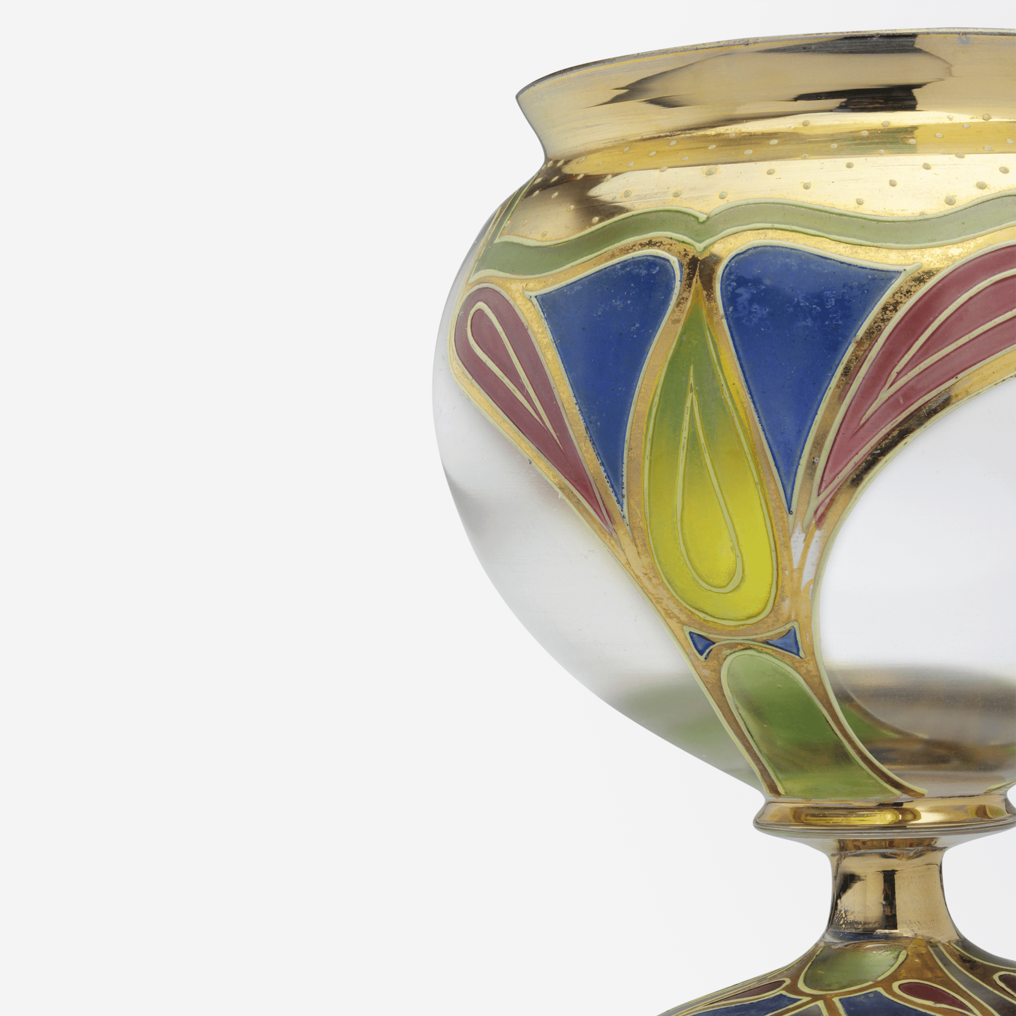 A small Bohemian glass vase with reserve panels of silk glass, arabesque polychrome enamels, and gilt flashing in the Art Nouveau style.