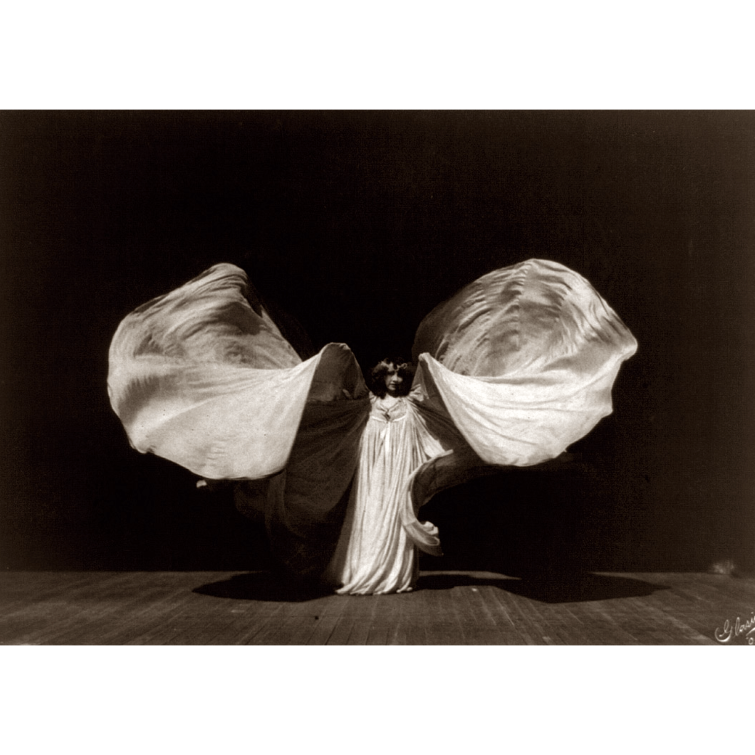 The shapes and forms of this design are reminiscent of the work of dancer Loie Fuller, who was the inspiration for many artists during the Art Nouveau period. The Exposition Universelle of 1900 marked the height of the movement's flowing, feminine subjects inspired by nature. Fuller herself personified the movement, with performances that incorporated swirling yards of silk attached to bamboo wands sewn into her sleeves. Colored lights were projected onto the flowing fabric, and as she twirled, she seemed to metamorphose into elements from the natural world: a flower, a butterfly, a tongue of flame.