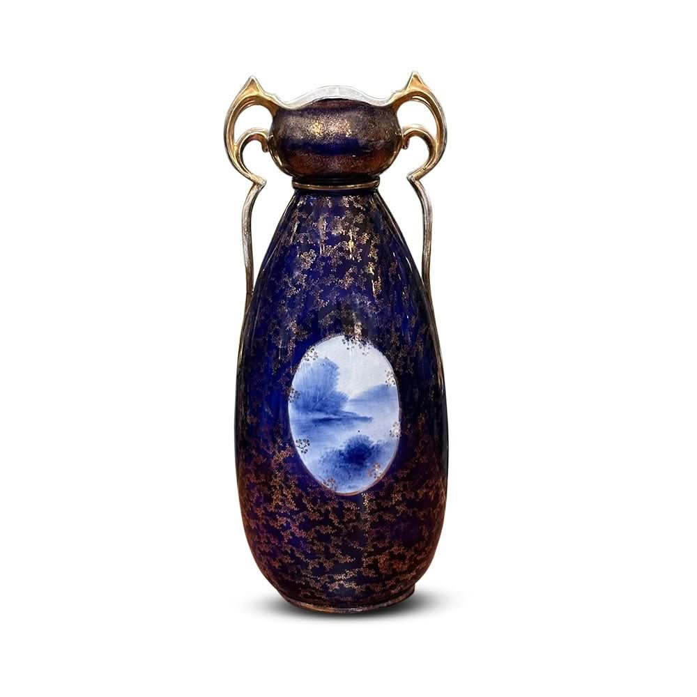 A lovely tall Remington vase featuring a rich blue glaze with gilt double handles and mottled gilding all over.