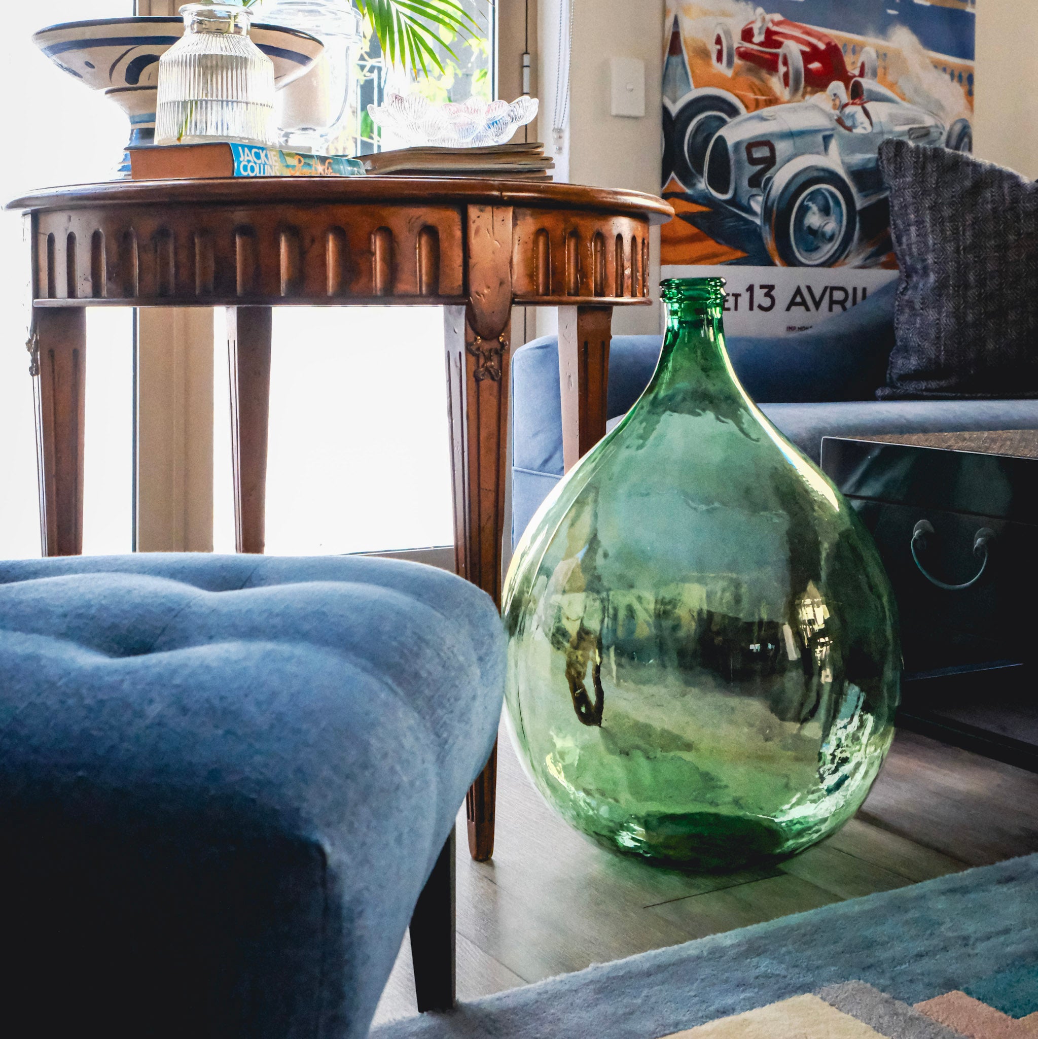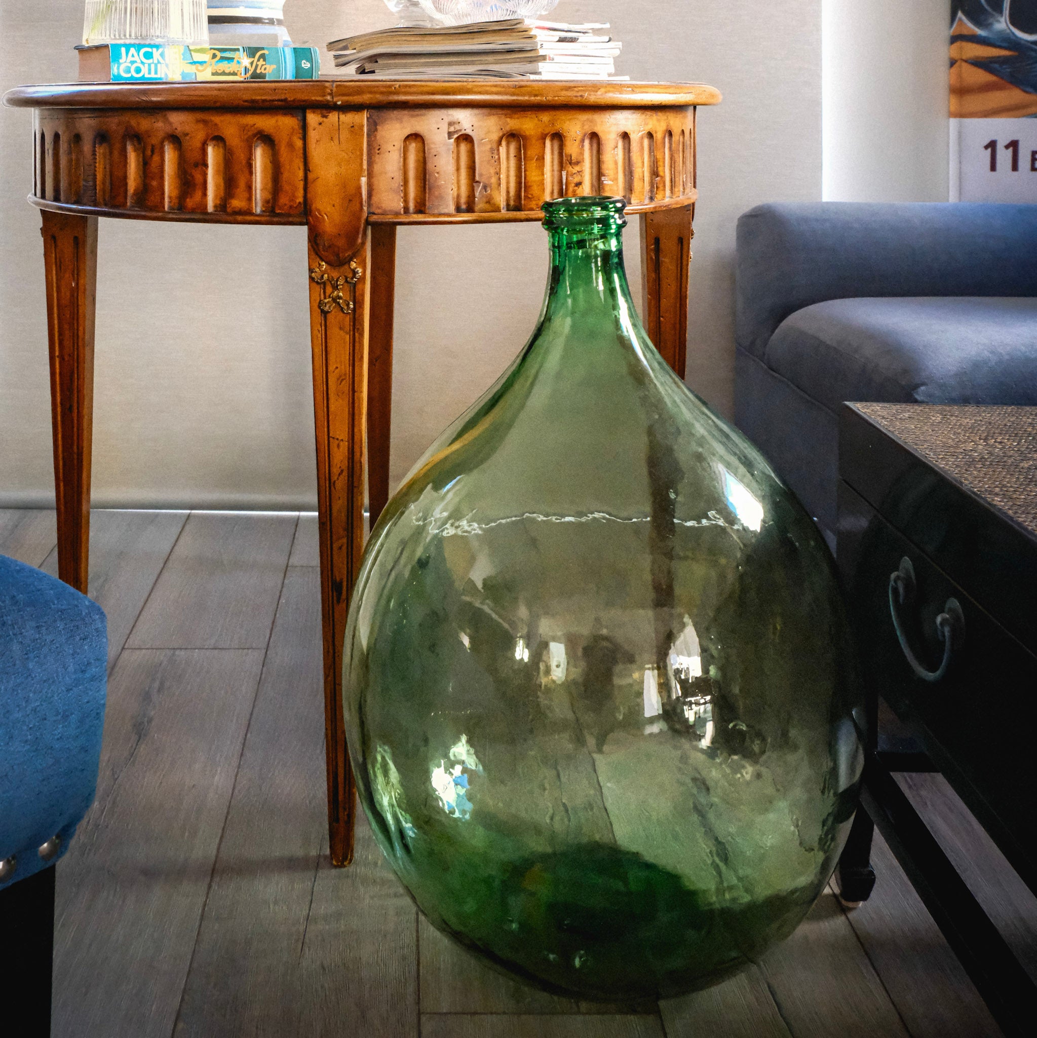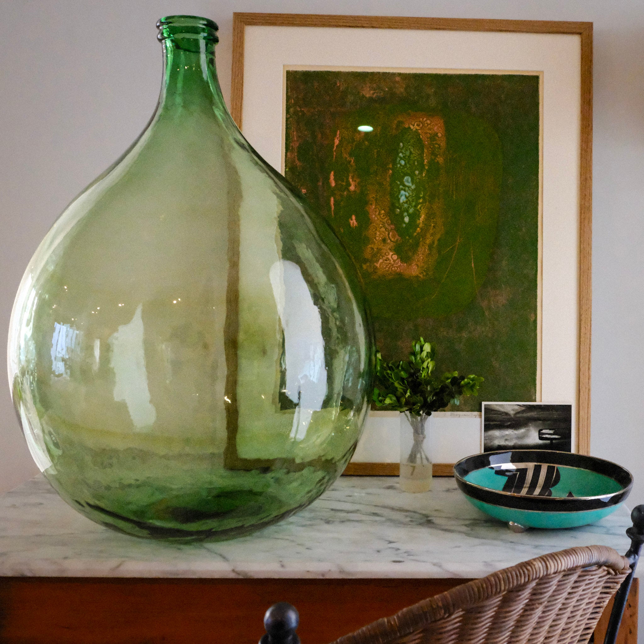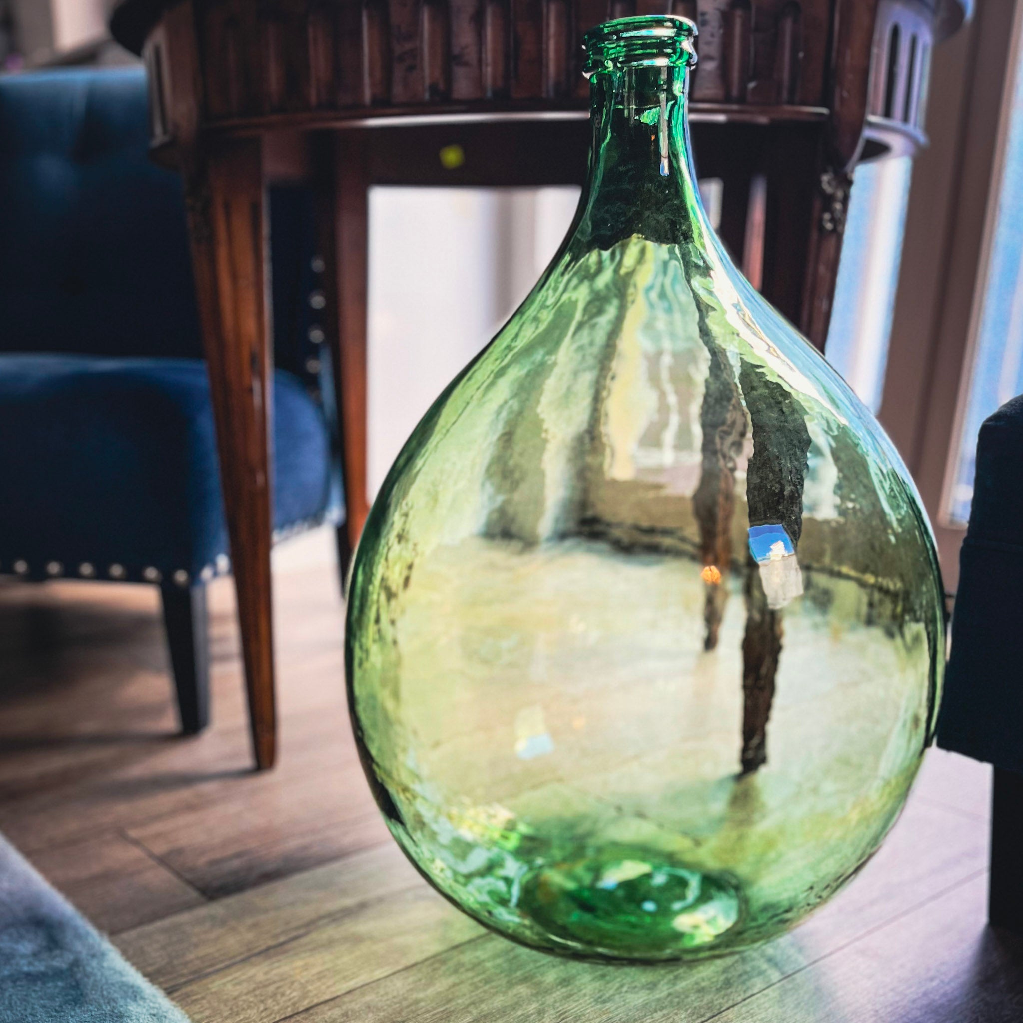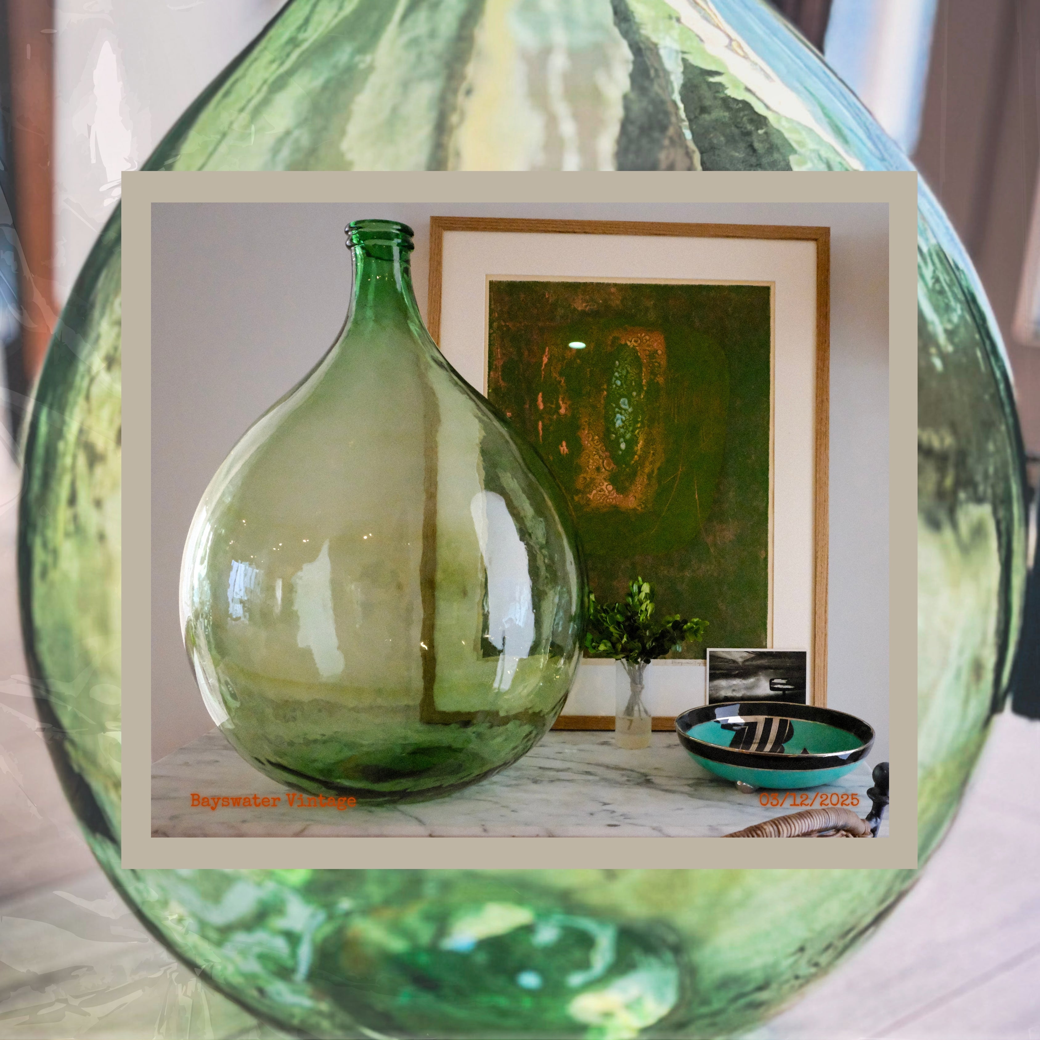 A beautiful vintage green glass demijohn bottle in rich emerald tones. Italian style with the organic forms and subtle imperfections that come with these glass objects.