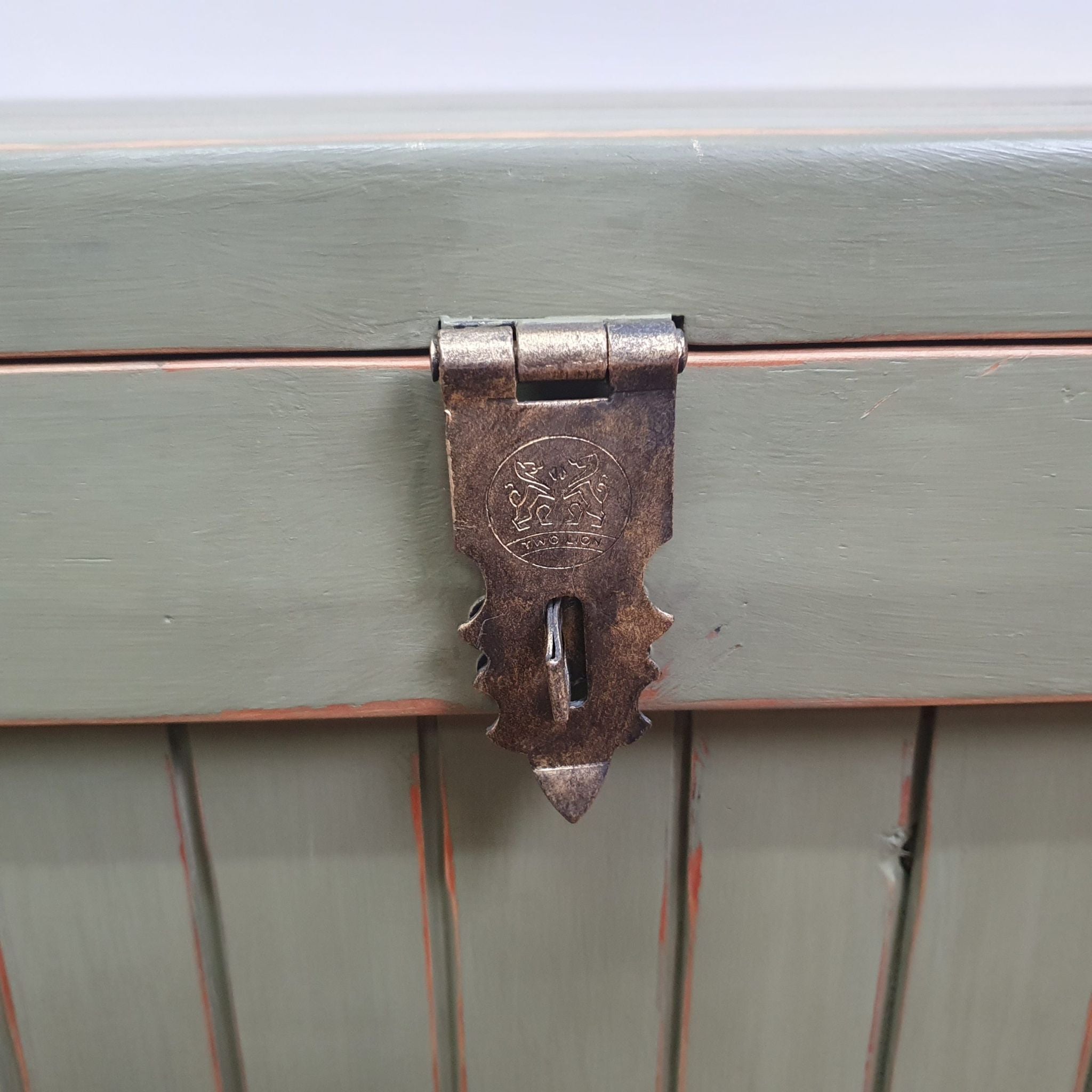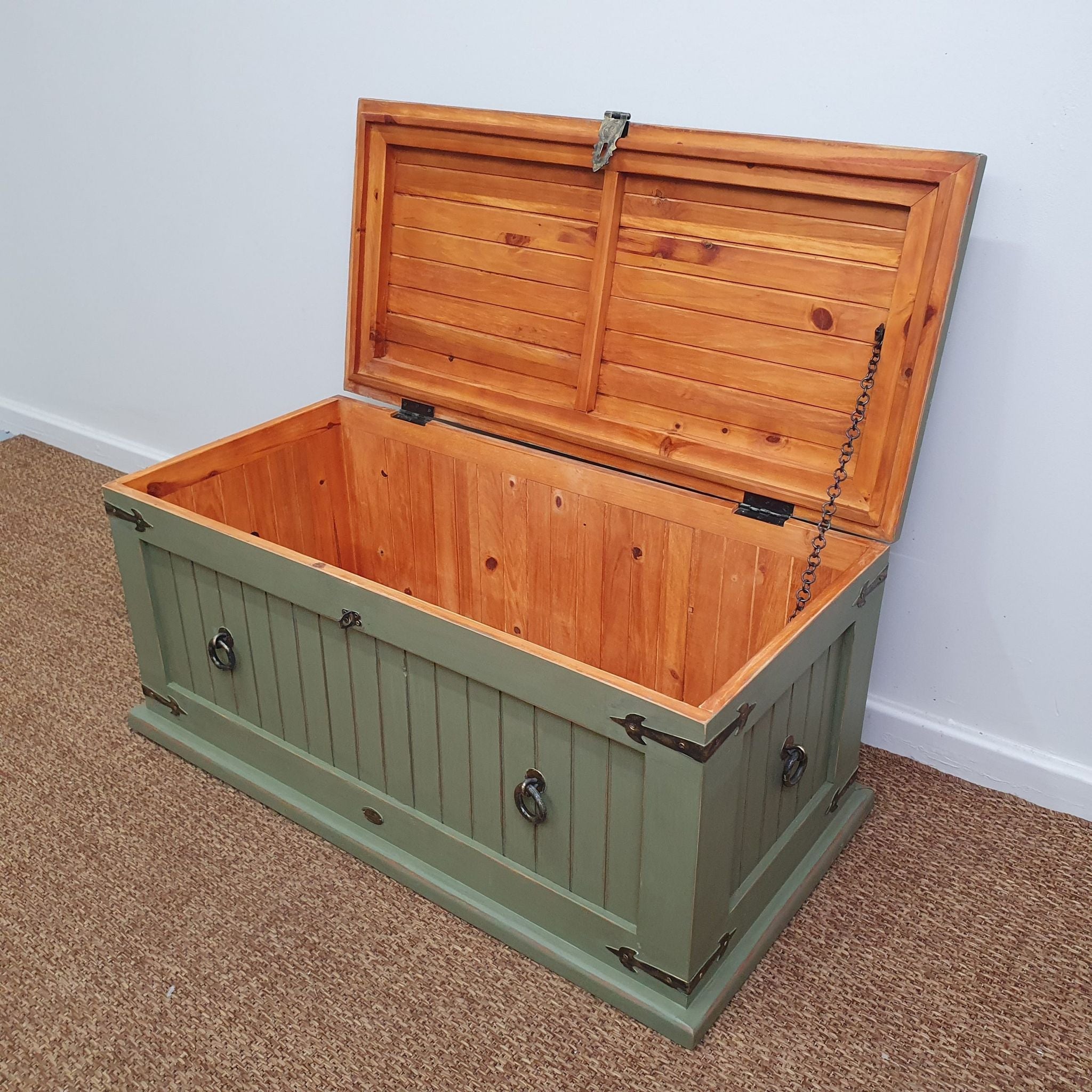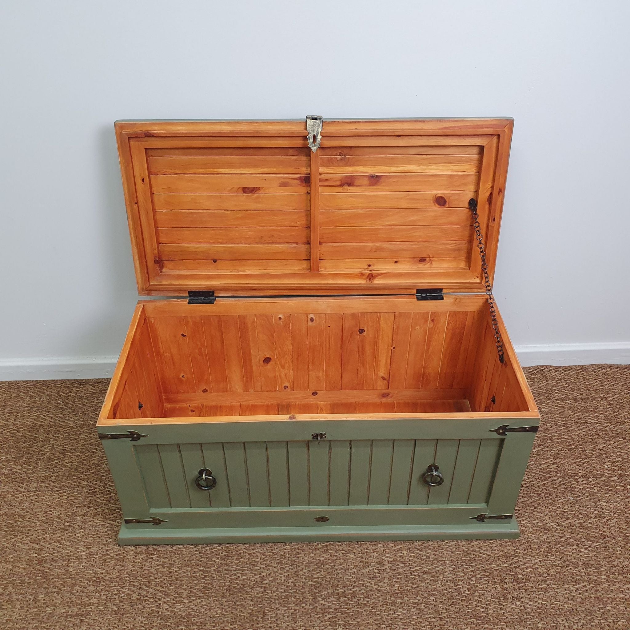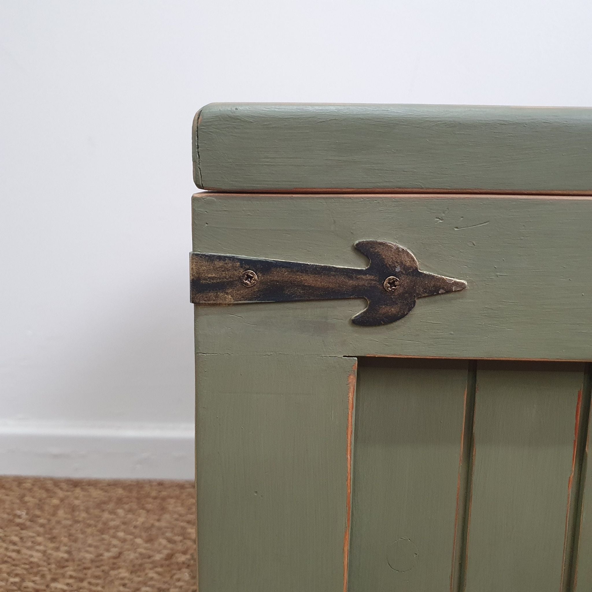 This solid timber storage trunk has been hand-painted in Annie Sloan’s Olive Chalk Paint and finished with Matt Lacquer for a smooth, refined look. Subtle golden highlights accent the details, adding warmth and character. Versatile in style, it works beautifully as a storage chest or blanket box.