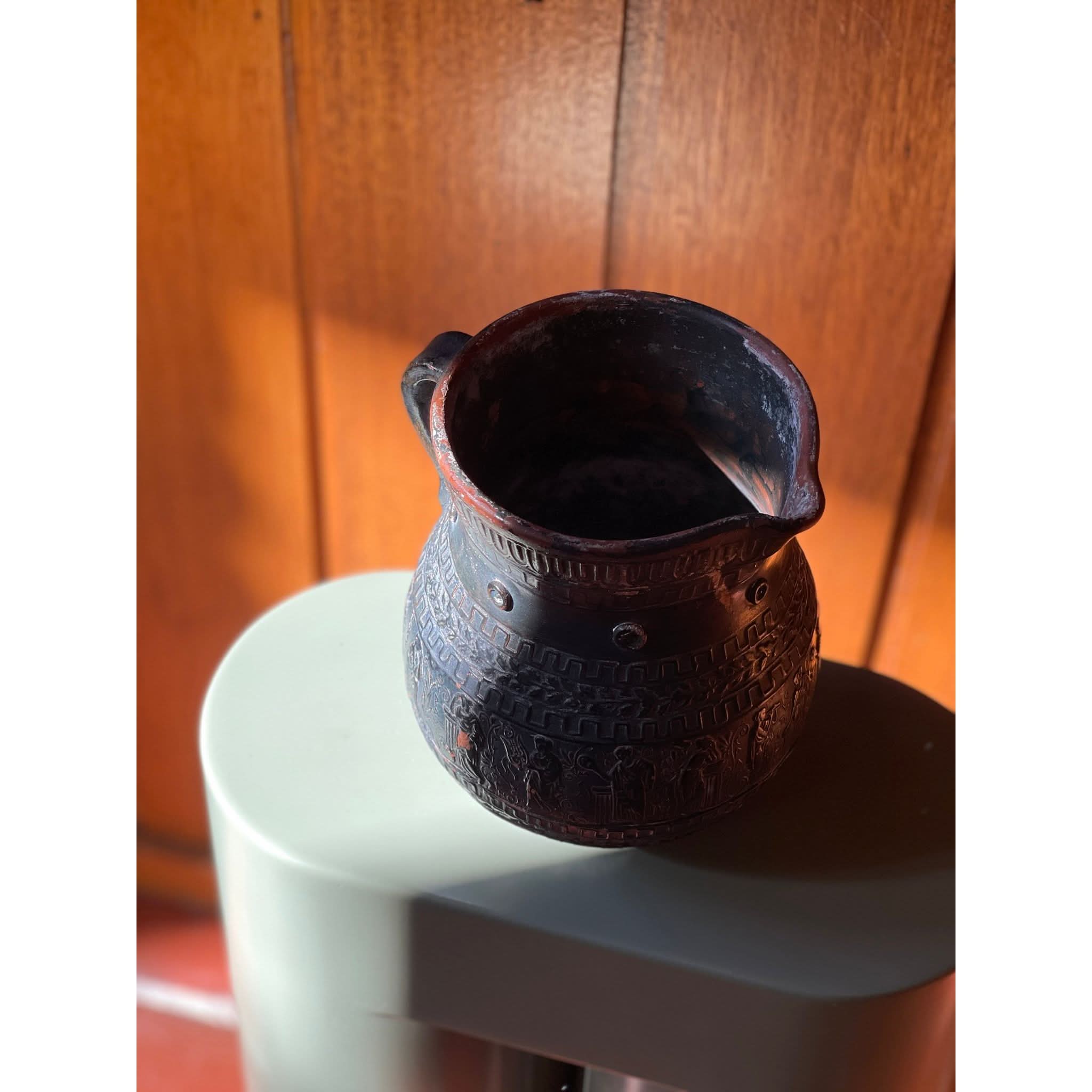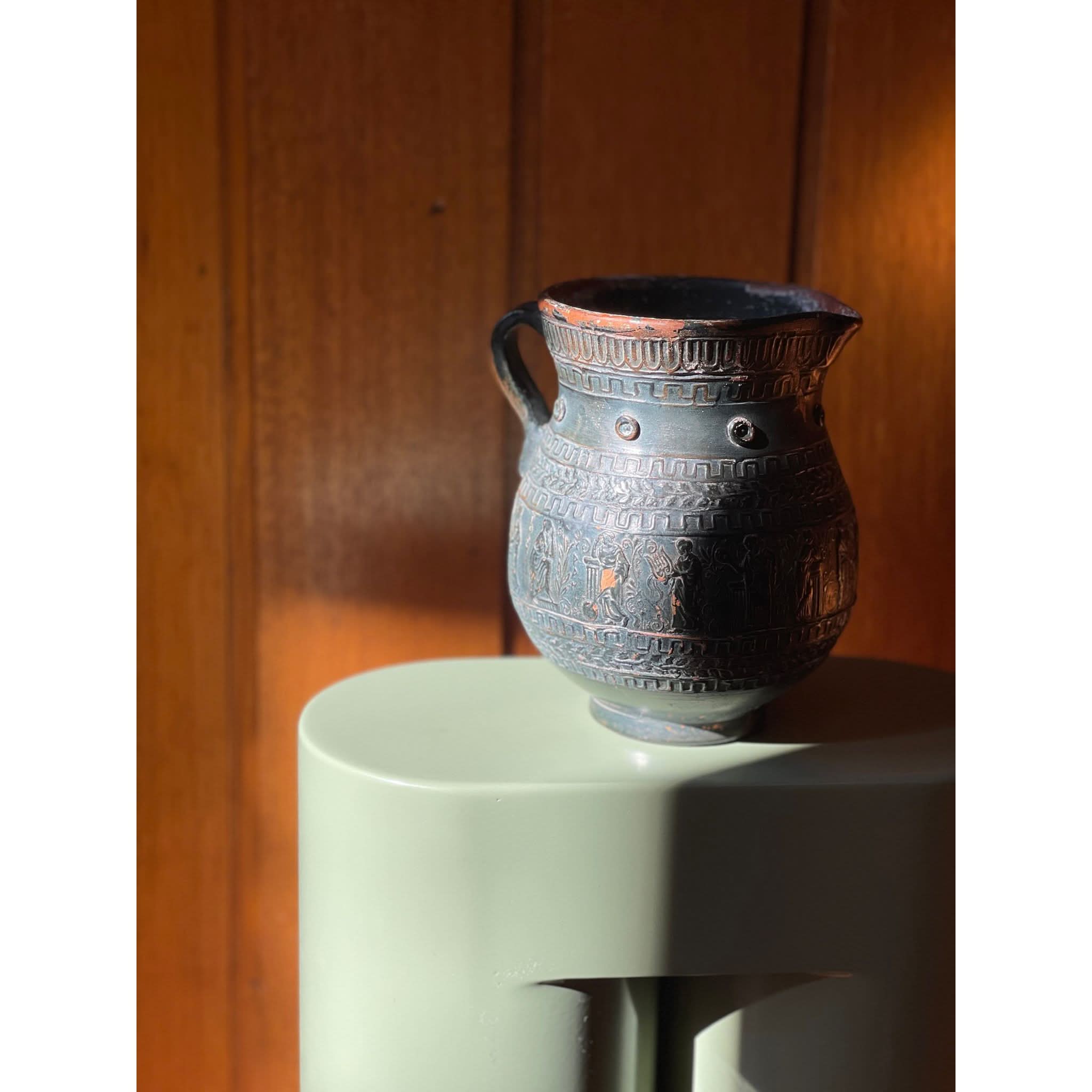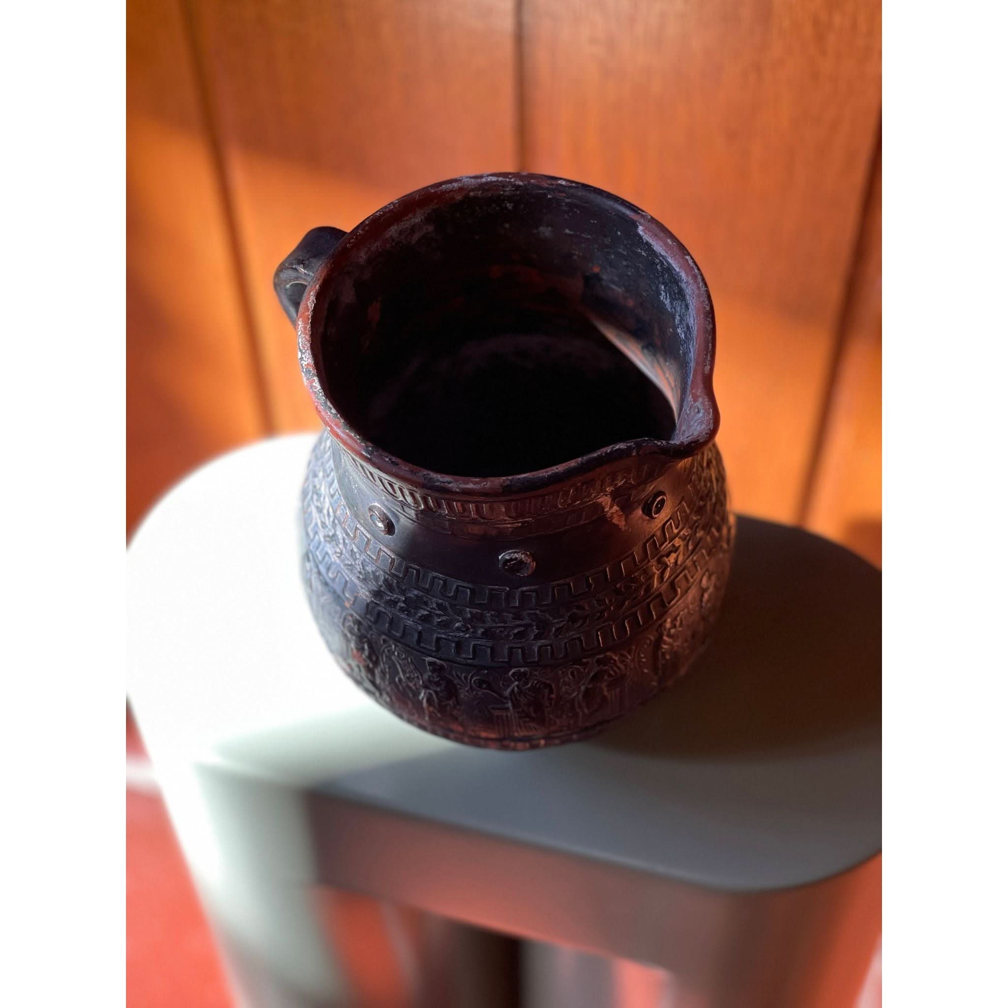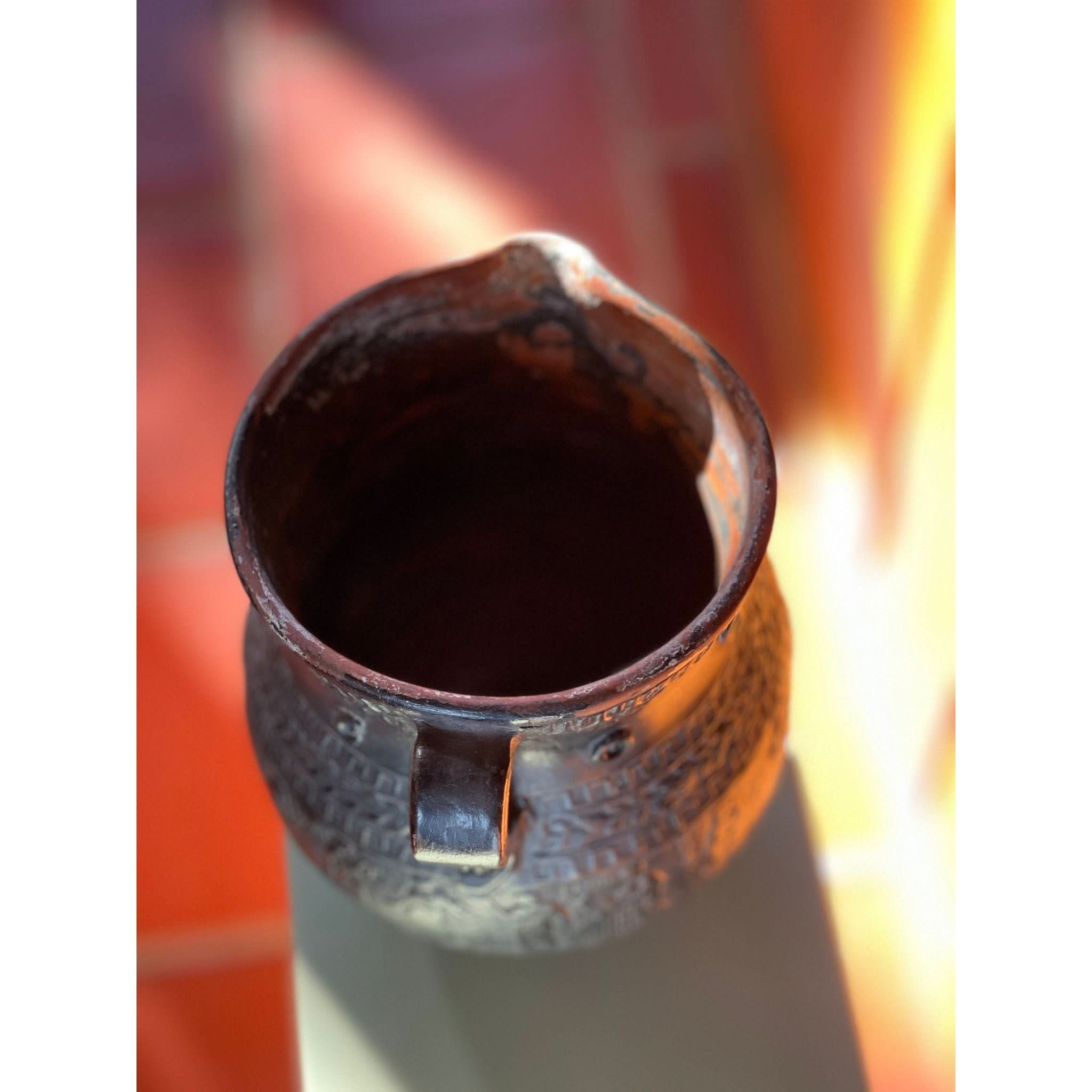 glazed grecian jug vase with the most beautiful intricate carvings. hand made in Greece.