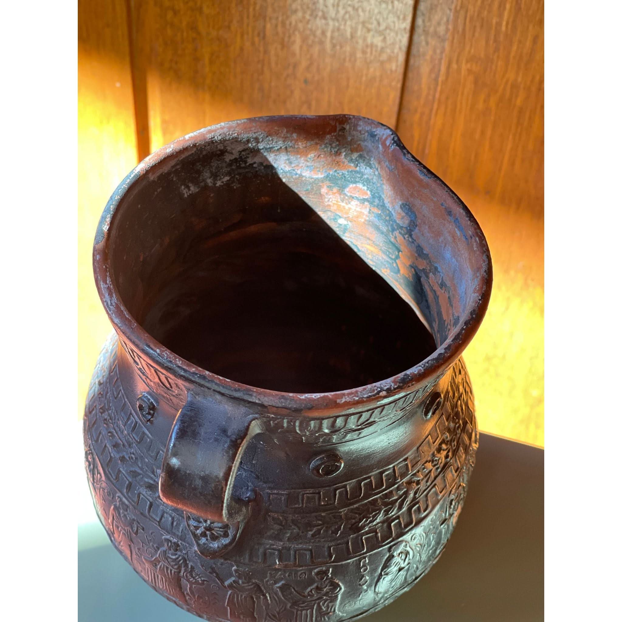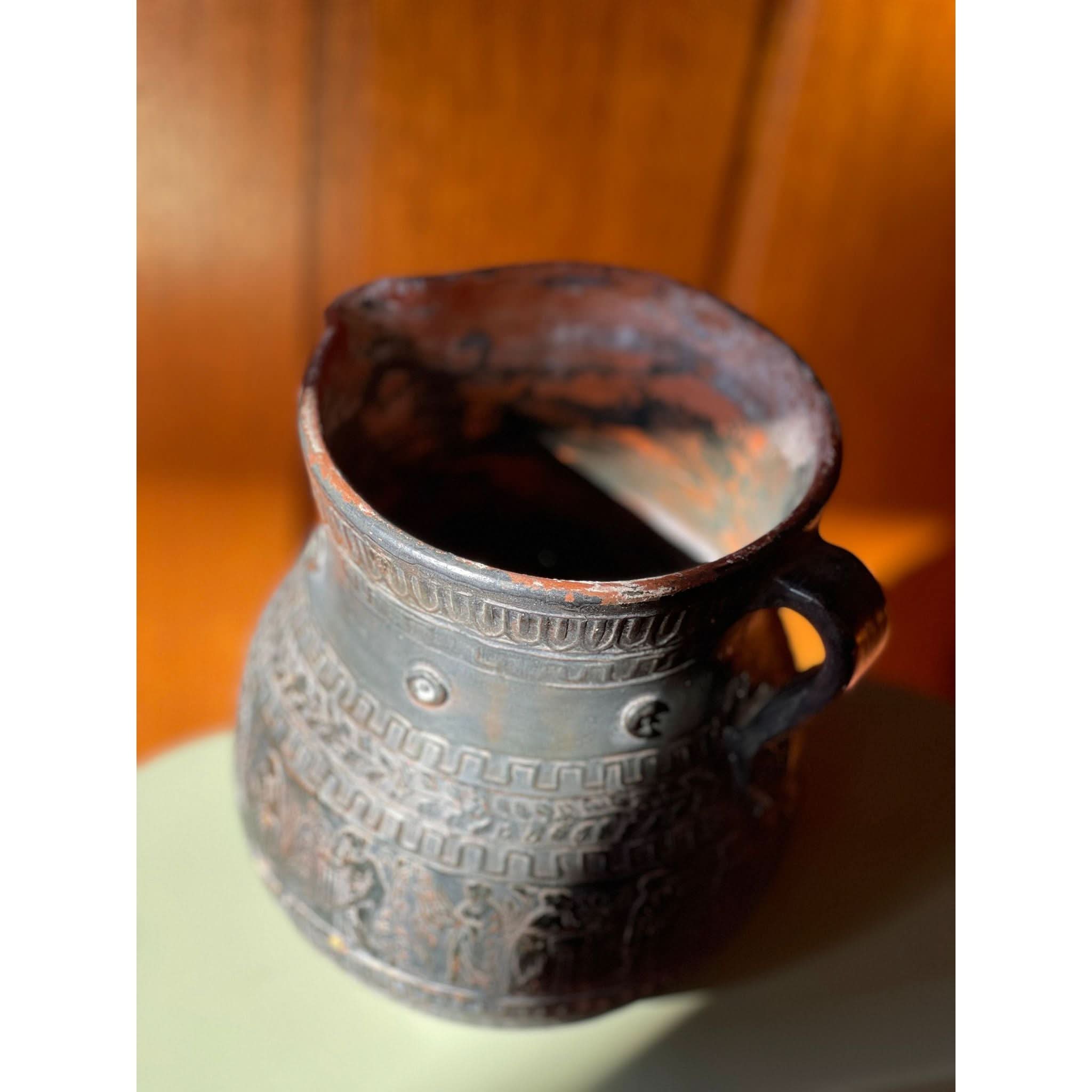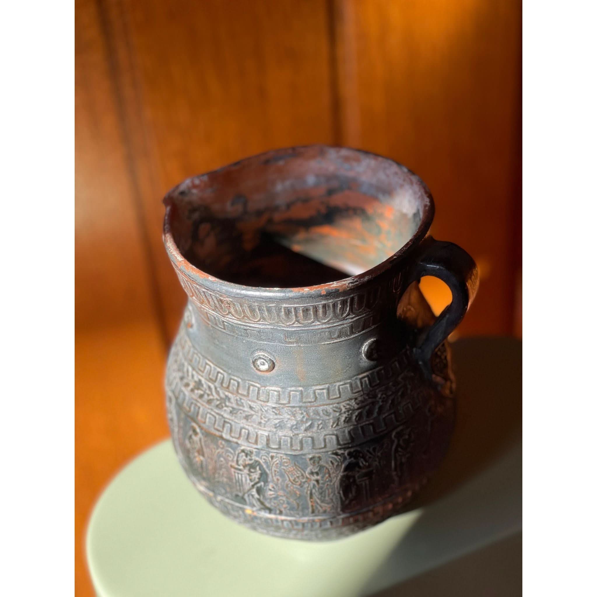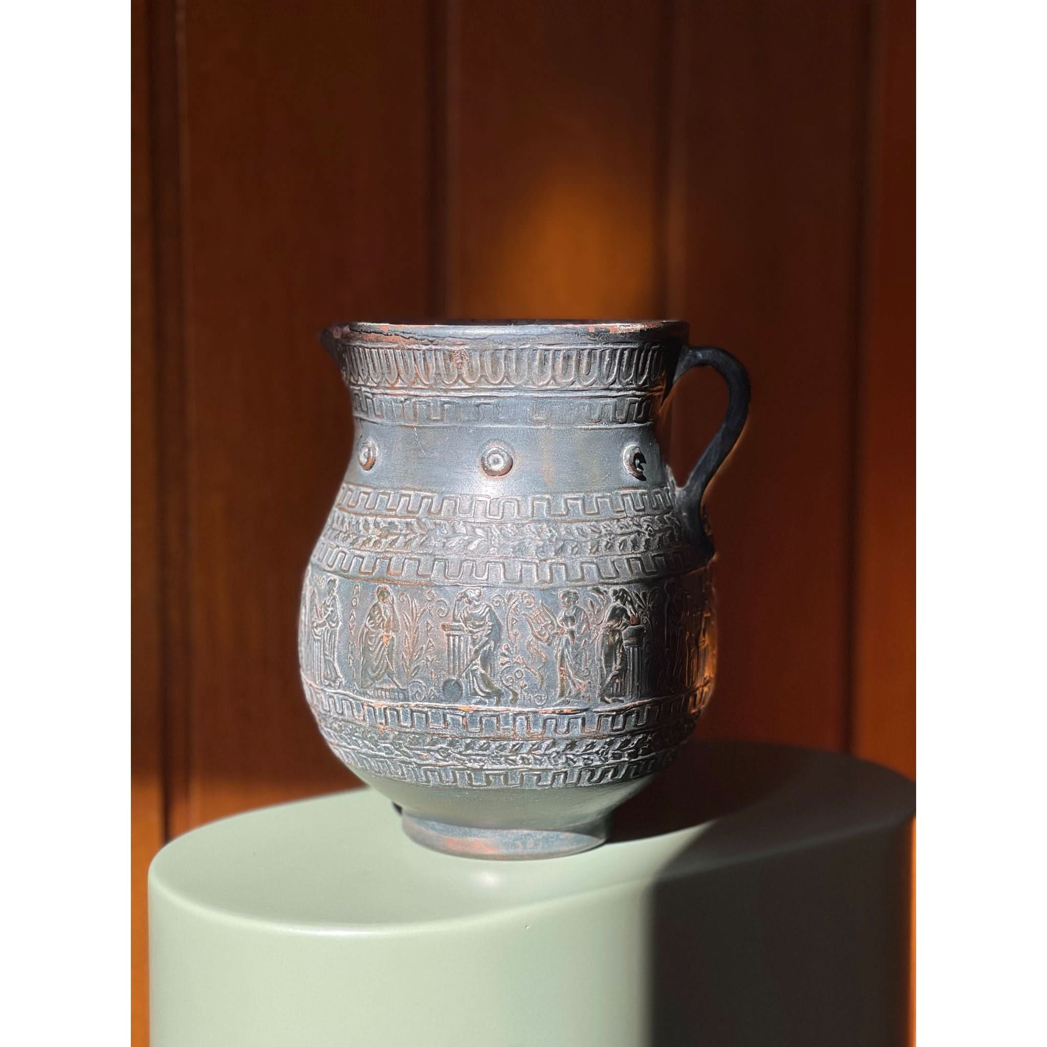 glazed grecian jug vase with the most beautiful intricate carvings. hand made in Greece.