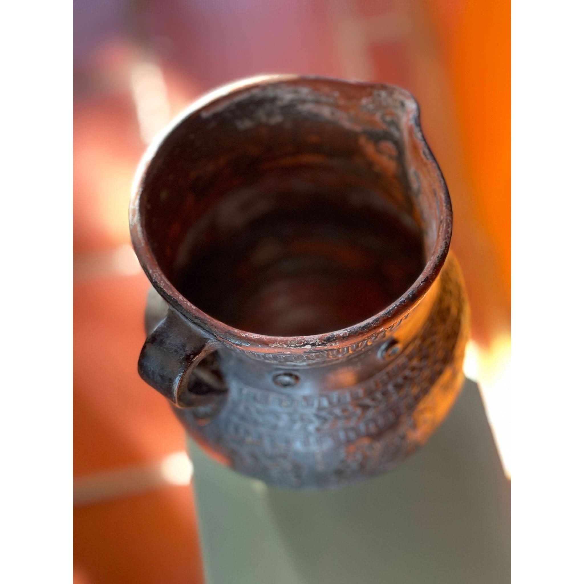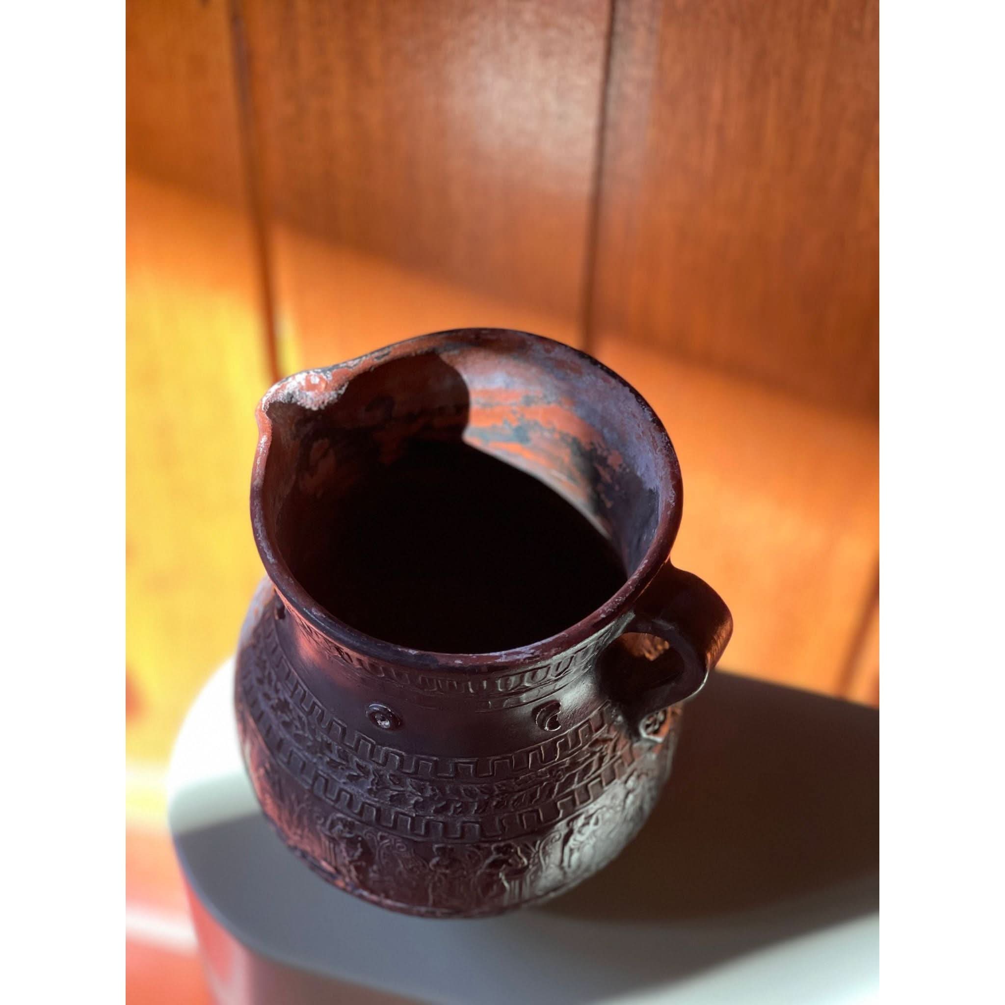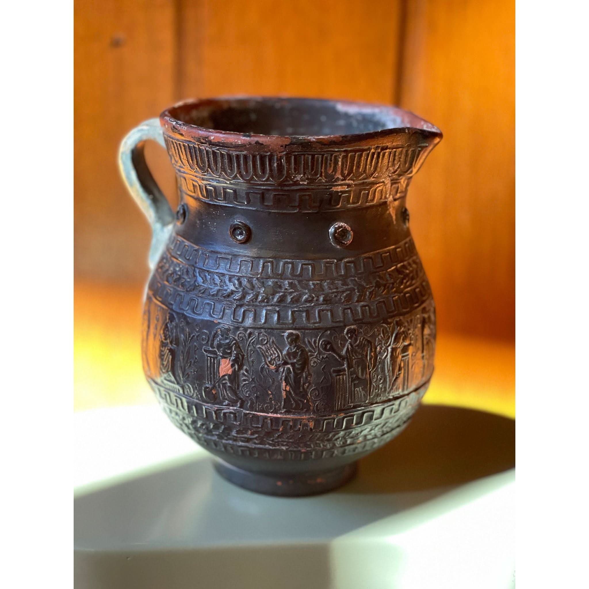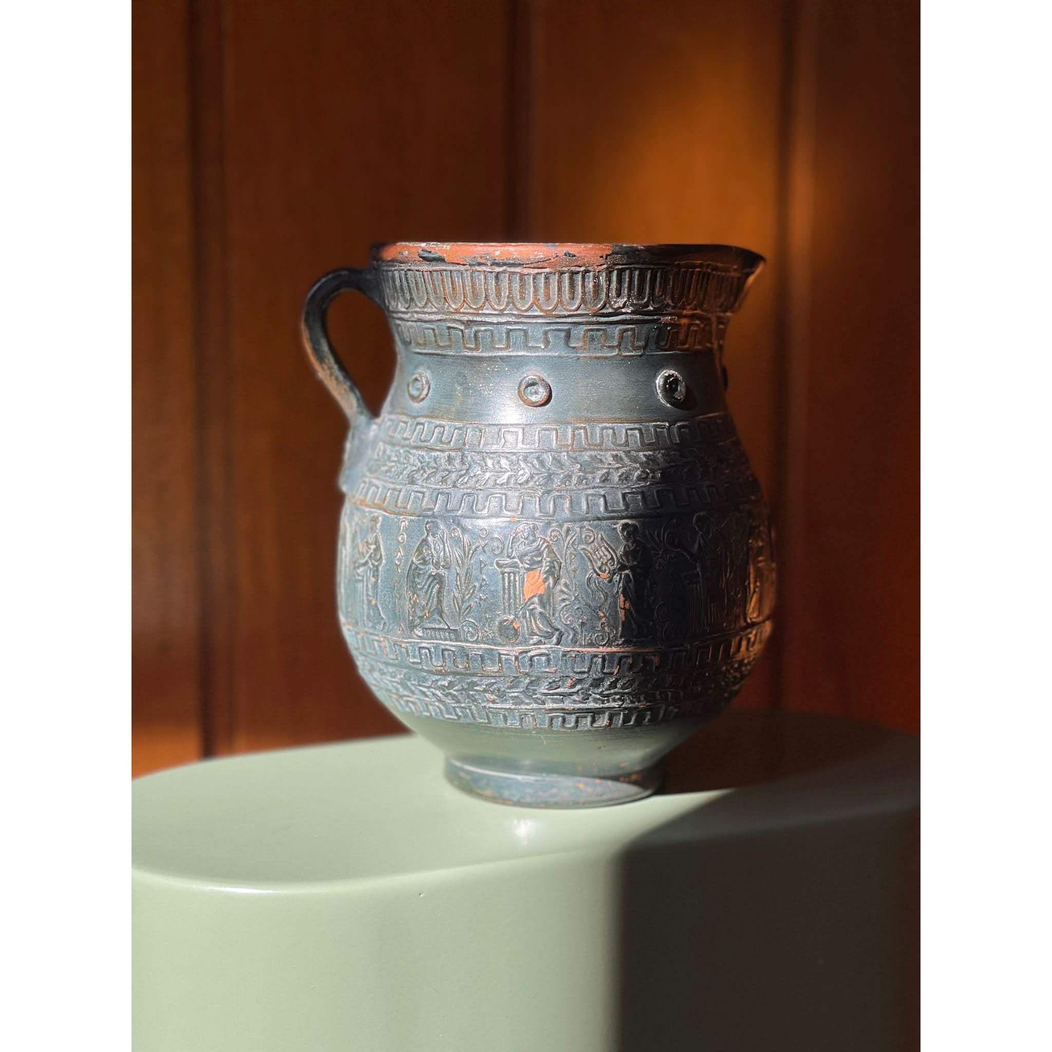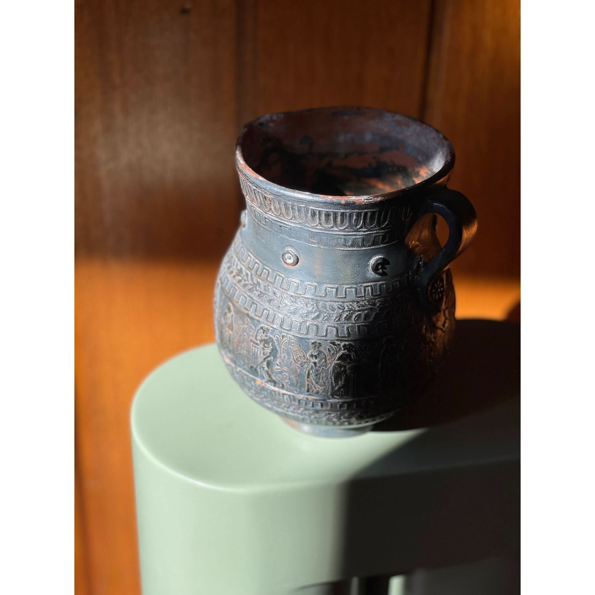 glazed grecian jug vase with the most beautiful intricate carvings. hand made in Greece.