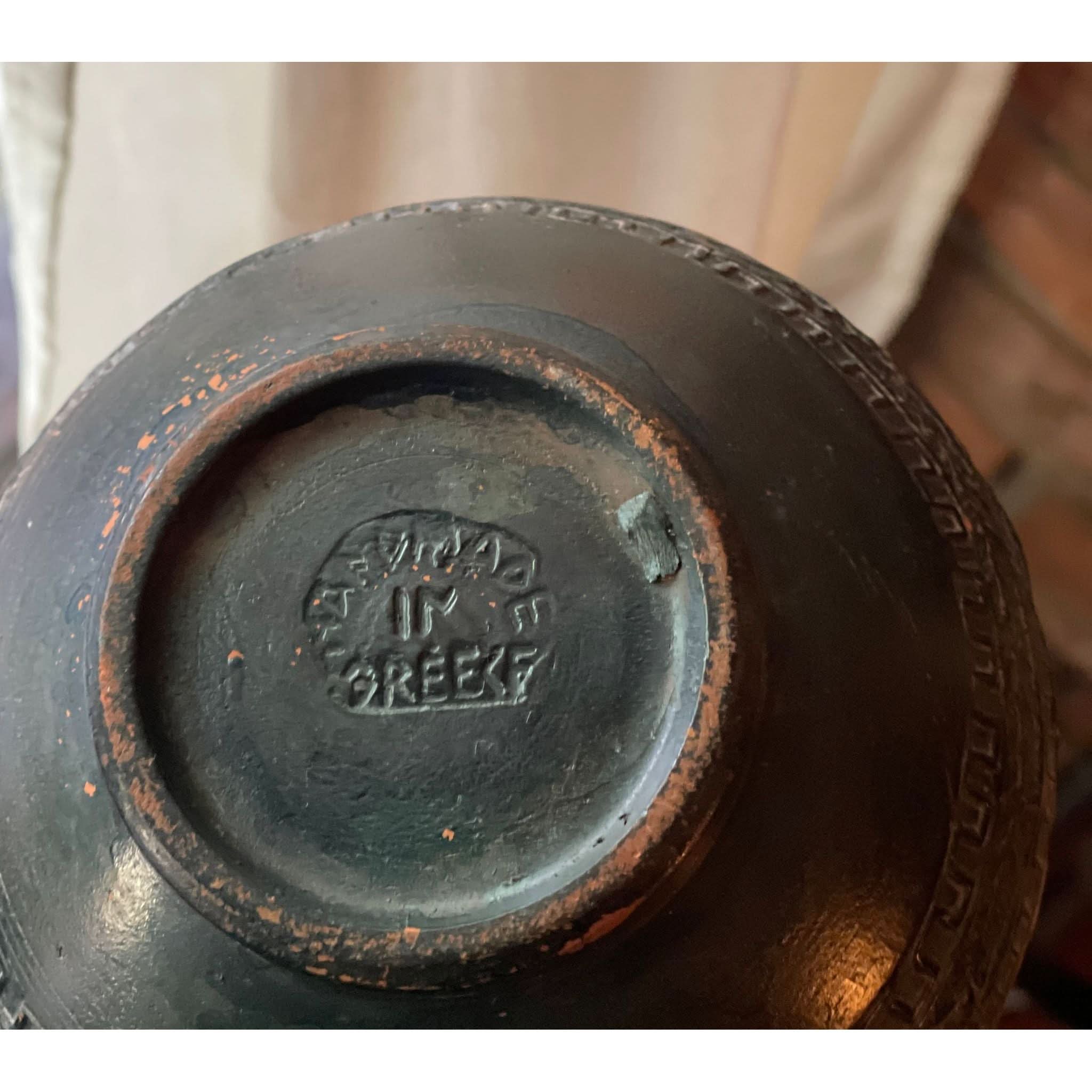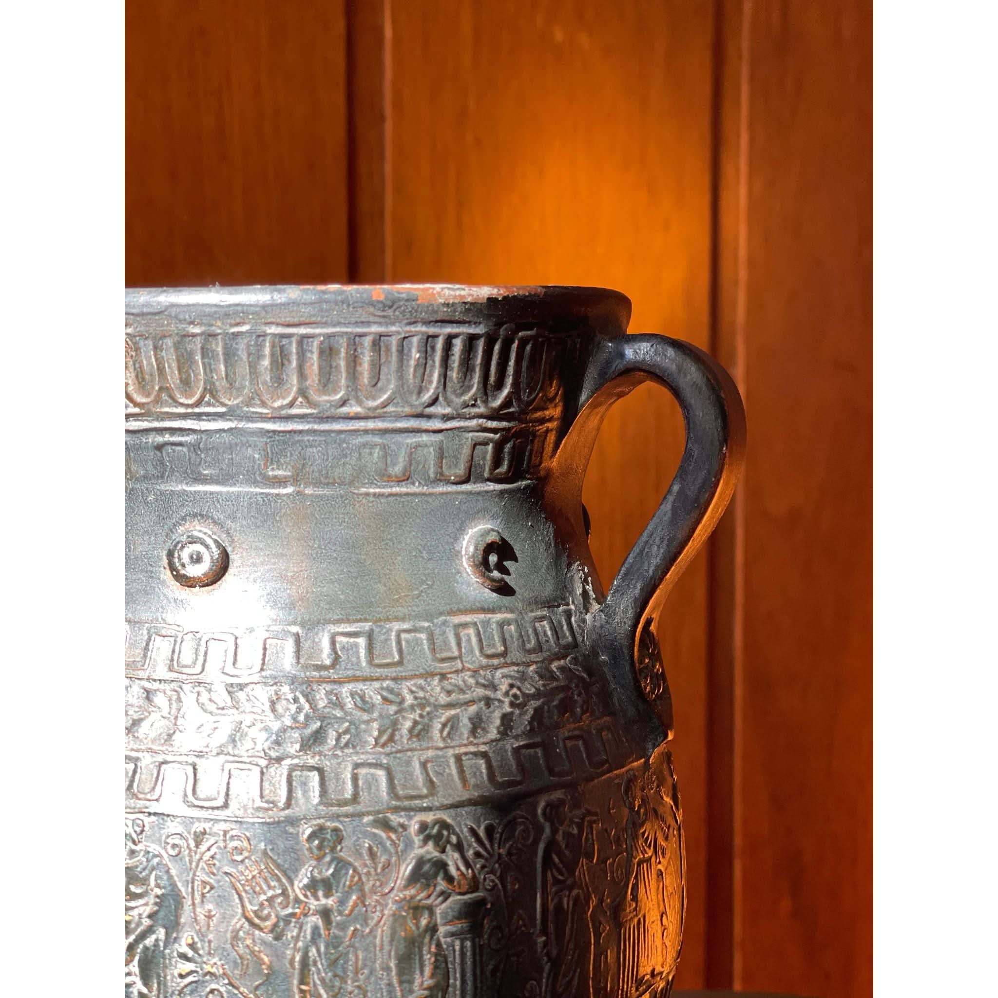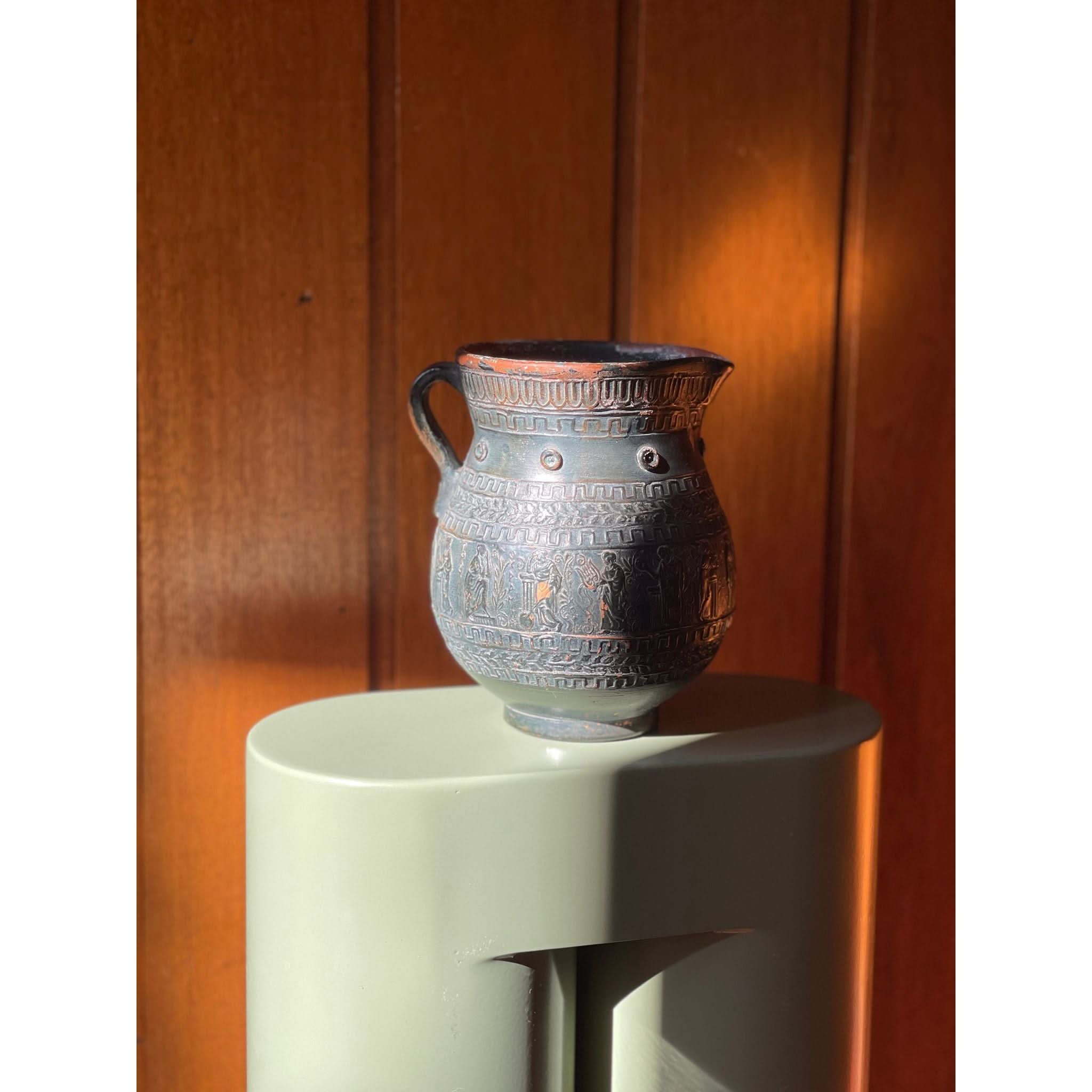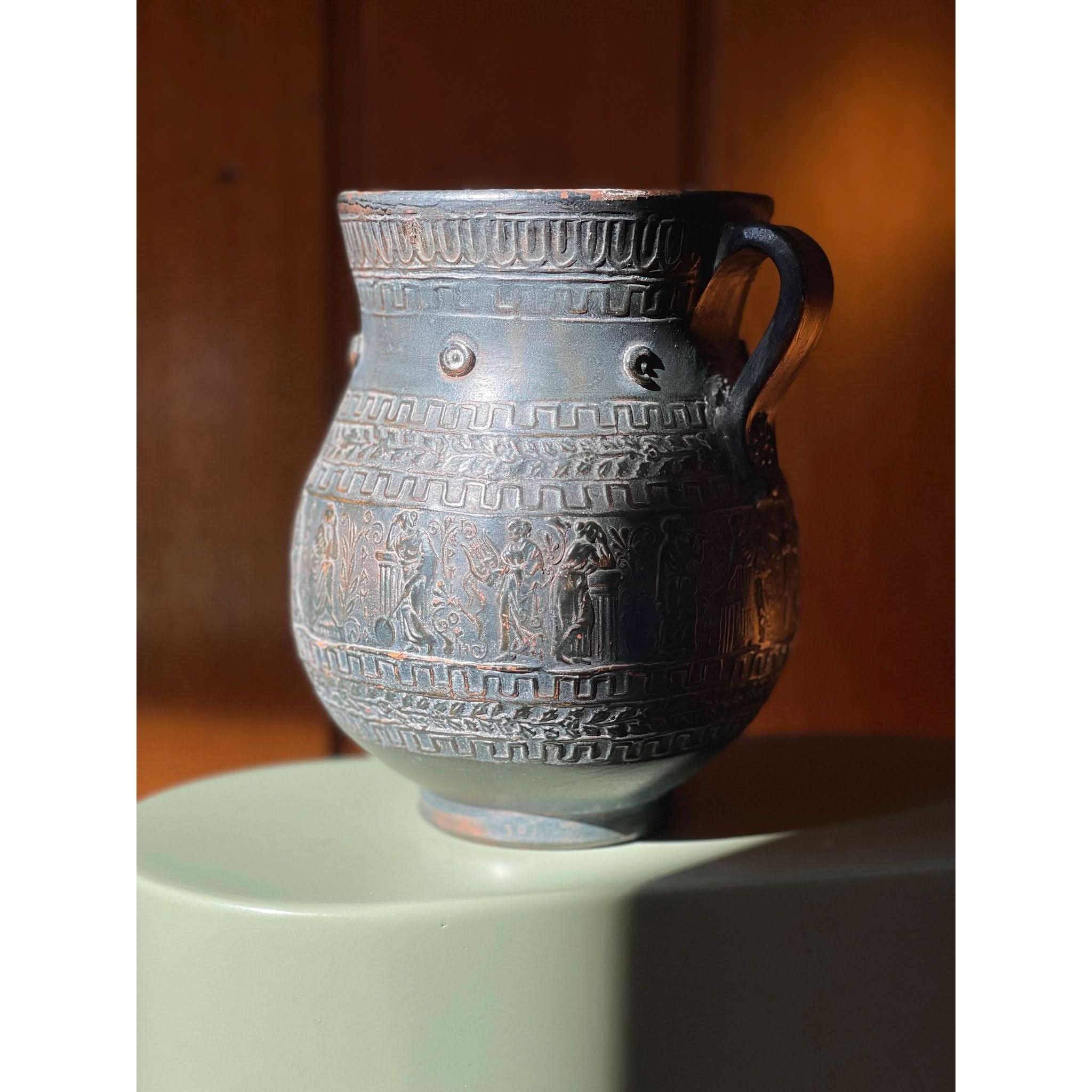 glazed grecian jug vase with the most beautiful intricate carvings. hand made in Greece.