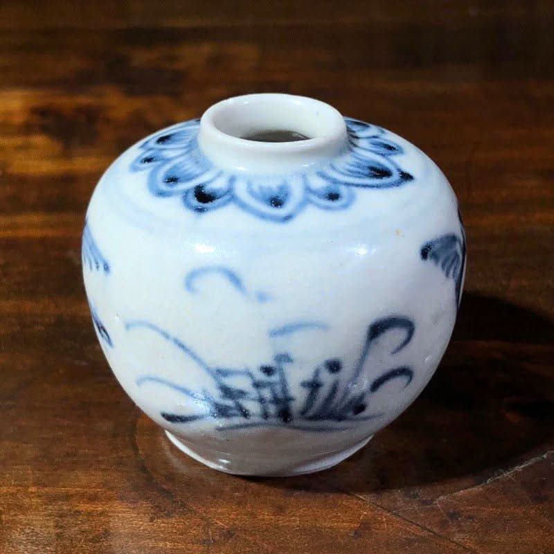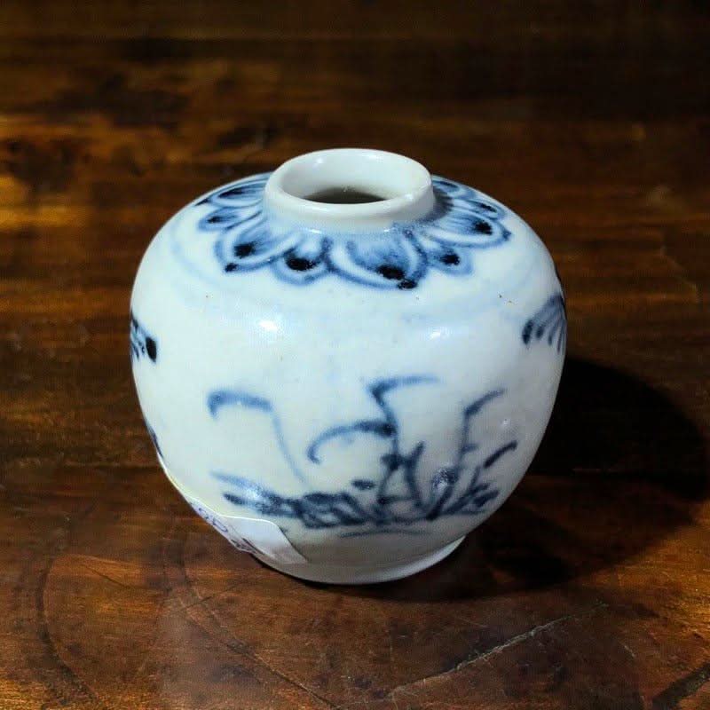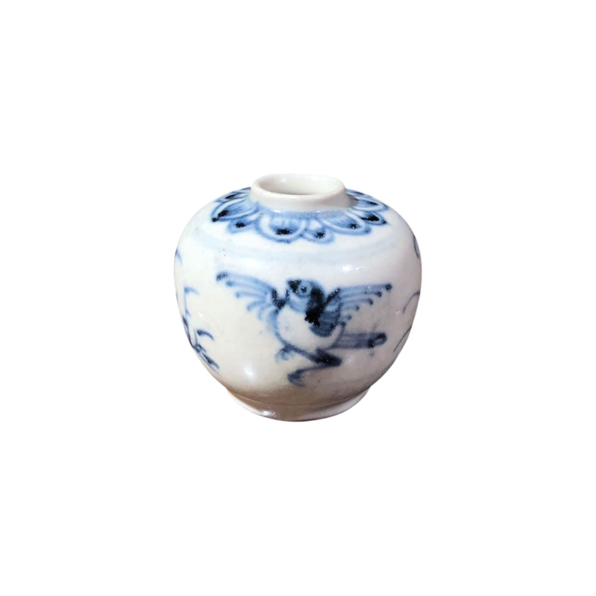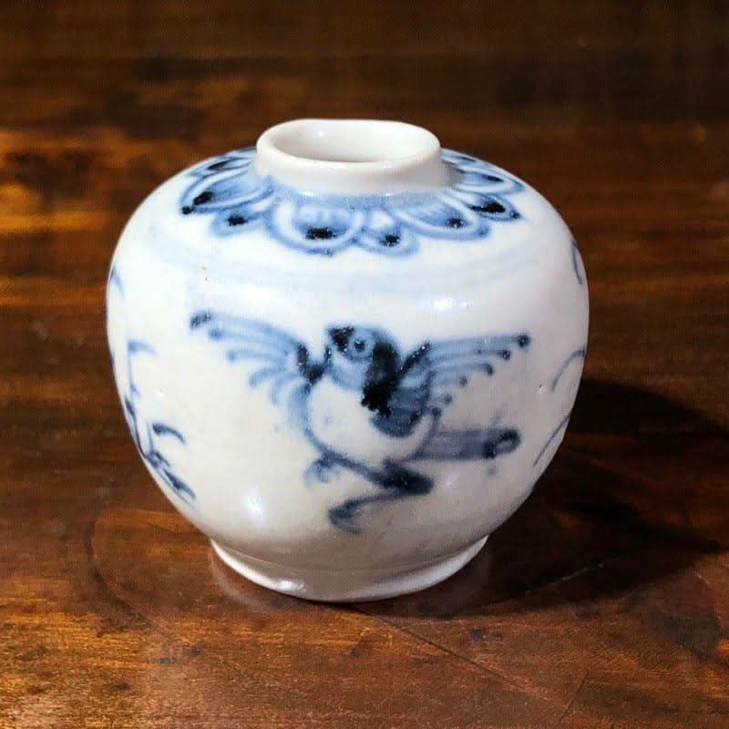 Blue and white pottery jarlet, the neck painted with lotus petal collar, the body with lively 'chích chòe' birds and grasses. Vietnam, made at Chu Dau, latter 15th Century. Recovered from the Hoi An shipwreck in 1999