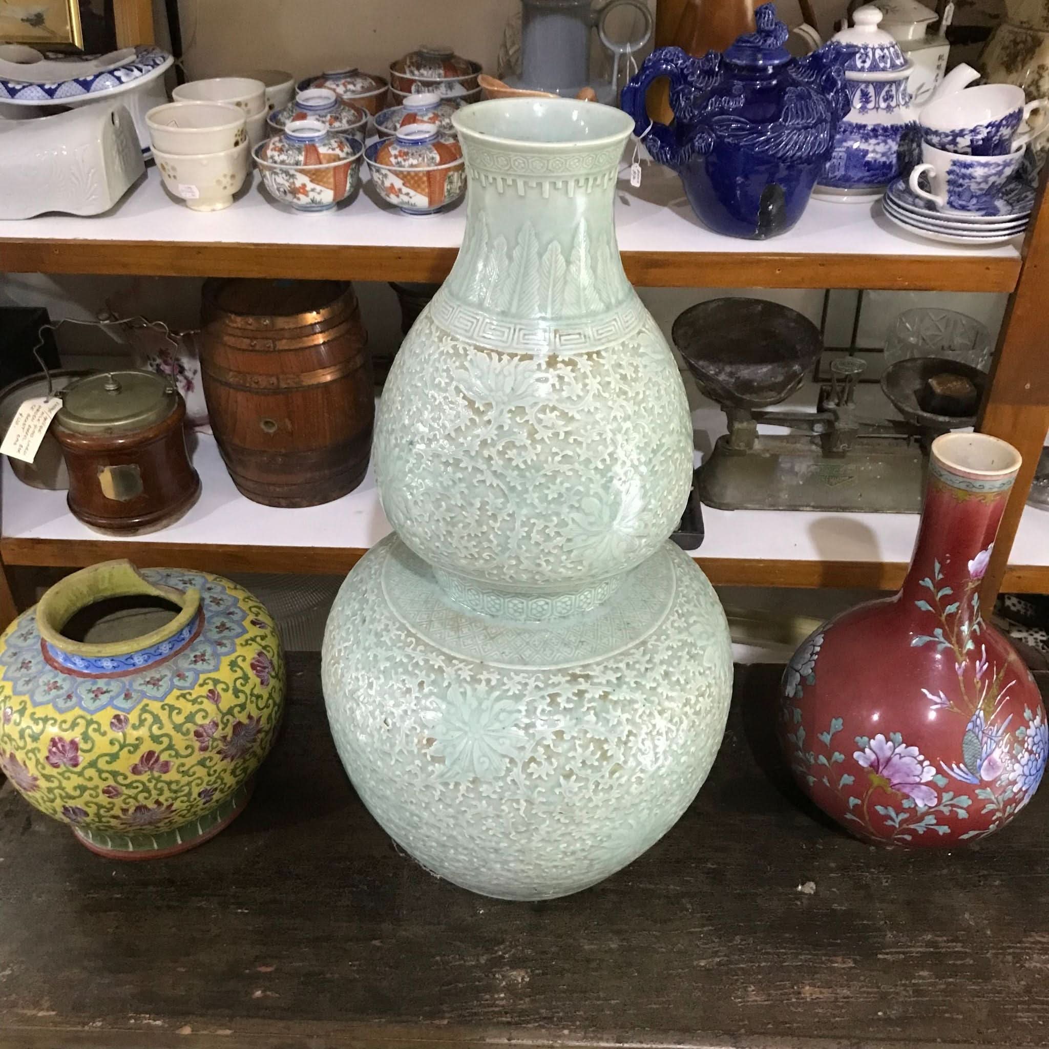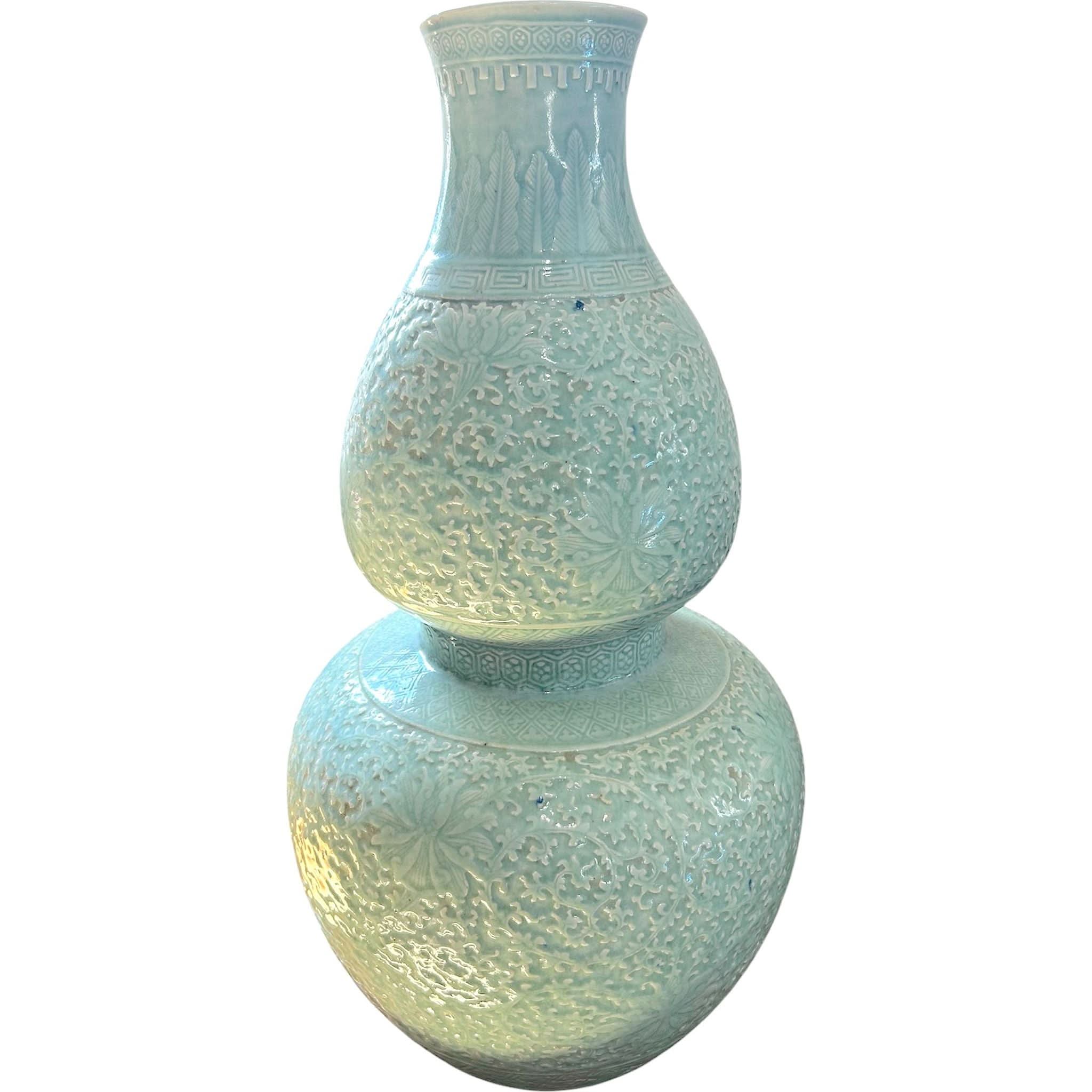 Large Chinese Celadon double gourd vase. Late 19th/ 20th Century. Moulded relief sections with scrolling lotus patterning. Slightly flaring neck with upright leaves above keyfret band. No makers mark in base.