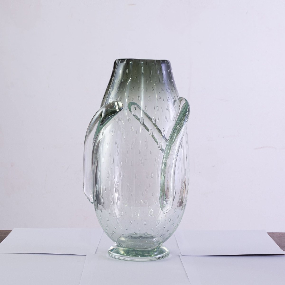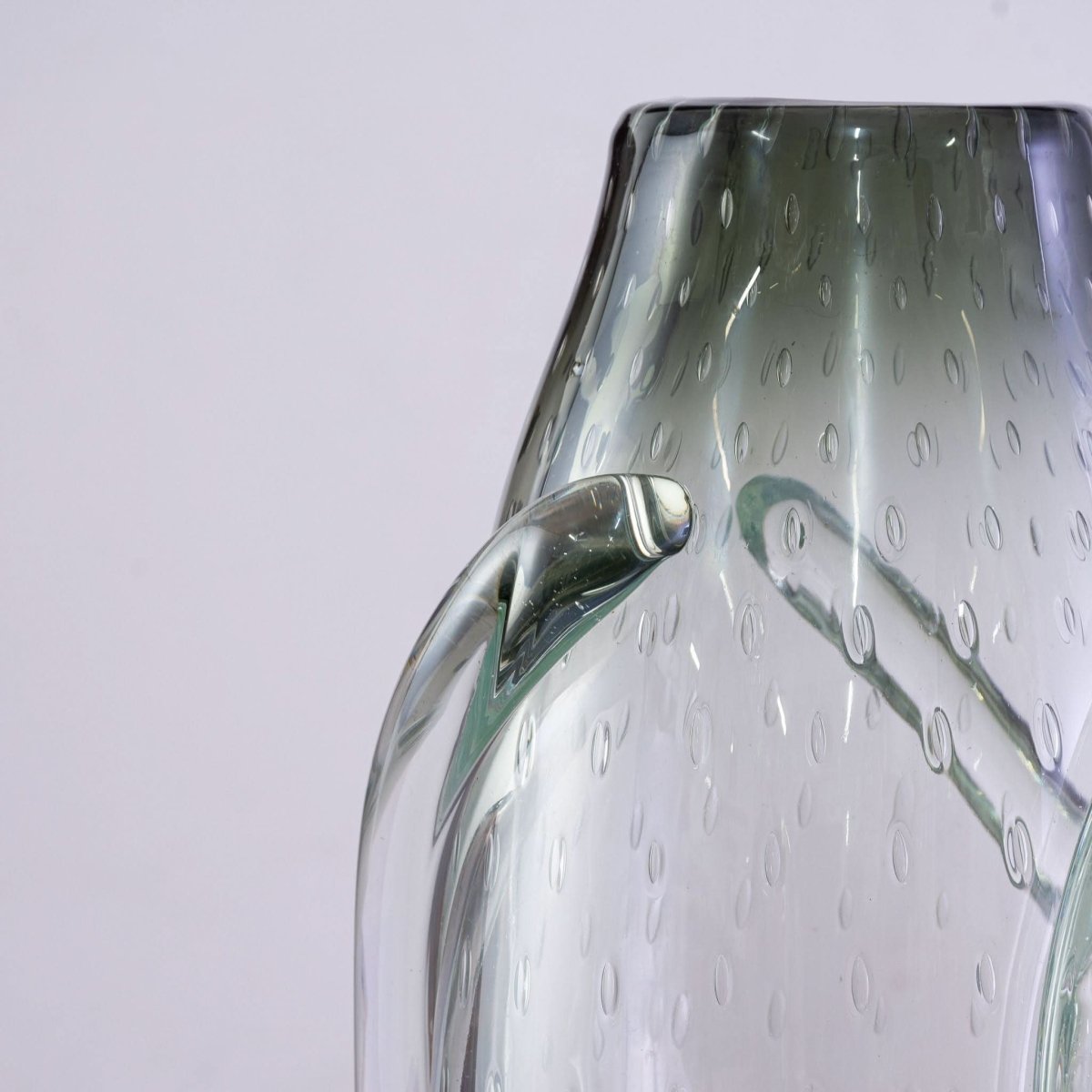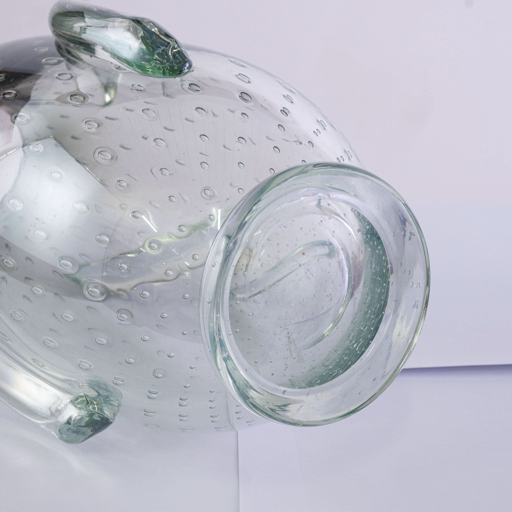of ovoid form, in green and clear glass with bullicante technique (bubbless) throughout and applied strap work