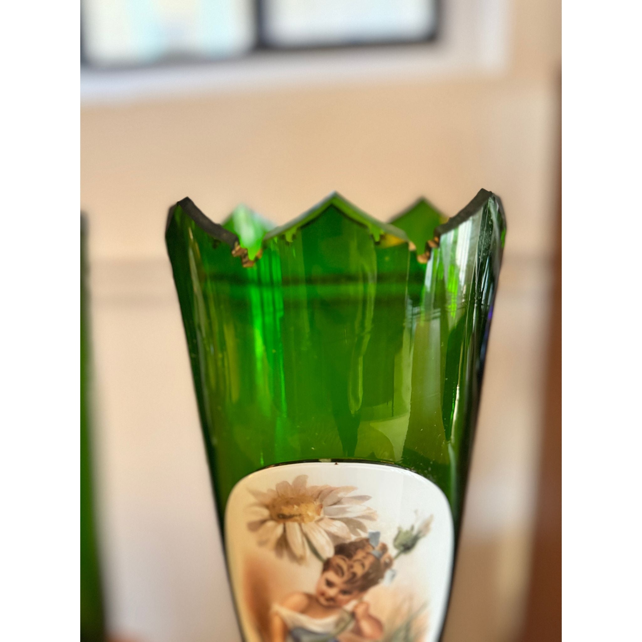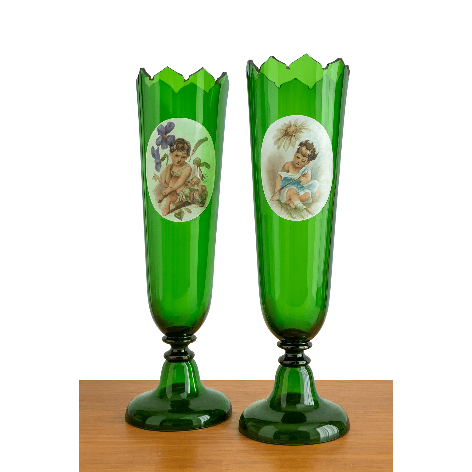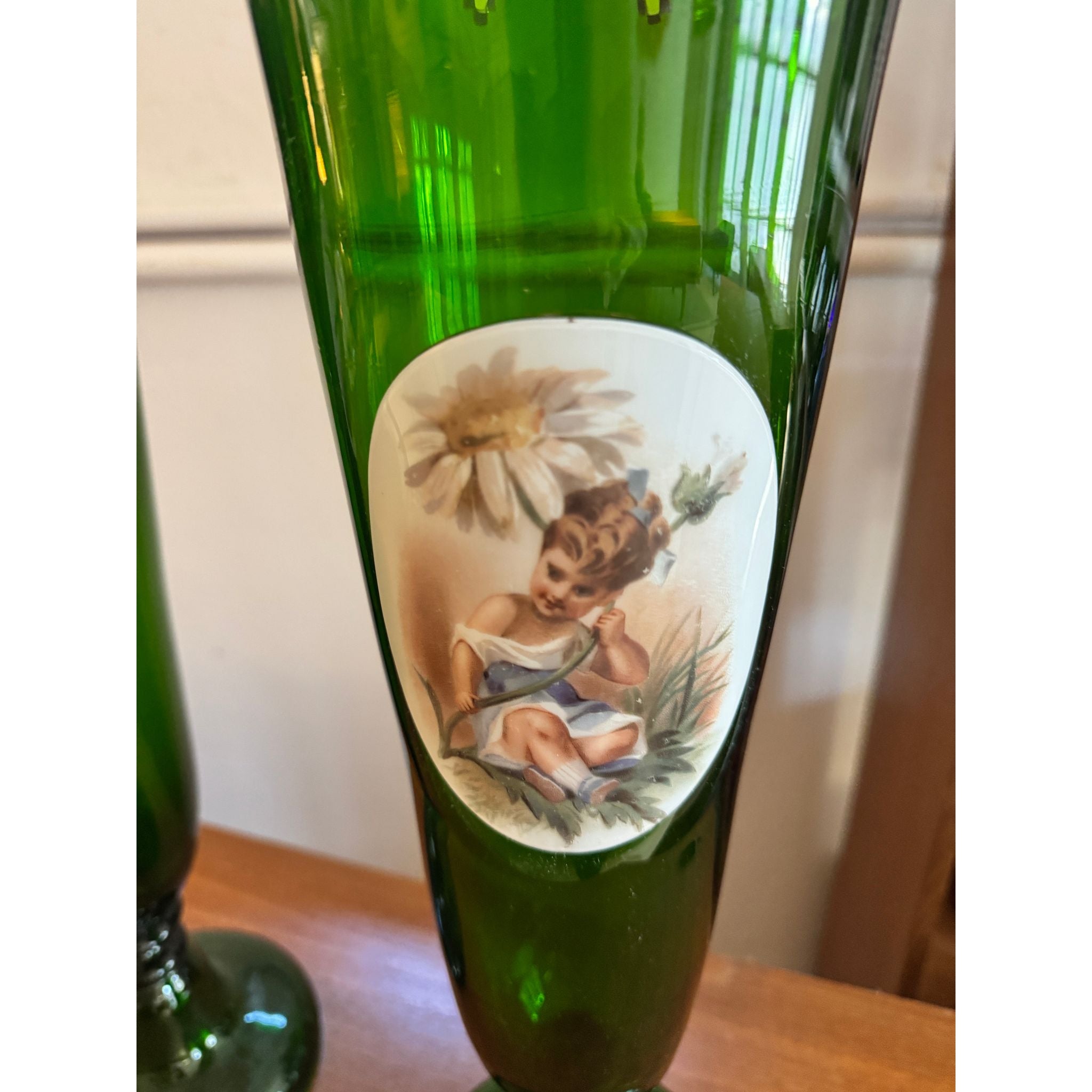 •Crafted in rich emerald green glass, each vase stands an impressive 46 cm tall.
