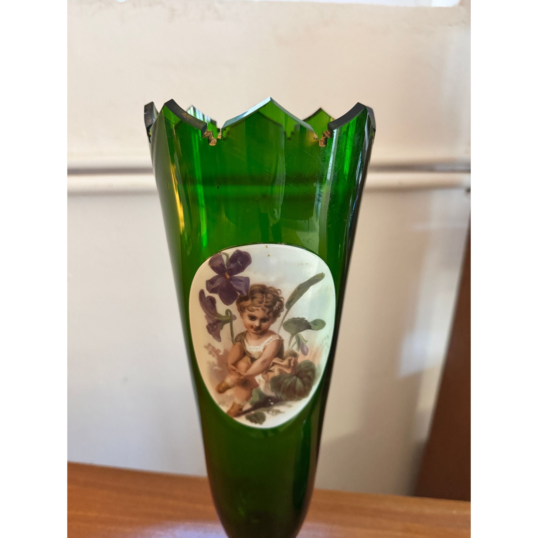 •Hand-applied medallions adorn the front of each vase, depicting romantic allegorical scenes of cherubic children surrounded by flowers, executed with delicate detail and soft colour.