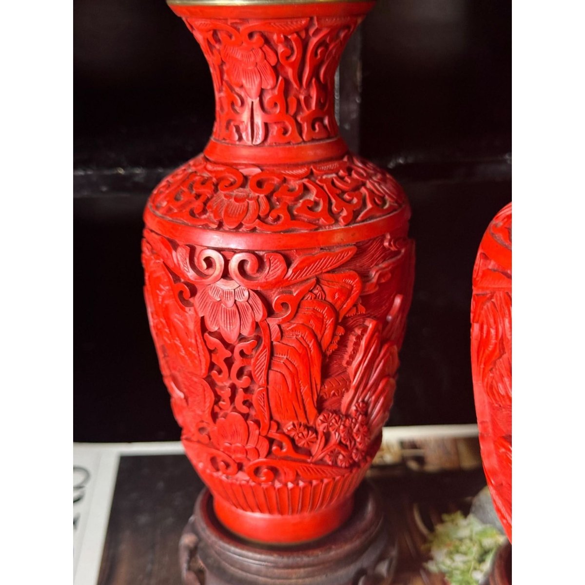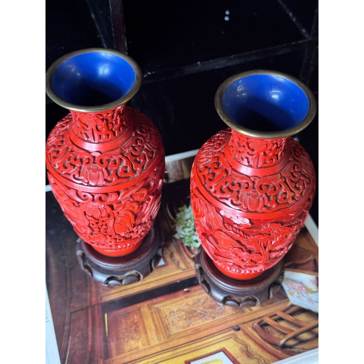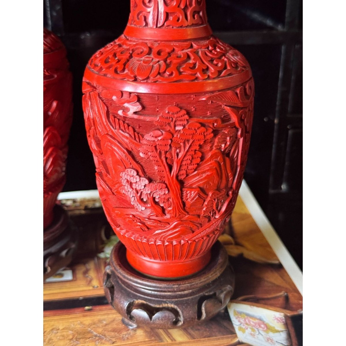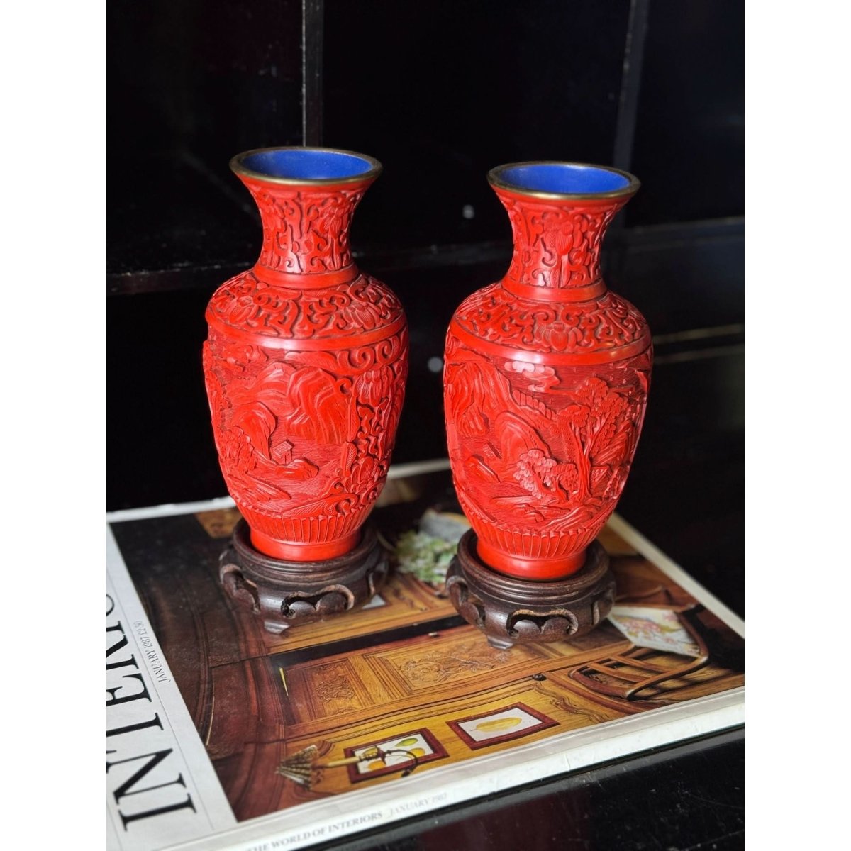 Beautiful pair of 1920-50s red cinnabar lacquerware vases with exquisitely carved mountainous landscapes to body. Brass base vessel (visible at rim and foot) with blue enamel interior. Each rests on fitted carved timber base. Sold as a pair. Some times of wear as expected with age.