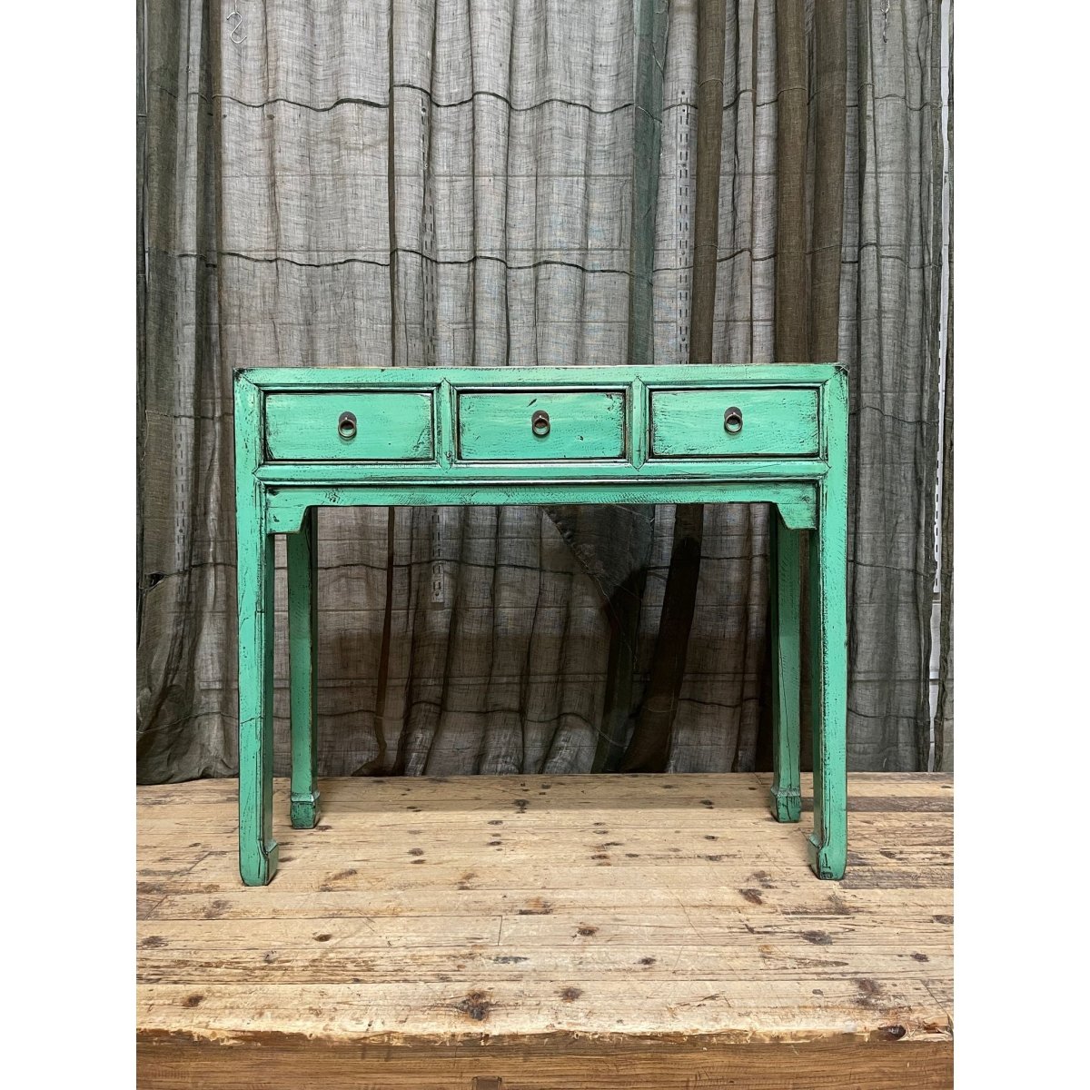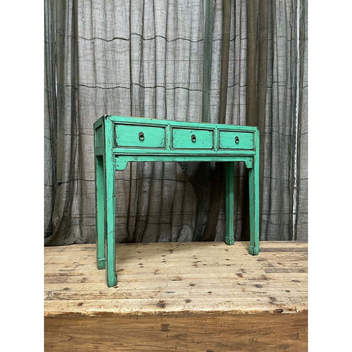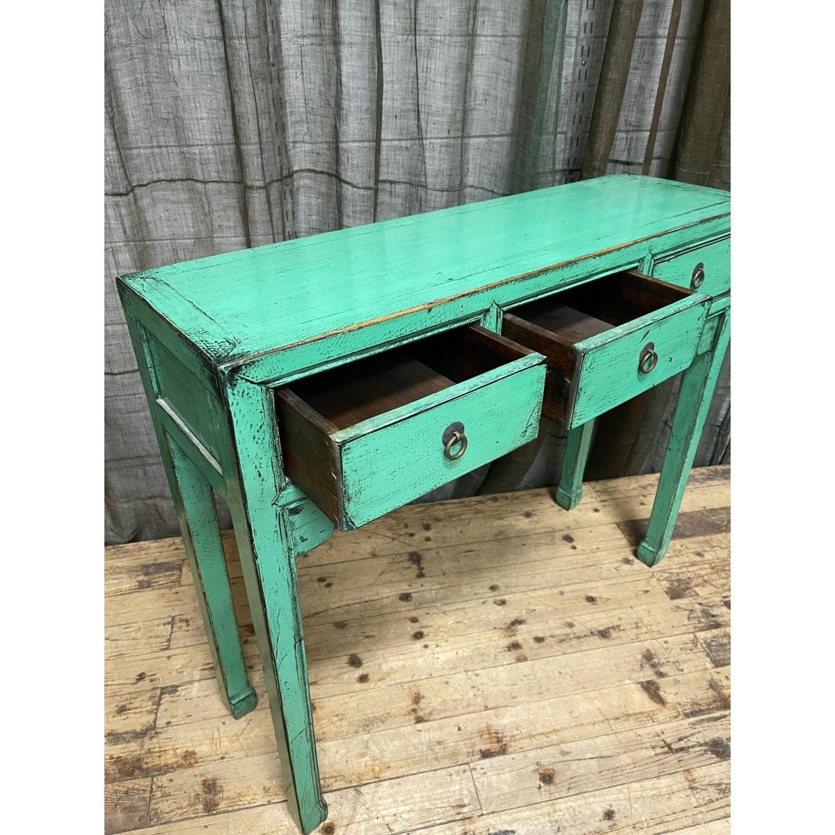 A provincial style Chinese light green lacquered three-drawer hall table.