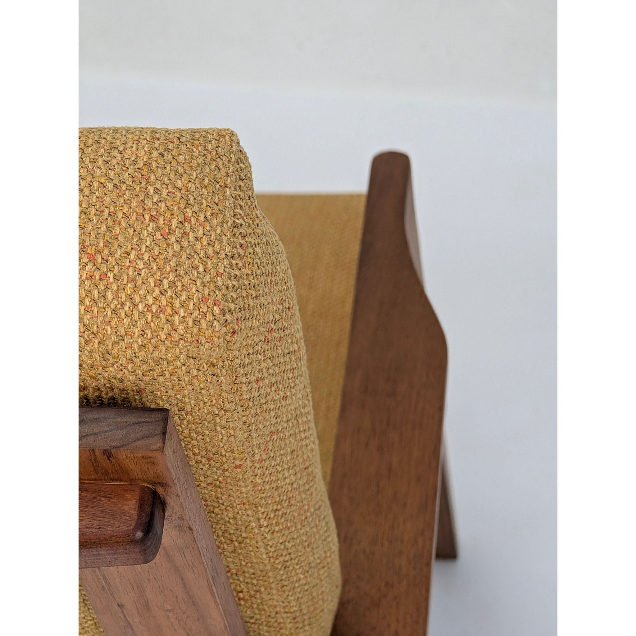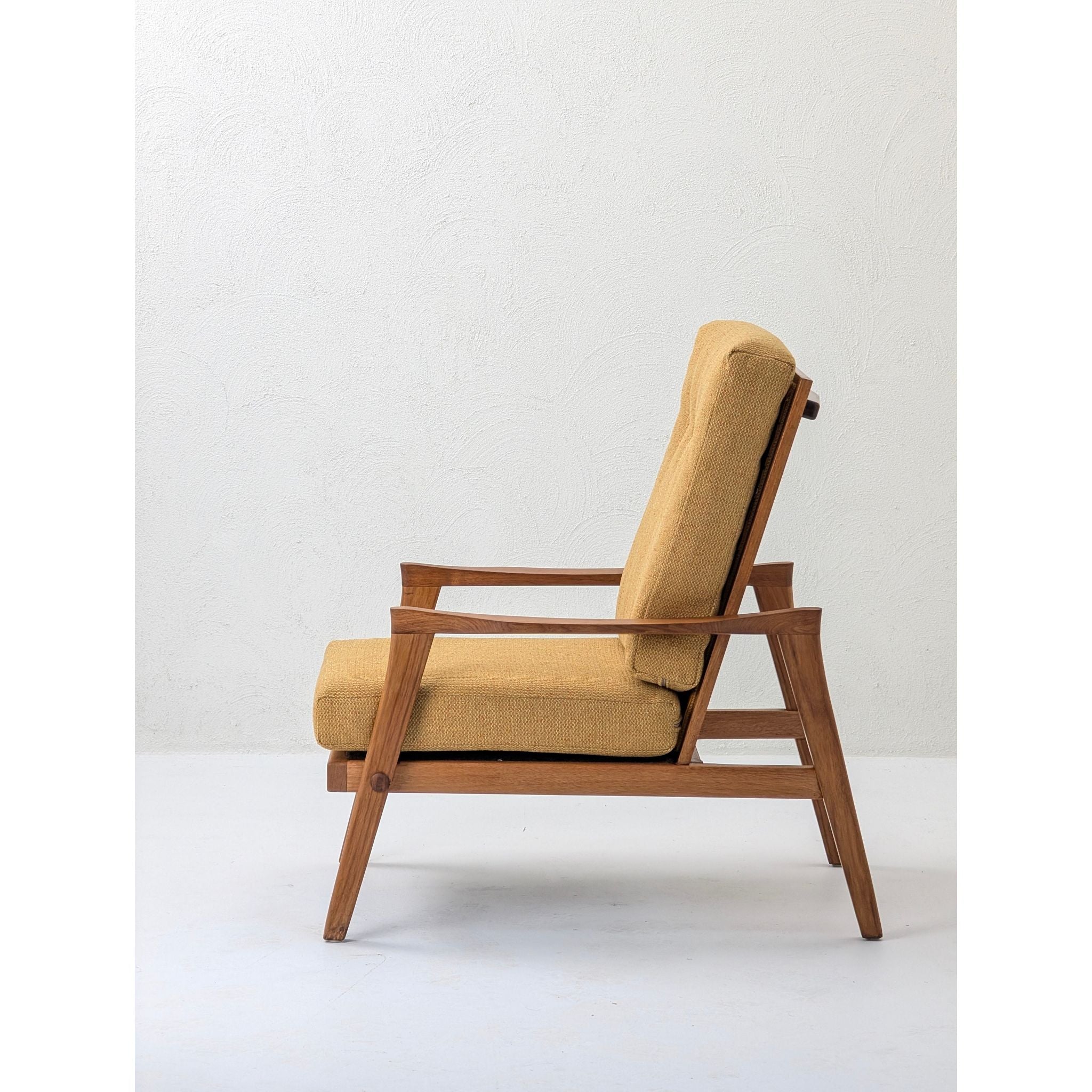 Crafted from beautiful solid Teak, this chair showcases the warm tones and rich grain characteristic of high-quality Scandinavian-inspired design. The frame features clean, angular lines, elegantly sculpted armrests, and tapered legs that create a classic and timeless silhouette.