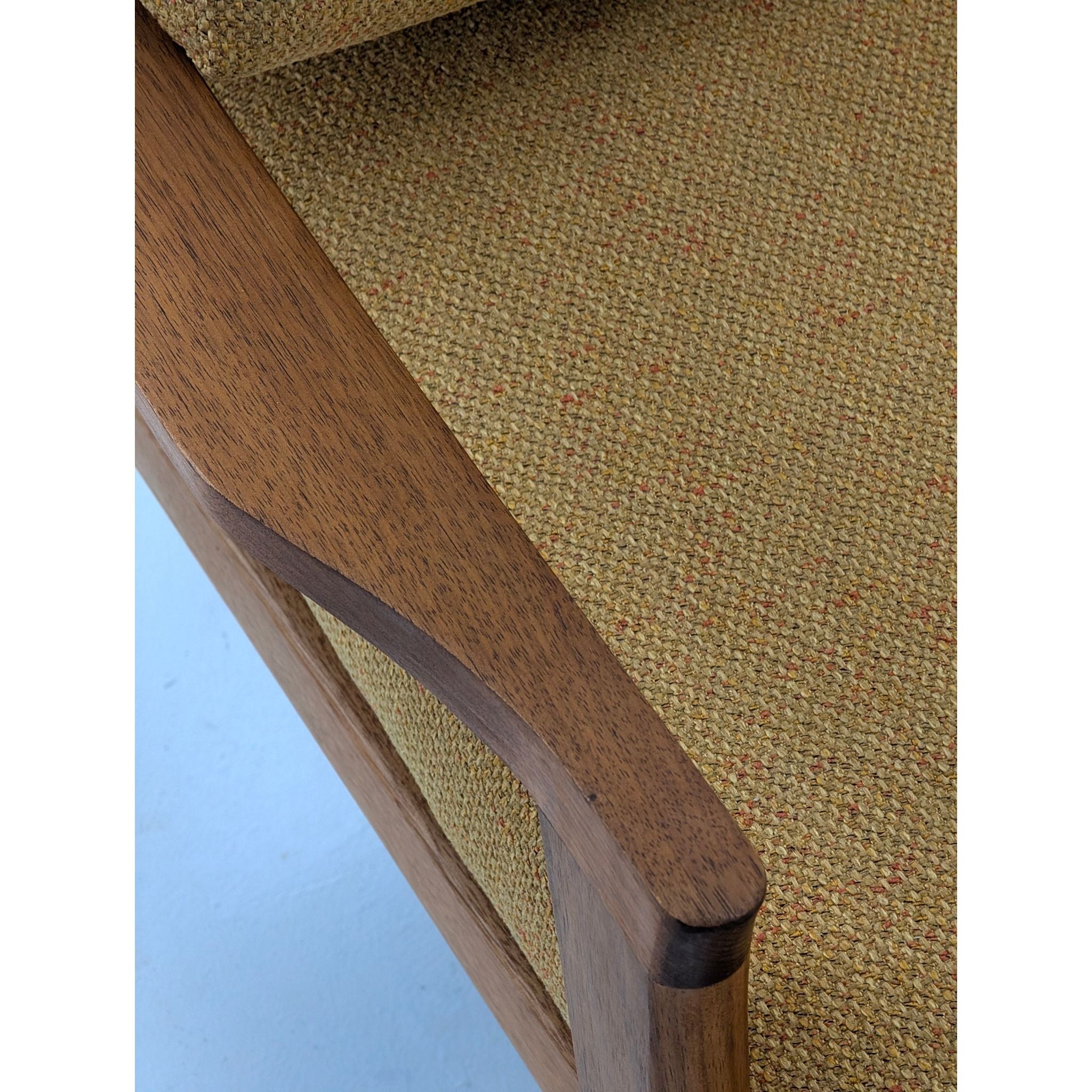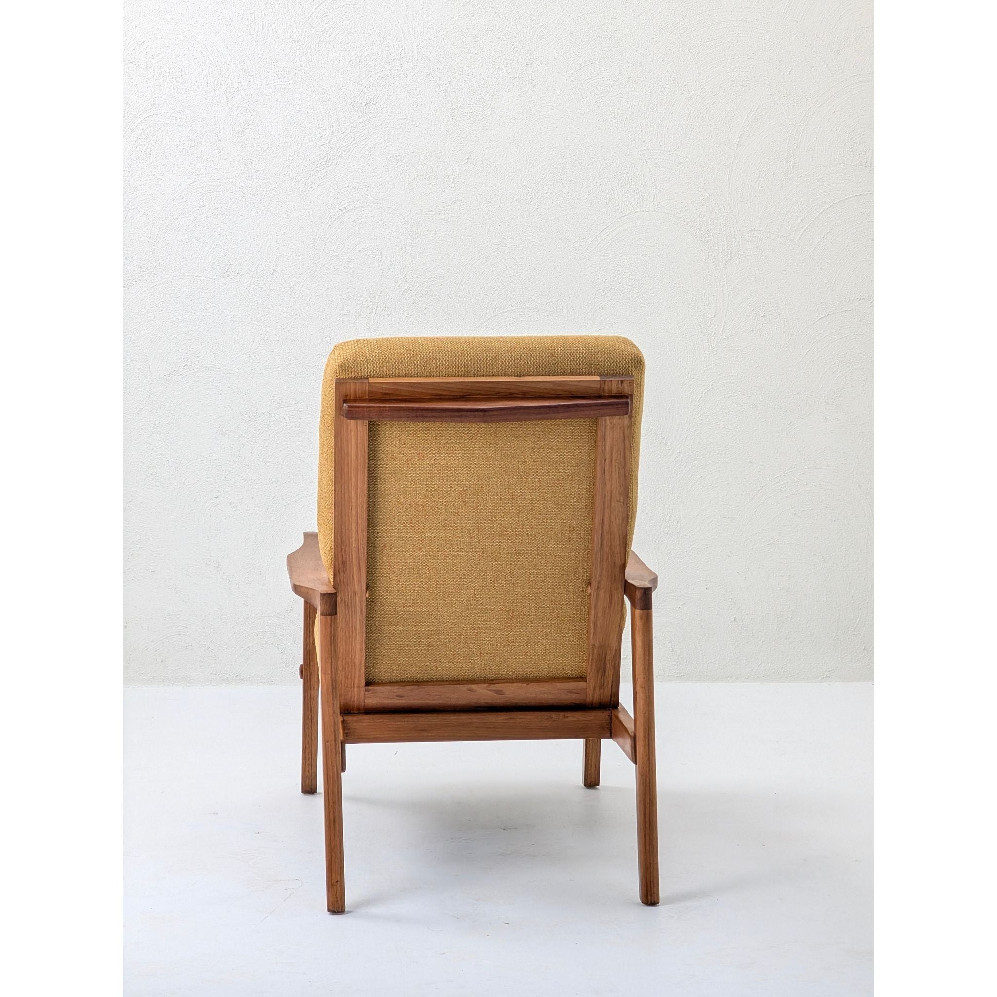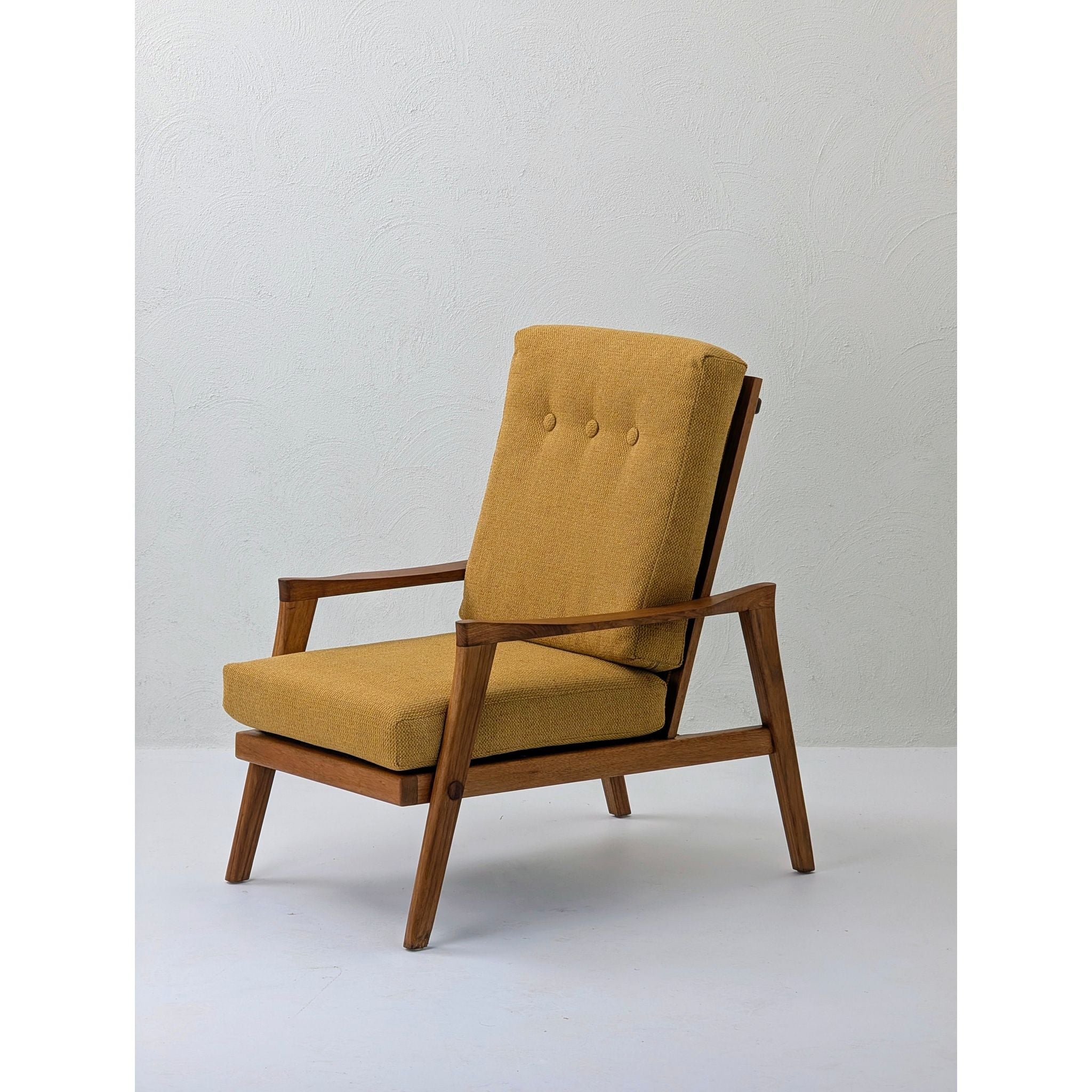 The chair has been professionally reupholstered in a premium, hard-wearing Warrick textured fabric in a vibrant mustard yellow. The backrest is detailed with three subtle buttons, adding to its authentic mid-century charm.