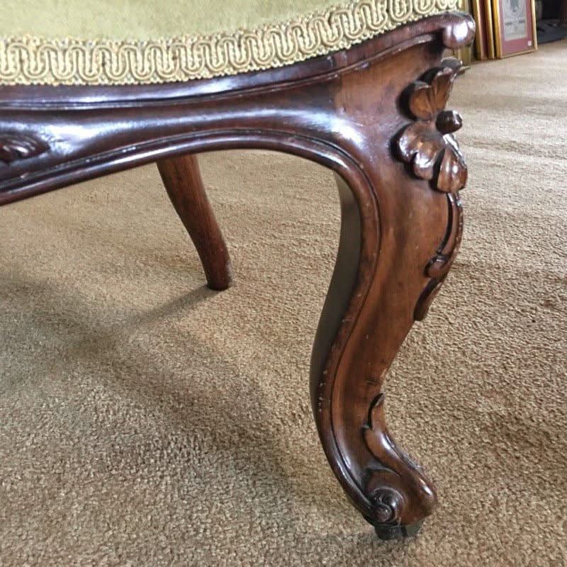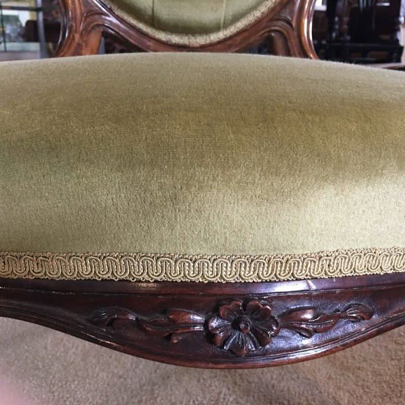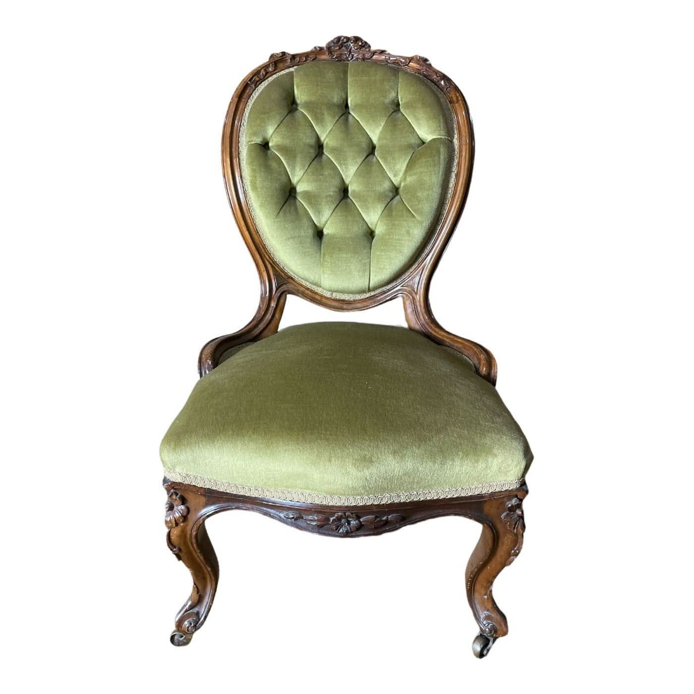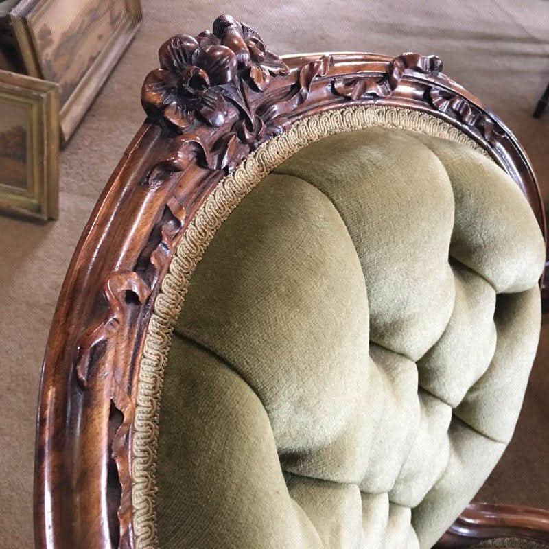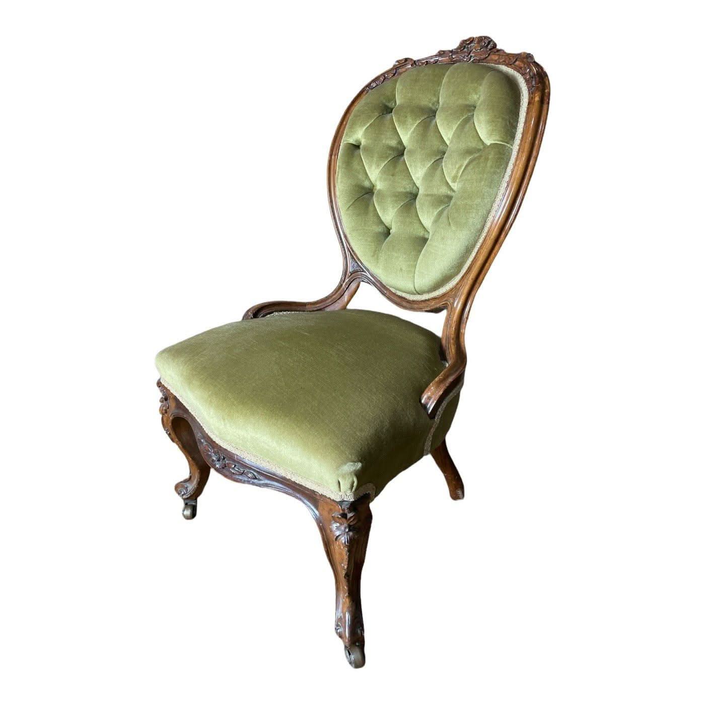 Victorian ladies chair with flower and ribbon carving and button upholstery. Circa 1875