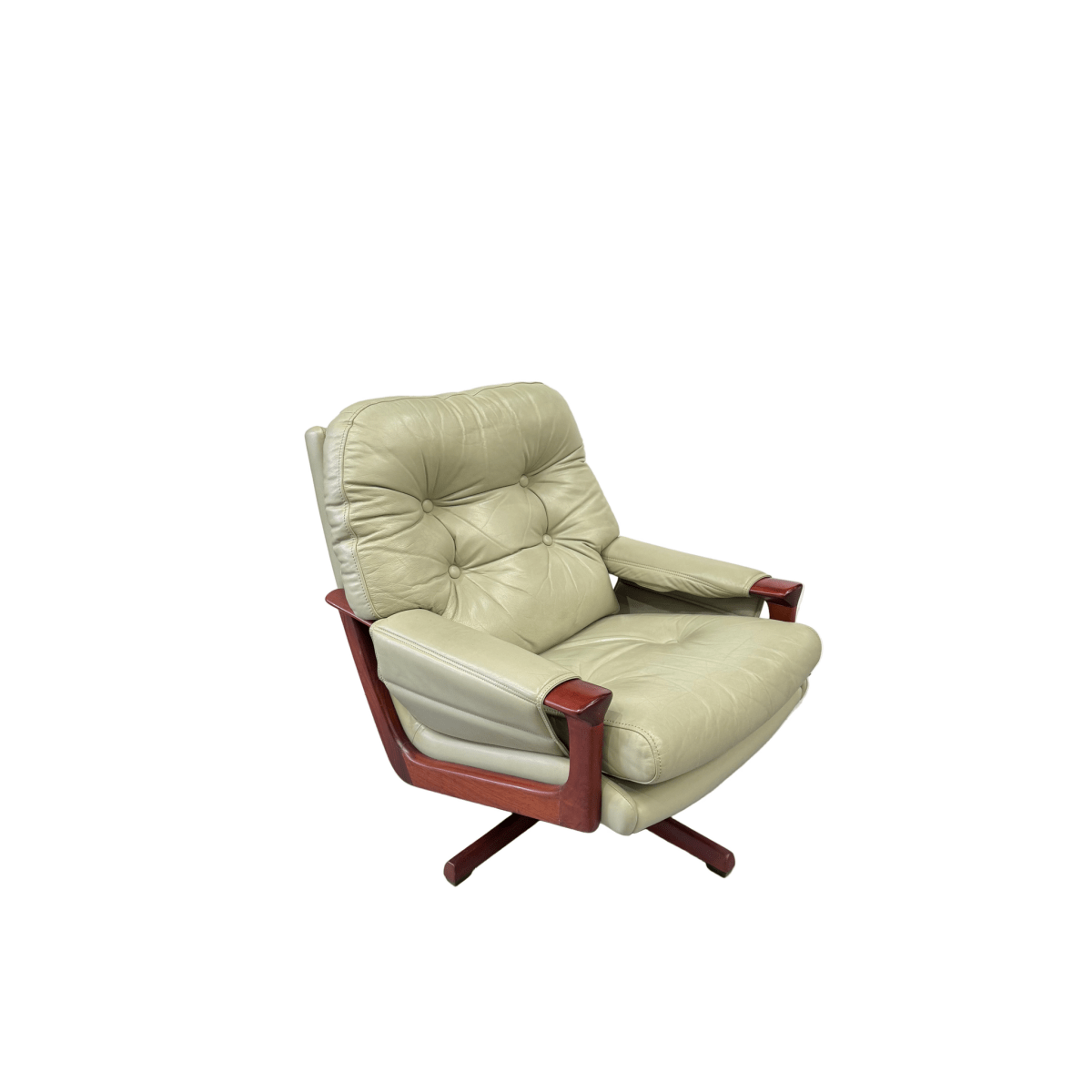 This striking Tessa T1 swivel armchair showcases the timeless appeal of mid-century design in a sophisticated sage green leather. The supple hide displays authentic patina and gentle wear marks that speak to its vintage heritage, adding character and depth to the piece. The swivel base offers practical functionality, while the generous proportions and classic silhouette make it an exceptional statement piece for any interior. A true collector's item that combines comfort with enduring style.