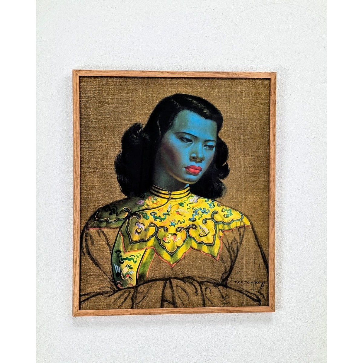 The portrait captures the exotic charm of a young Chinese woman, distinctively characterised by an unconventional blue-green skin tone. This striking feature imbues the piece with an enigmatic aura, adding a unique dimension to Tretchikoff's exploration of feminine beauty. Her deferred gaze, combined with the blend of oriental styling and surreal colouration, results in a captivating visual experience that has secured its place as an icon of art history.