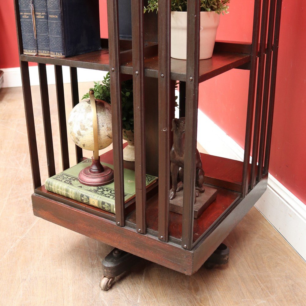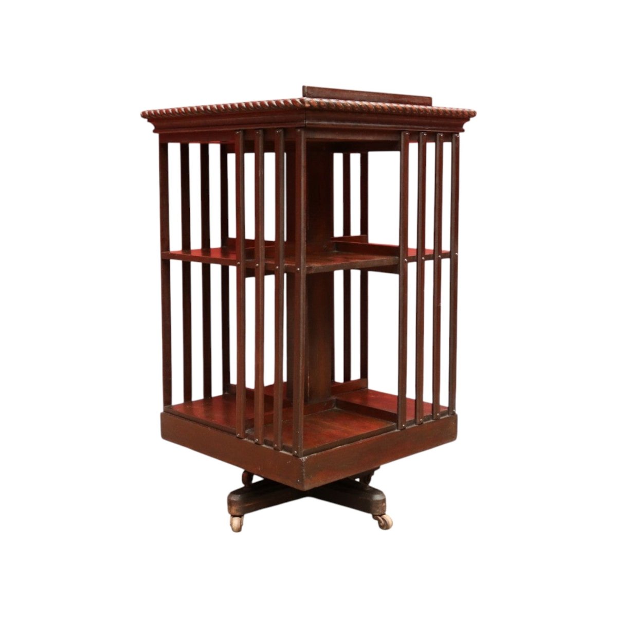 Description: Antique English revolving bookcase with cast iron base and eight individual book‐storage compartments. What makes this example particularly interesting and rare is the bookrest on the top tier, designed to hold a favourite open volume, sheet music, or display book. A design feature seen in early 20th-century library furniture, it elevates this piece beyond the standard revolving bookcase.