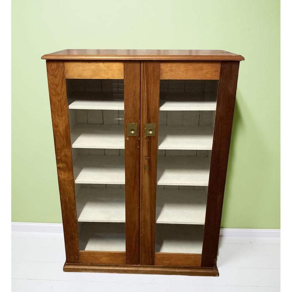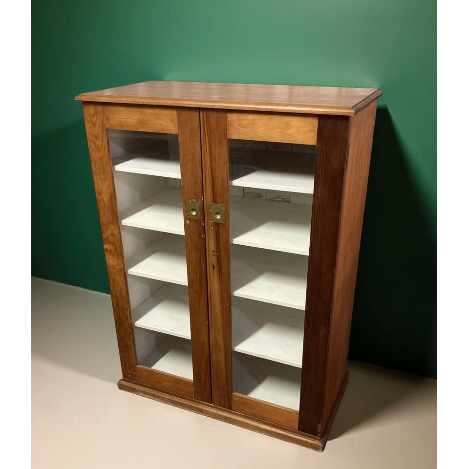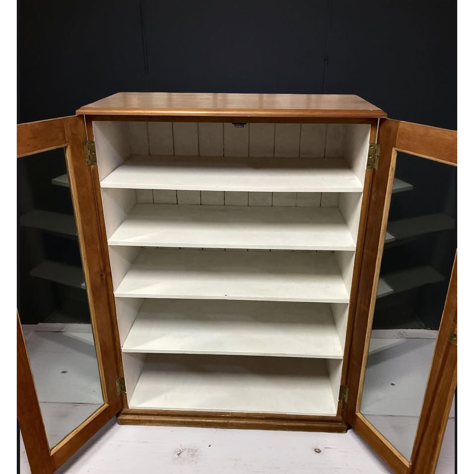 Features glass fronted doors , five fixed shelves & inset brass pull handles.