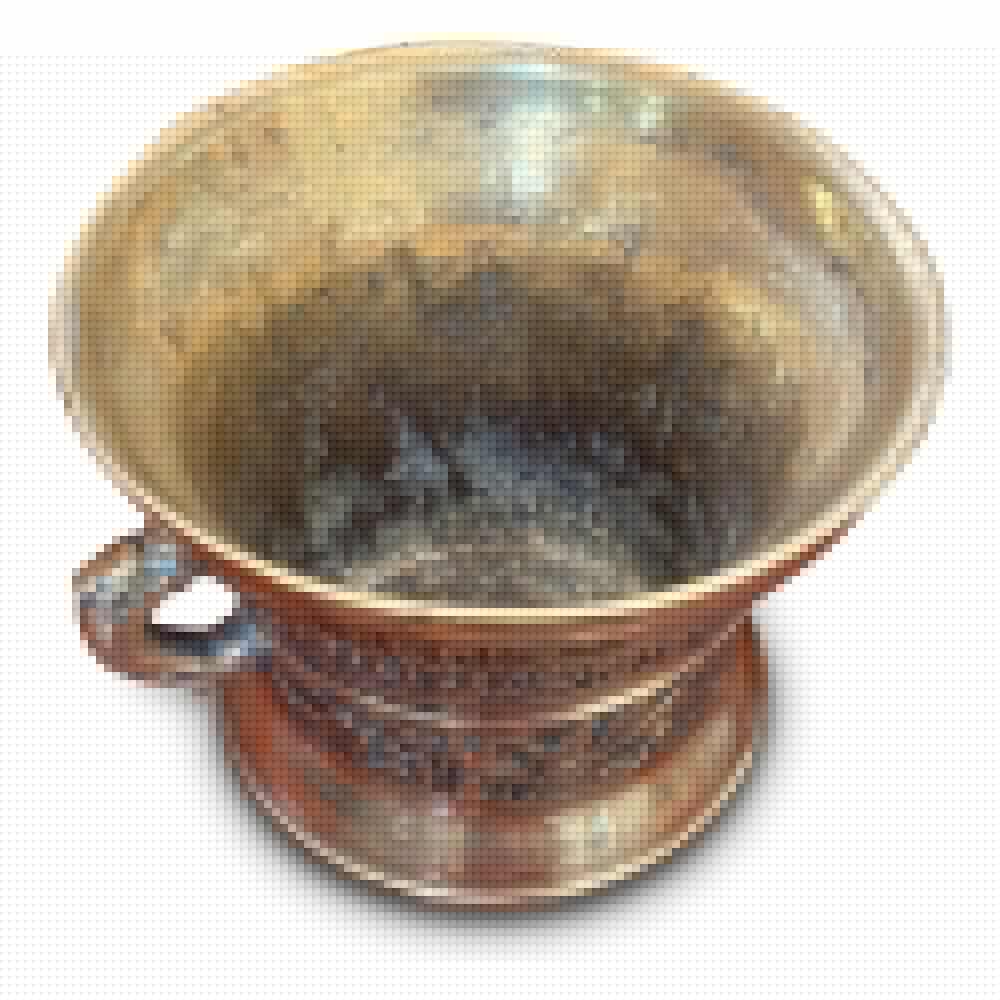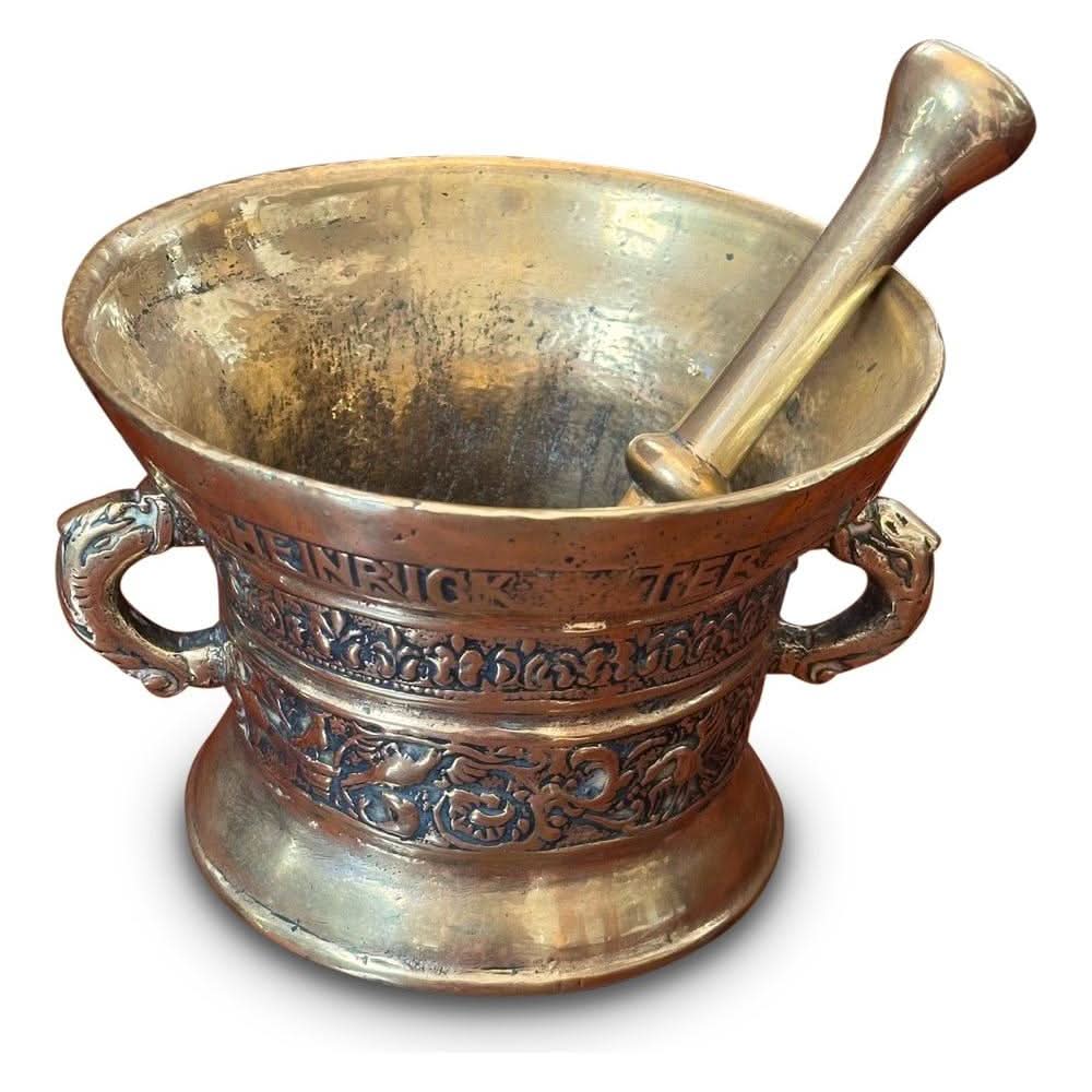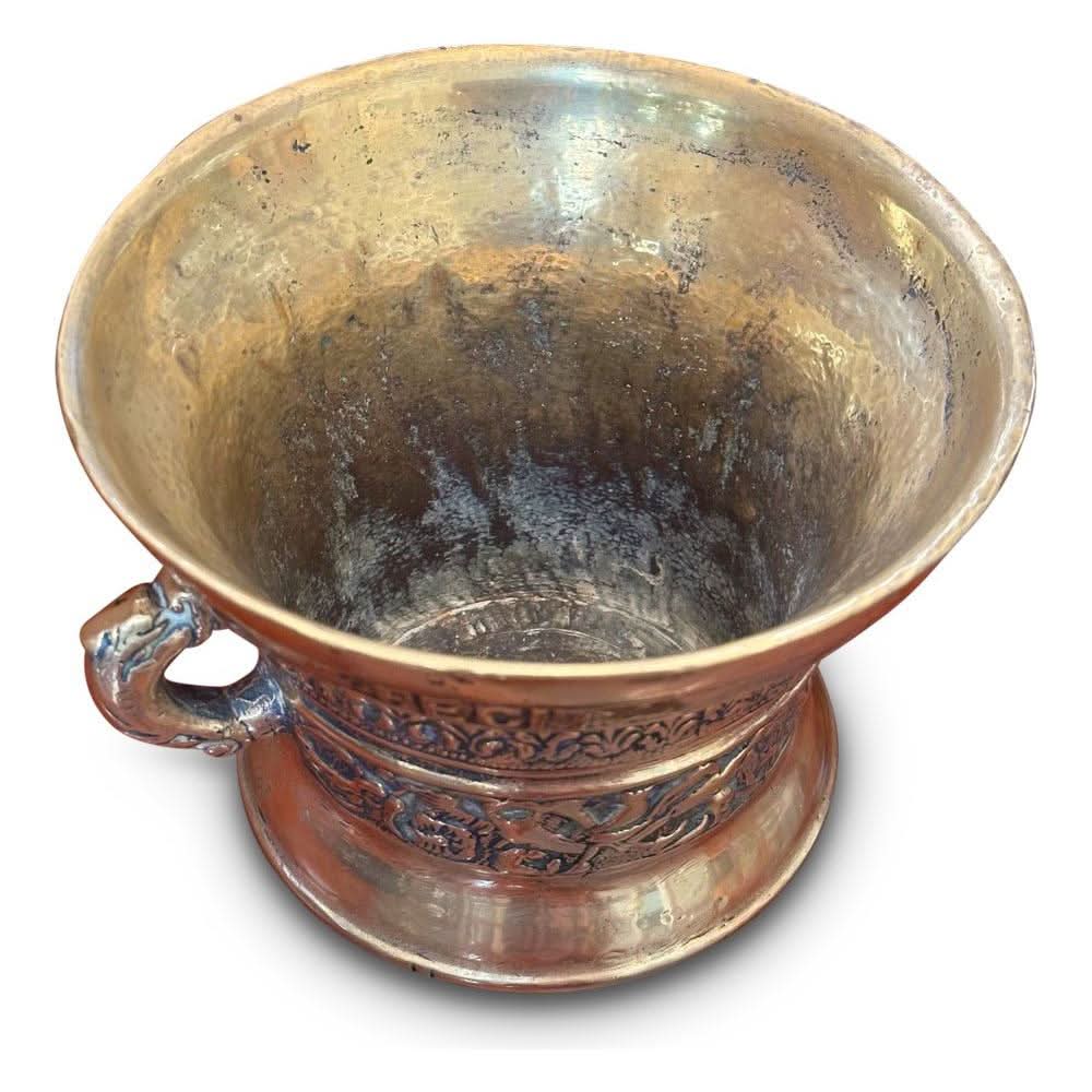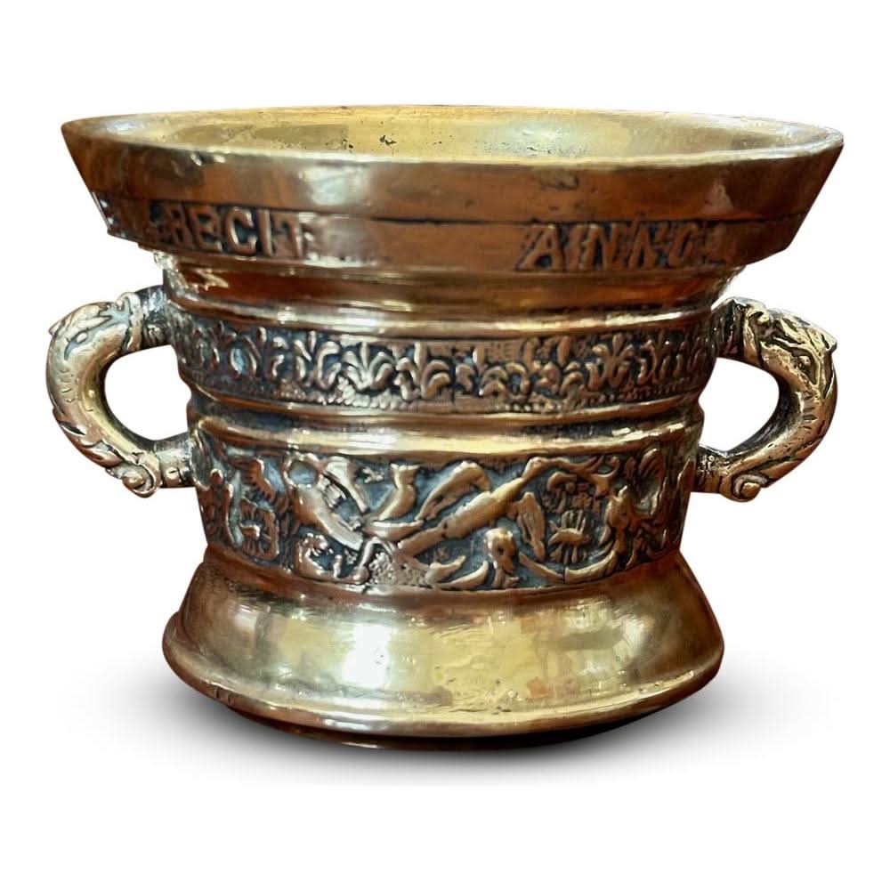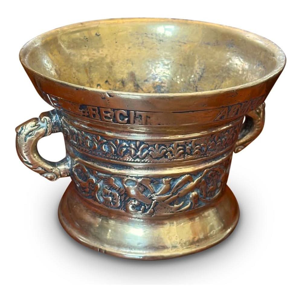 Beautiful and very heavy, this 19th century mortar likely hails from Germany. Crafted from brass, this piece has a lot of detail on the outer side.