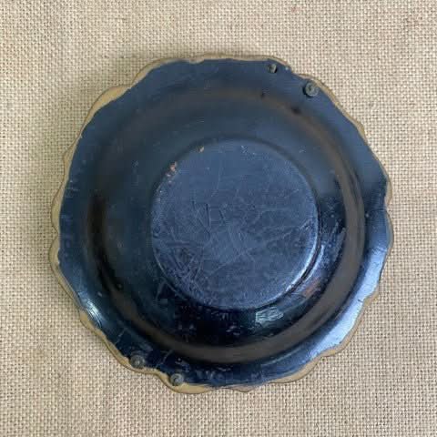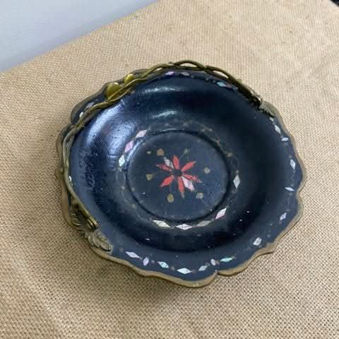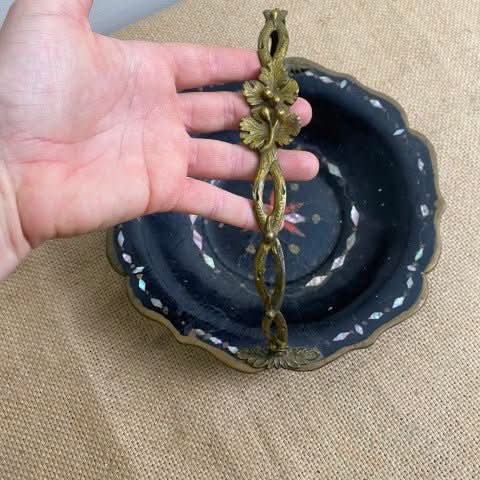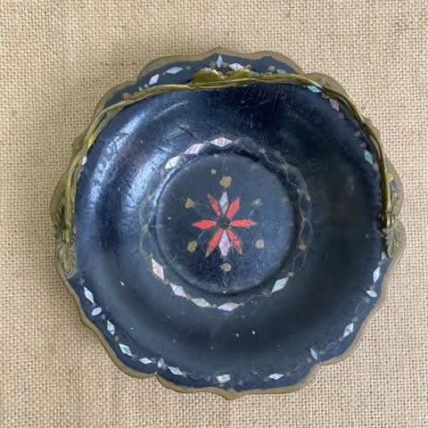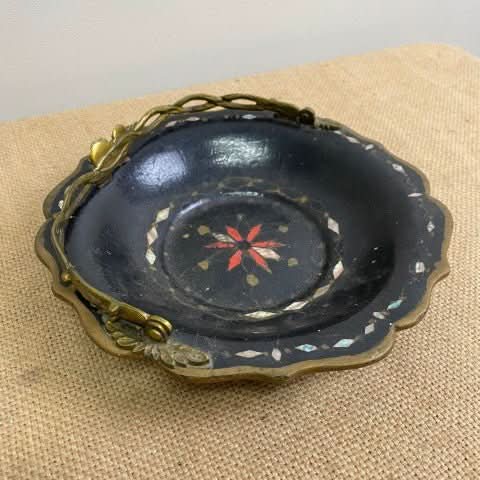 This rare antique Victorian paper mache bowl features delicate mother of pearl inlay set against a black lacquered finish. It includes a hinged metal carry handle and subtle hand-painted detailing. A fine decorative piece with elegant craftsmanship and period charm. Height with handle extended is 15cm.
