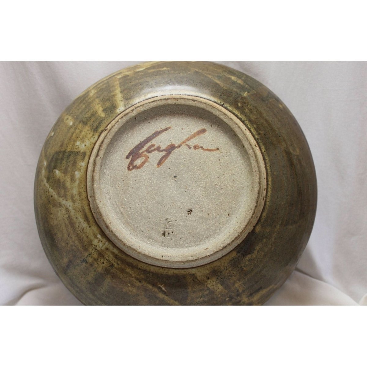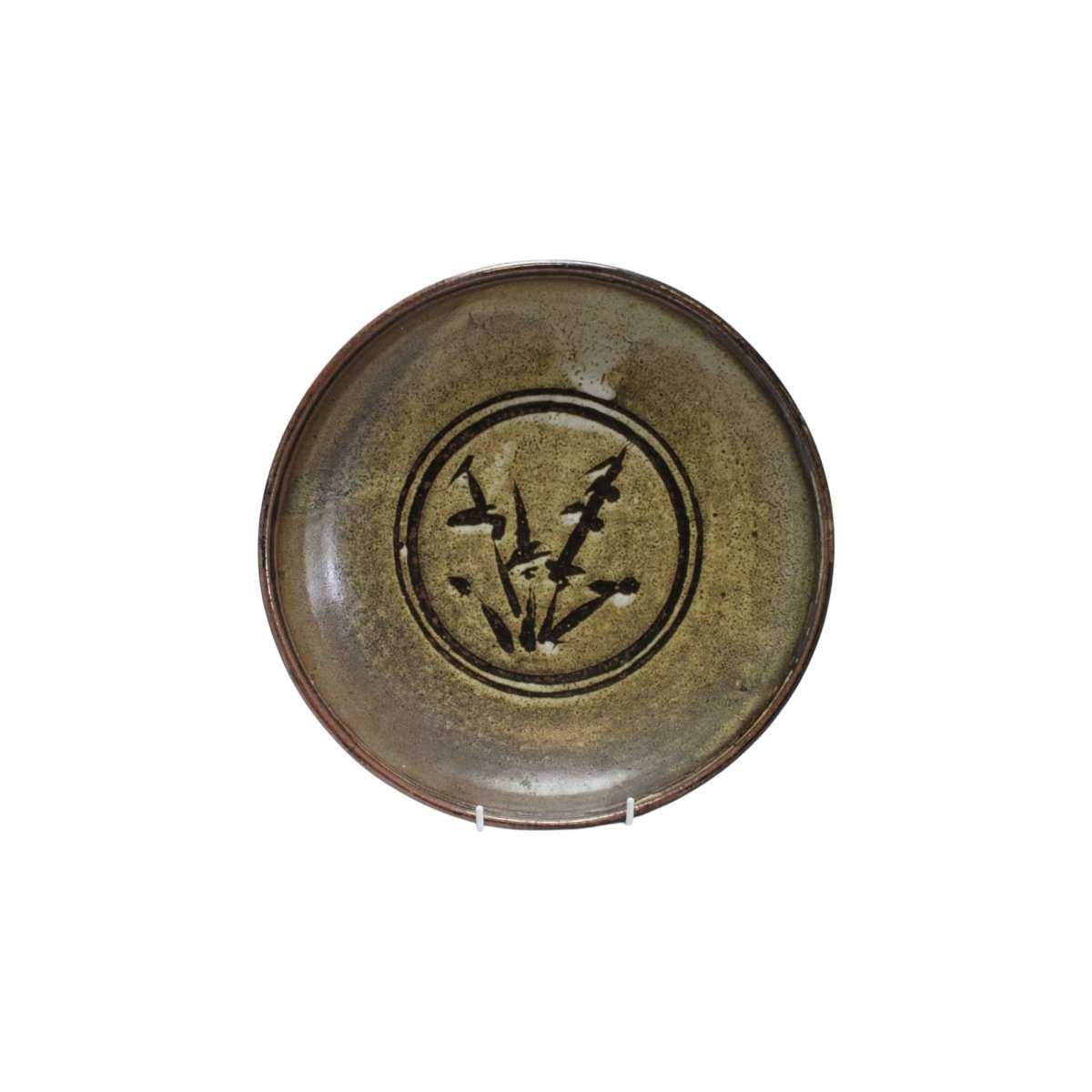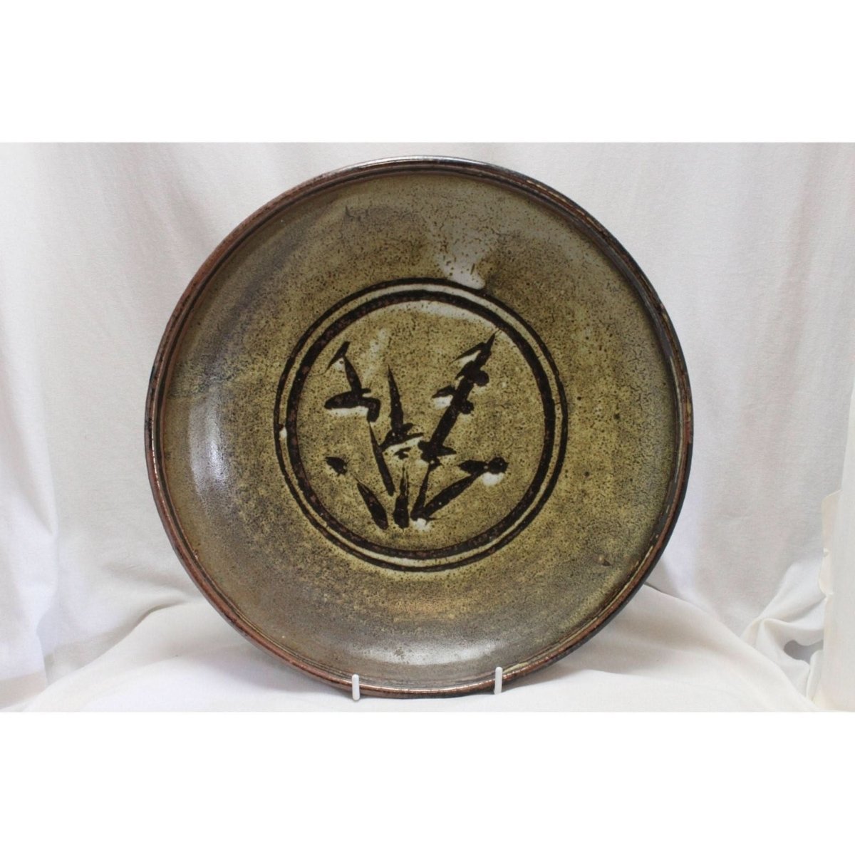 This large wheel thrown stoneware bowl by Harold Hughan (1893-1987) measures 295 mm in diameter and stands 60 mm high. The centre is decorated with a stylized plant motif in dark brown, enclosed in two concentric circles. The whole piece is glazed with a speckled green/brown glaze over a cream glaze. The back is signed with his painted signature and his impressed rebus HGI, standing for "Hughan Glen Iris", the suburb of Melbourne where he lived. It is in very good condition, and would display equally well as either a centrepice on a table, or as a charger on a stand. It would date from around 1970.