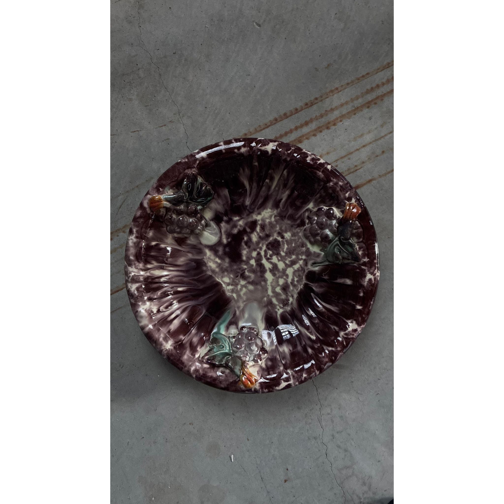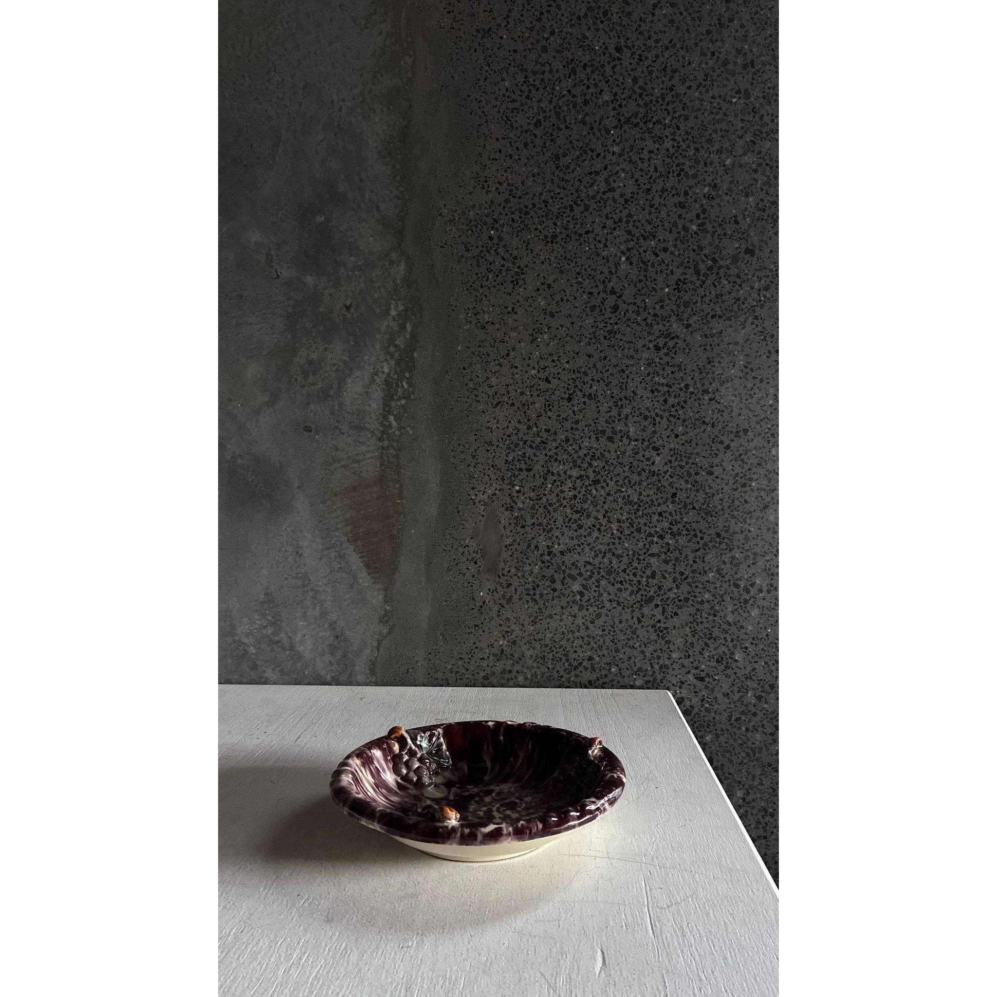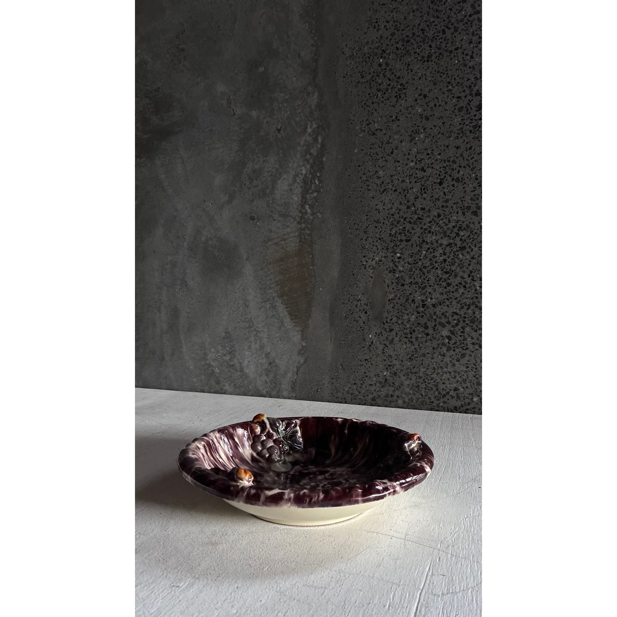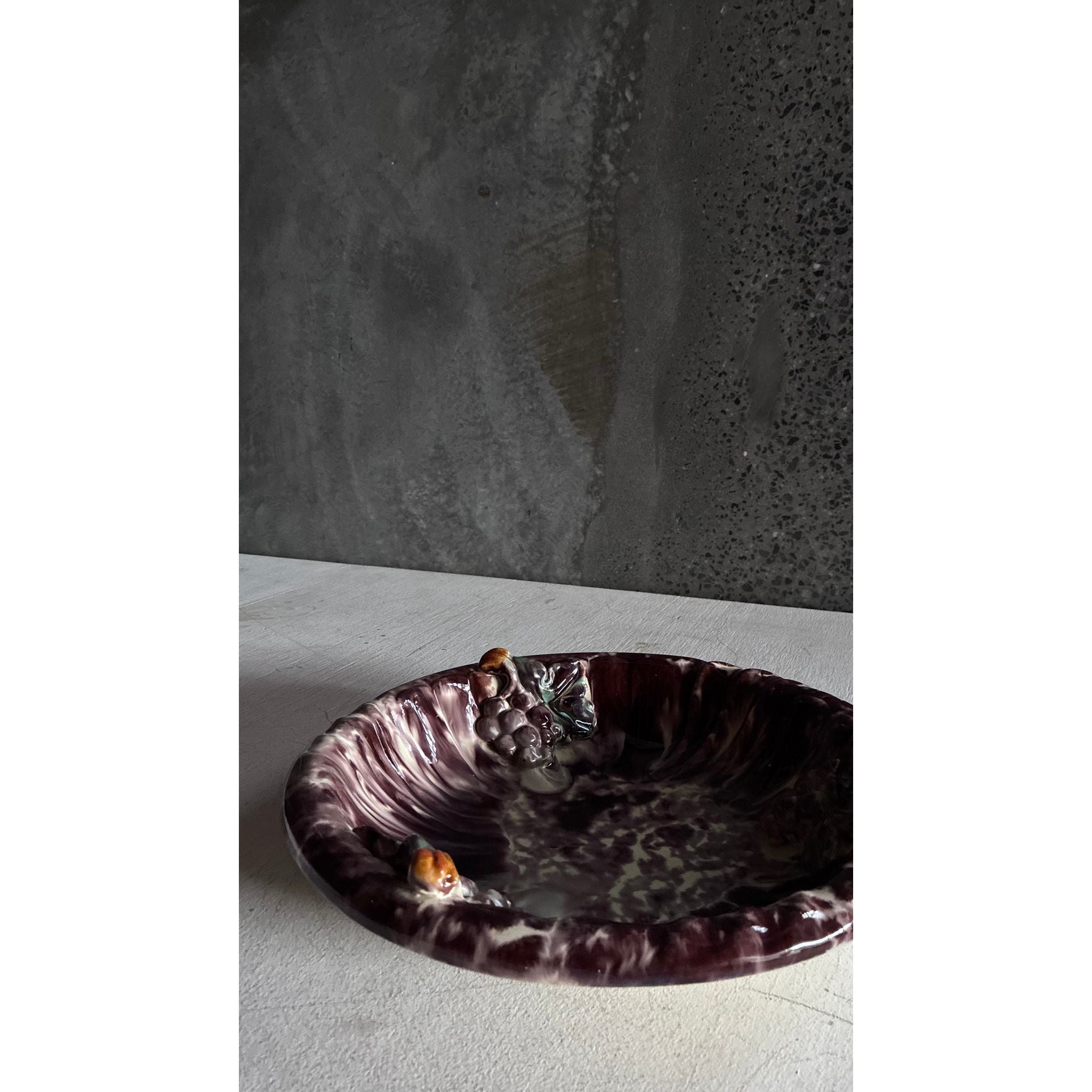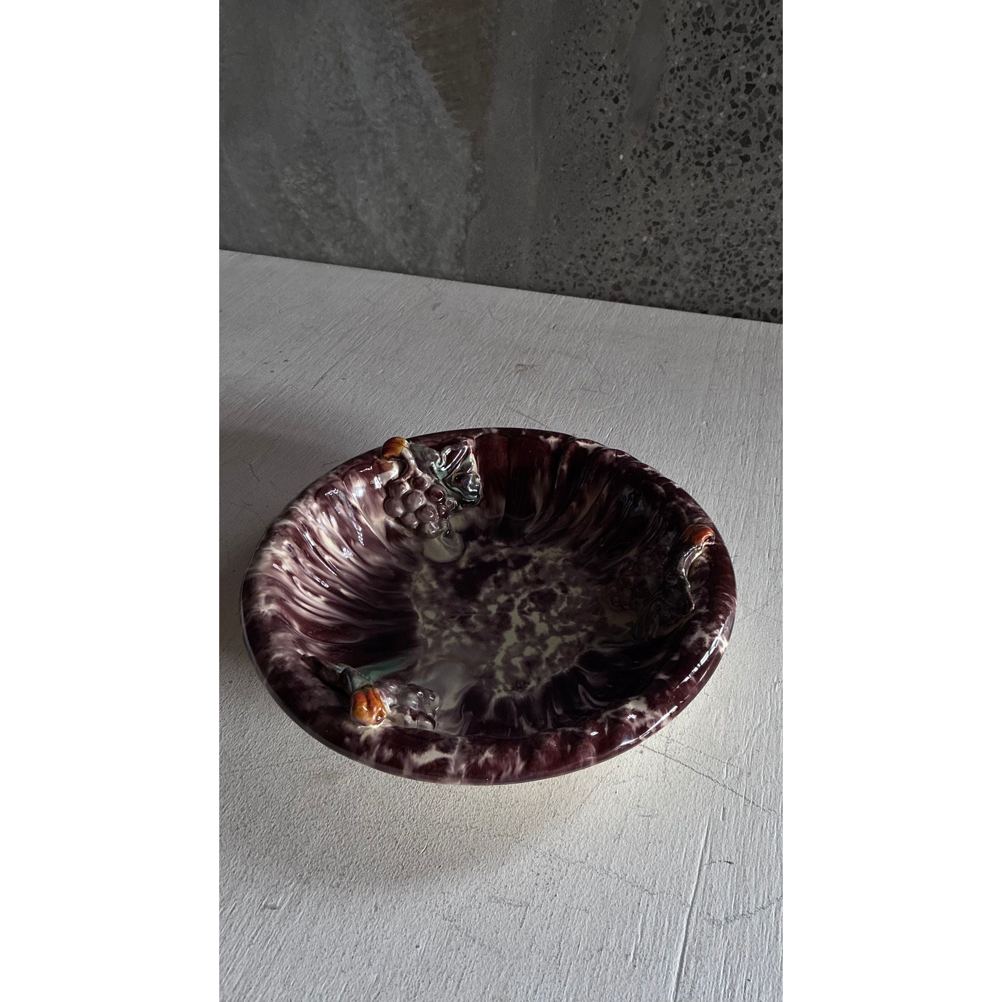 Germany c. 1940s - 1960s A richly glazed mid-century ceramic bowl by Jasba keramik, showcasing the expressive surface treatments that defined German studio pottery in the post-war period. Decorated with raised grape and leaf motifs, the bowl features a striking laufglasur (running glaze) finish, where layered glazes melt and pool across the surface, creating depth, movement and tonal variation. This tactile, organic approach to decoration is characteristic of Jasba's work from the 1940s through 1960s, blending traditional motifs with modernist sensibilities. A strong example of mid-century German ceramics with enduring visual presence. Dimensions: 32D X 10H (cm) Condition: Great condition, vintage, minor wear consistent with age