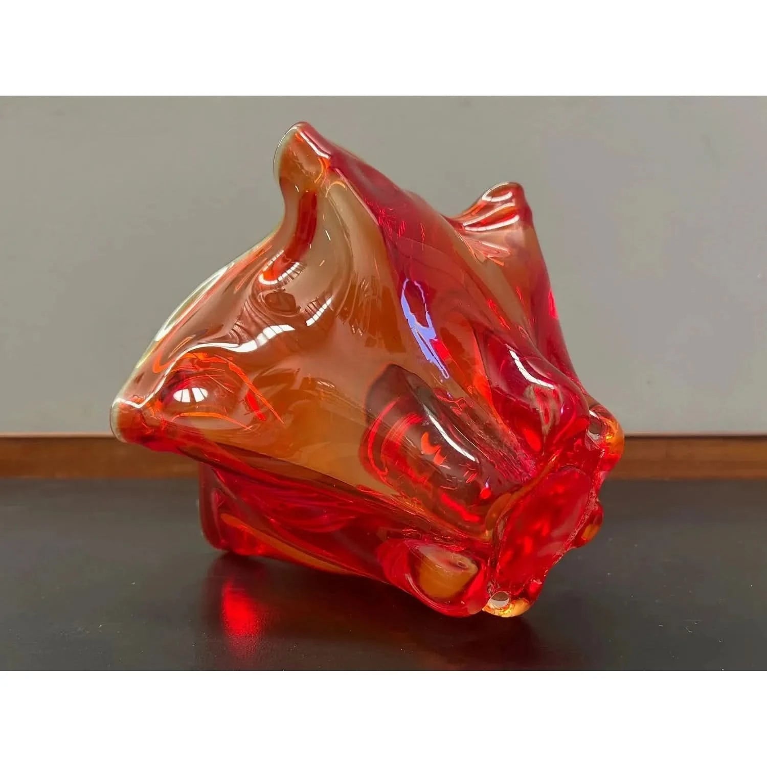 A handcrafted piece with a blend of red and yellow hues that transitions beautifully.