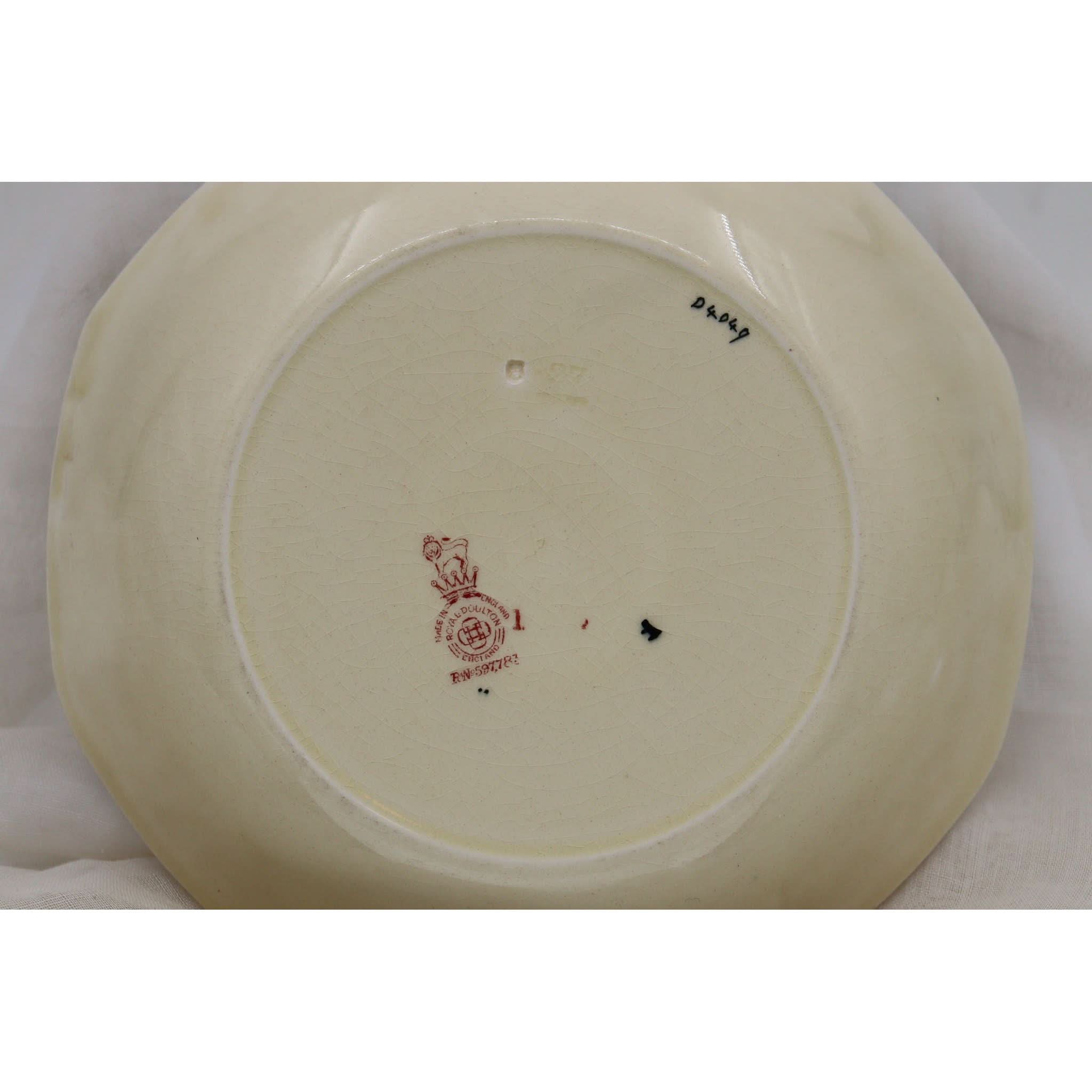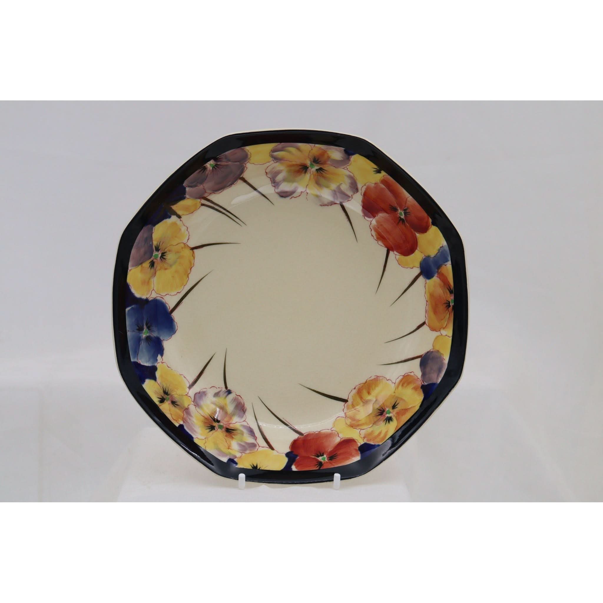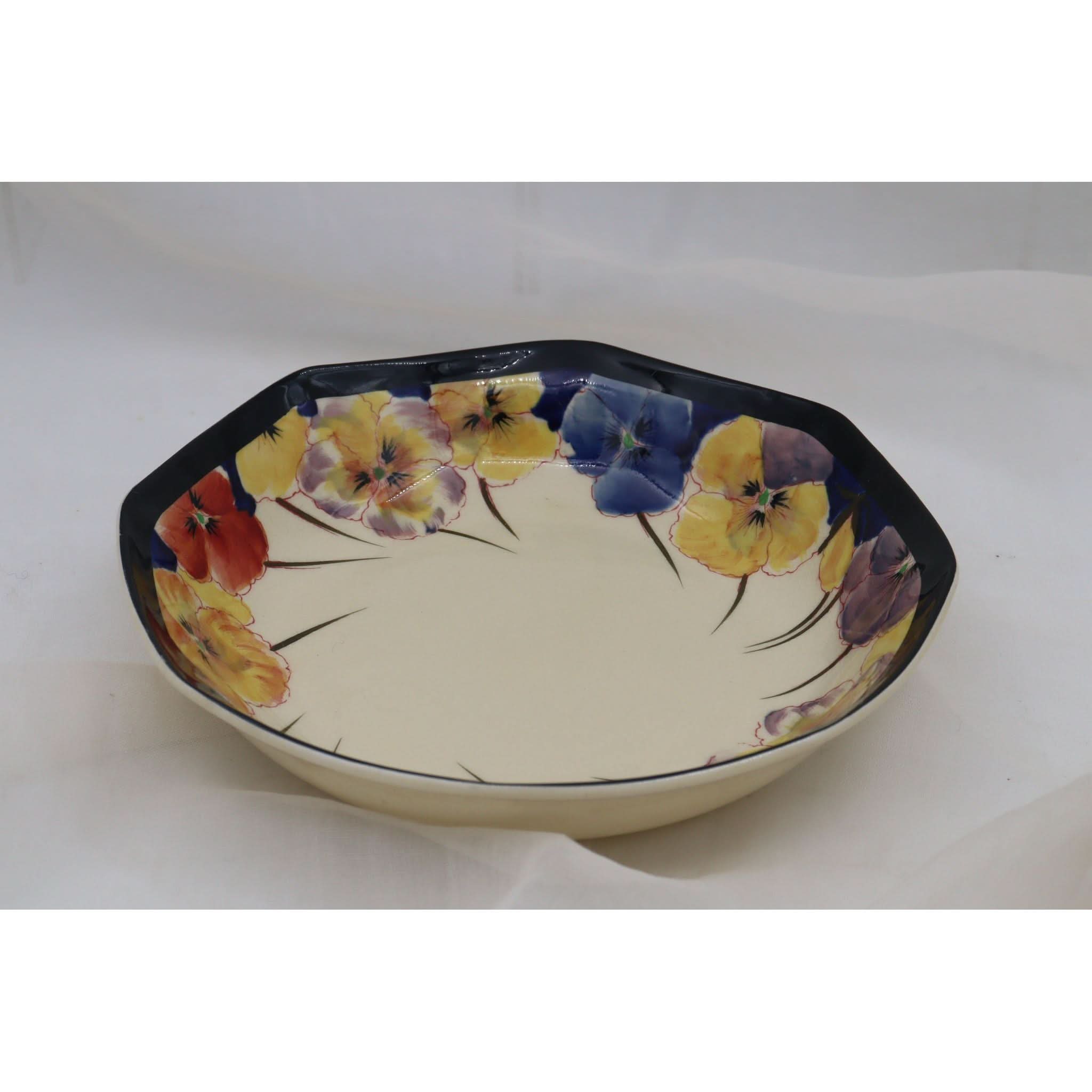 This Royal Doulton octagonal bowl is decorated with their ever popular hand painted Pansy pattern. The pattern (pattern D 4049) was introduced in 1917 and withdrawn by 1930. It was mainly an export pattern, being shipped mainly to Australia, Canada and South Africa. It has a diameter of 195 mm (7 5/8ths inches) and it stands 40 mm (1.5 inches) high. There are no cracks or chips, but it does have some crazing and there is a faint scratch to the rim. It carries the impressed date stamp for May 1927.