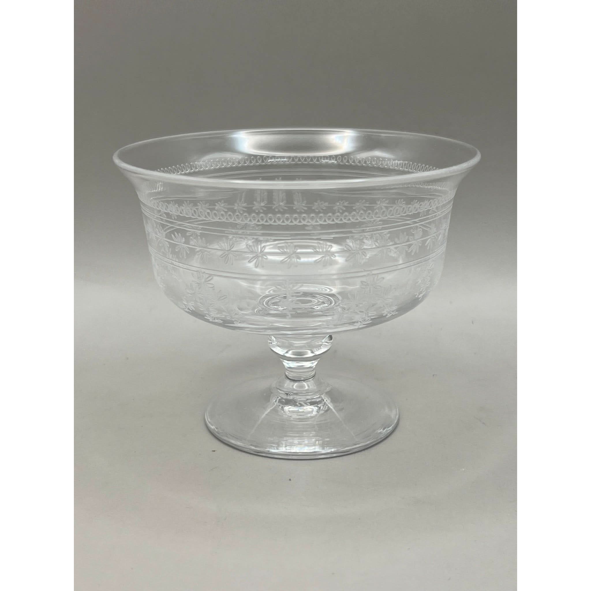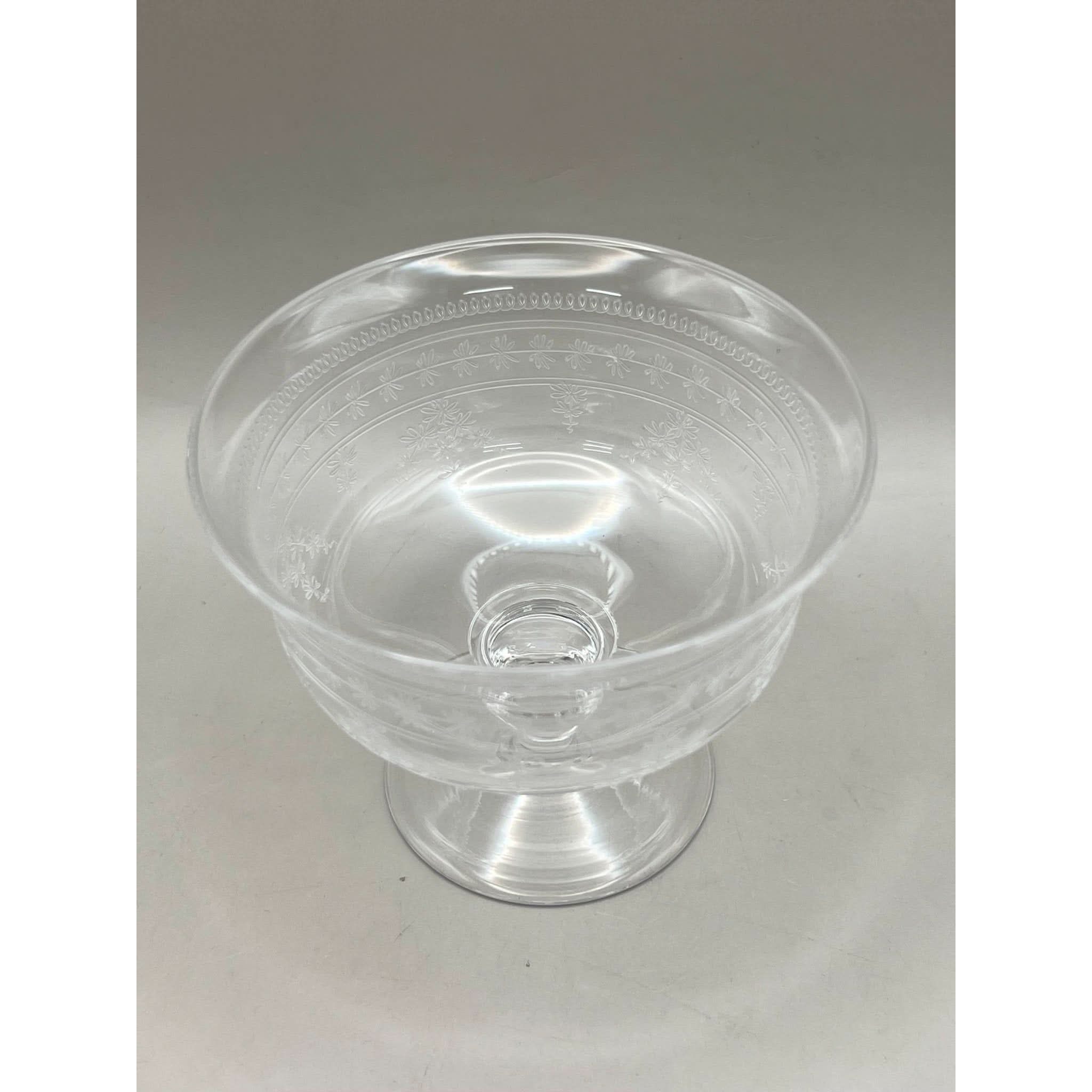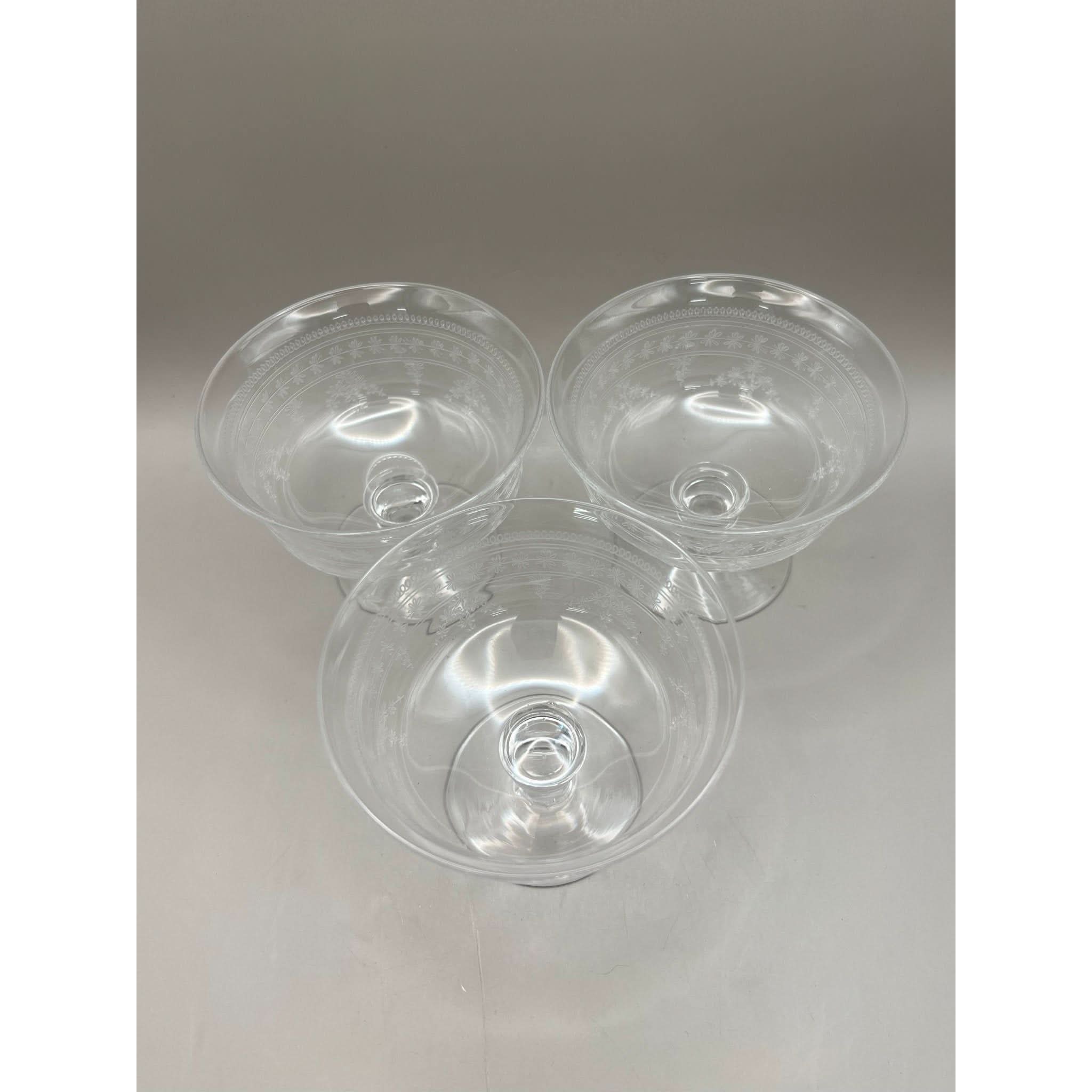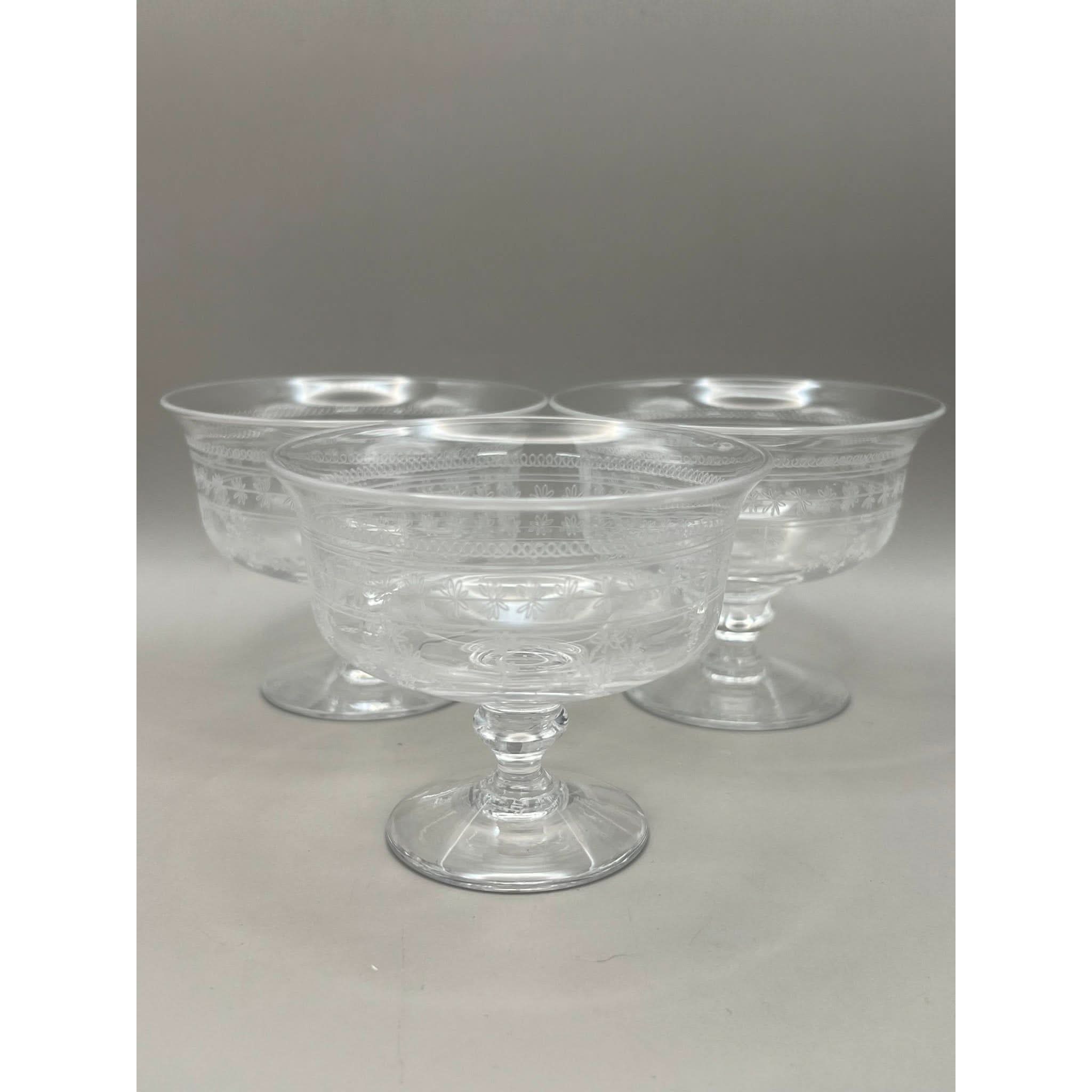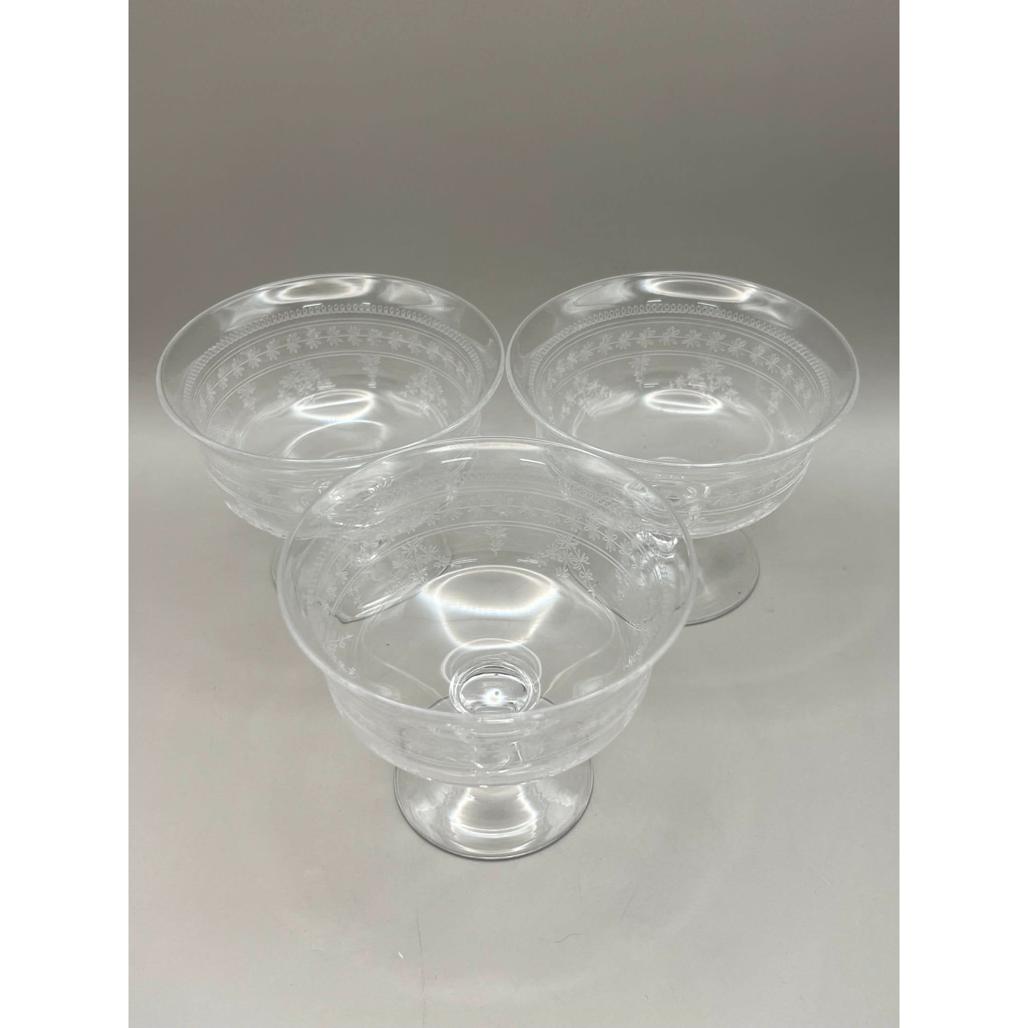 These 3 small dessert bowls were produced in the 1920s and feature a delicate band of garlands and flowers that encircle the glasses. They personify 1920s Art Deco style.