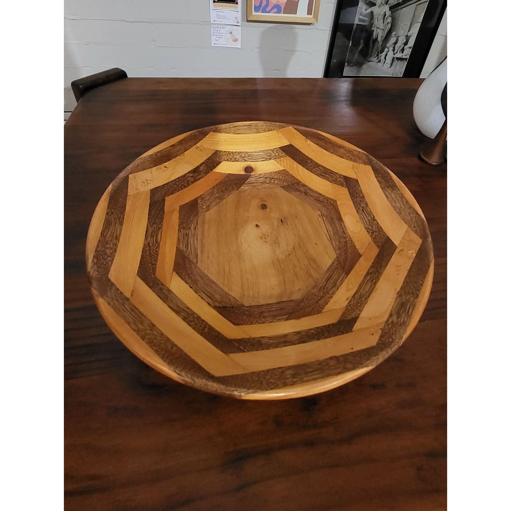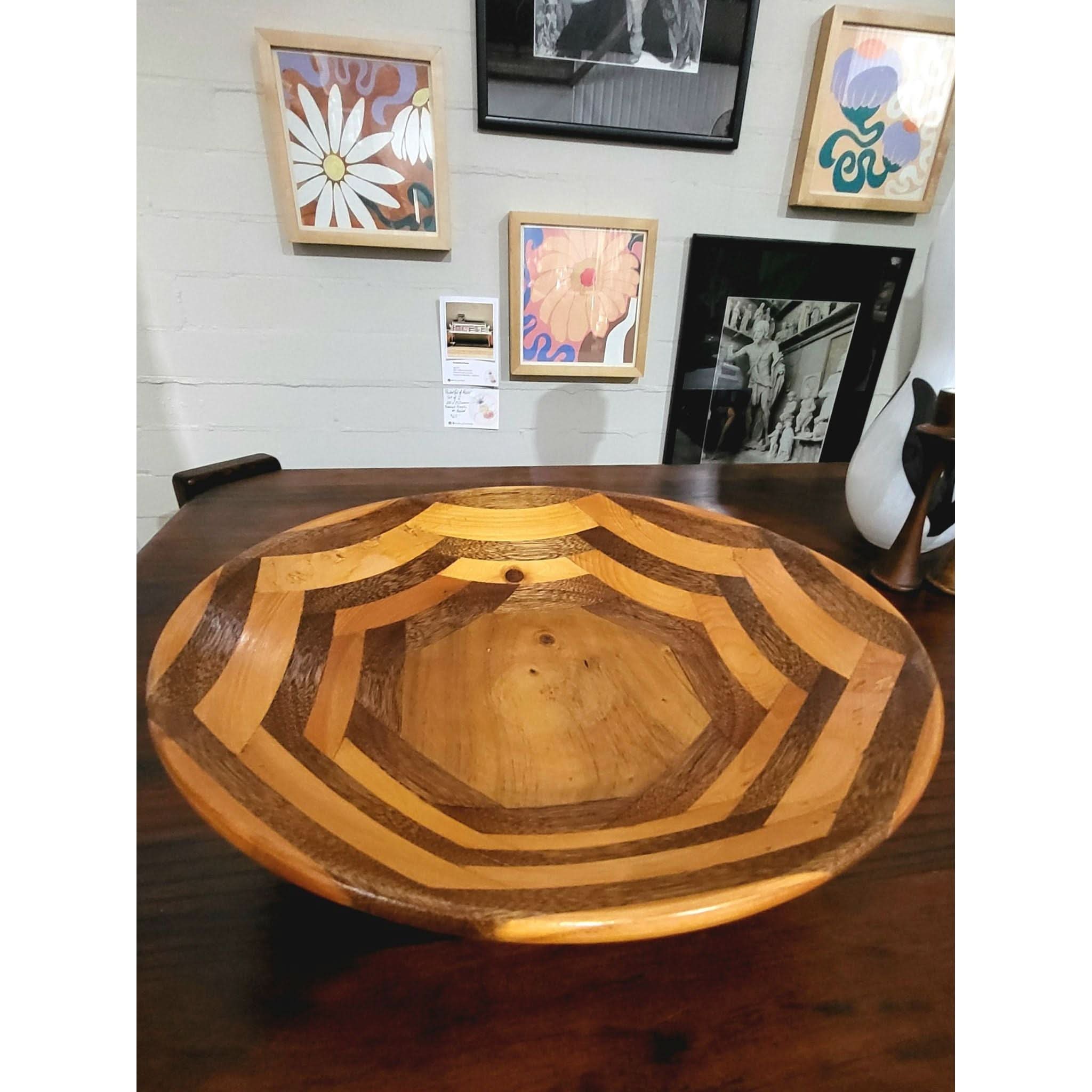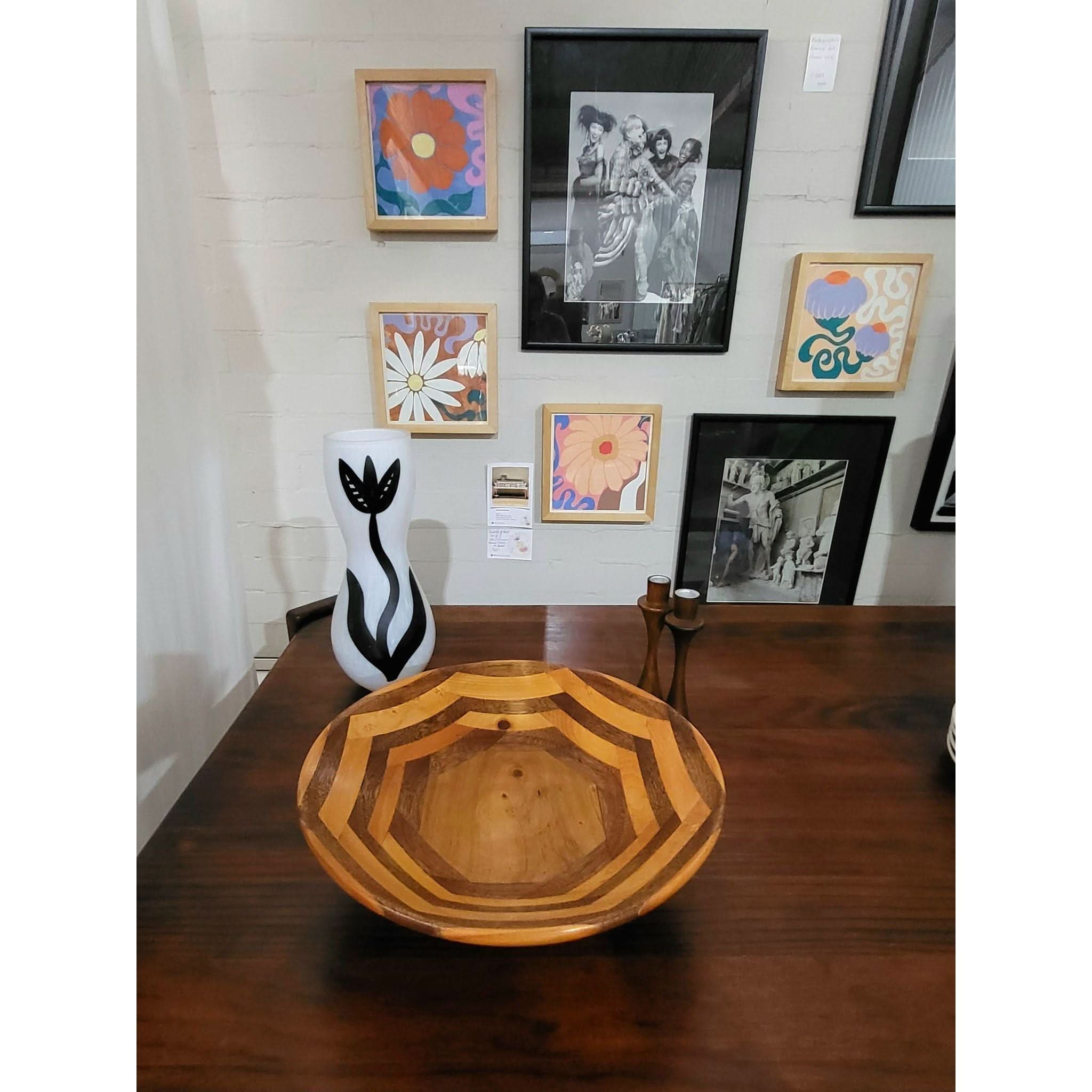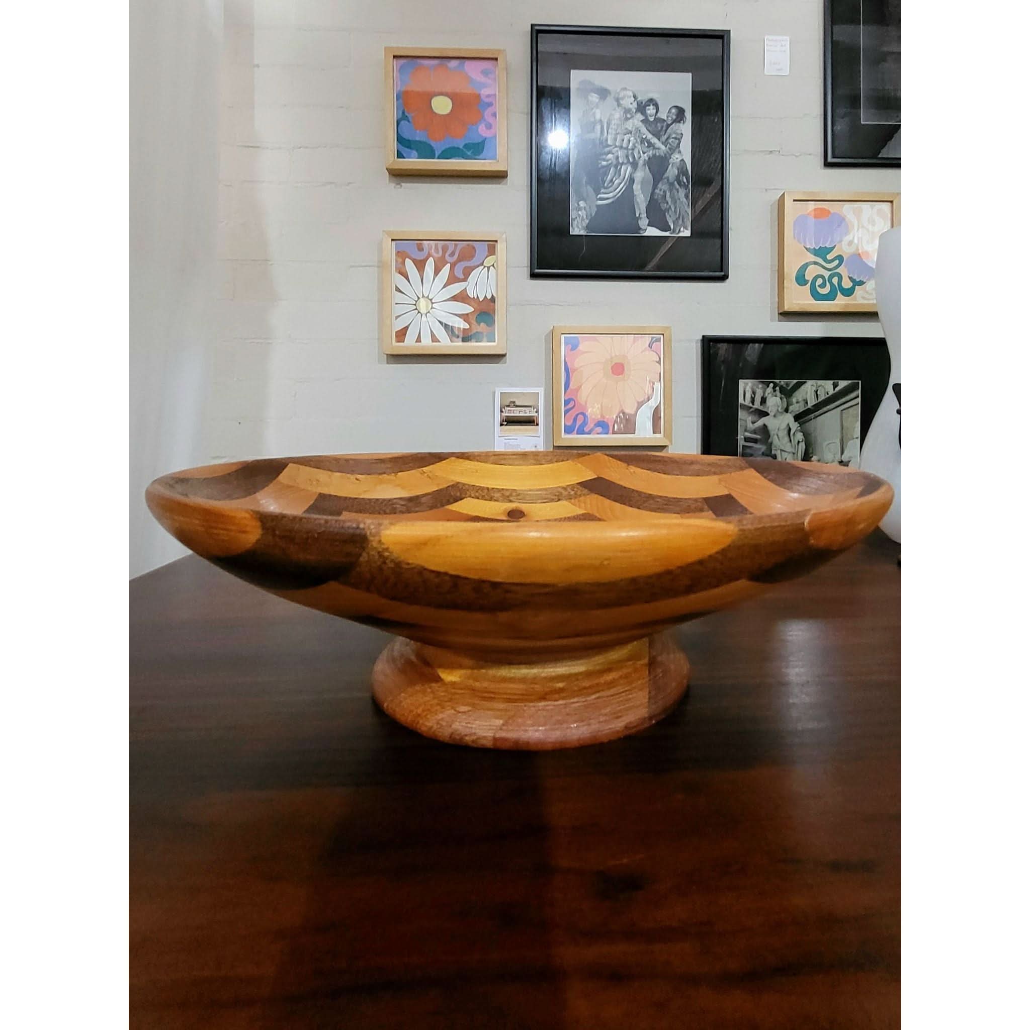 A sculptural centrepiece crafted from richly toned wood, this large hand-turned bowl is a celebration of natural beauty and craftsmanship. The geometric patterning highlights the contrast between each timber segment, creating a striking yet organic aesthetic.