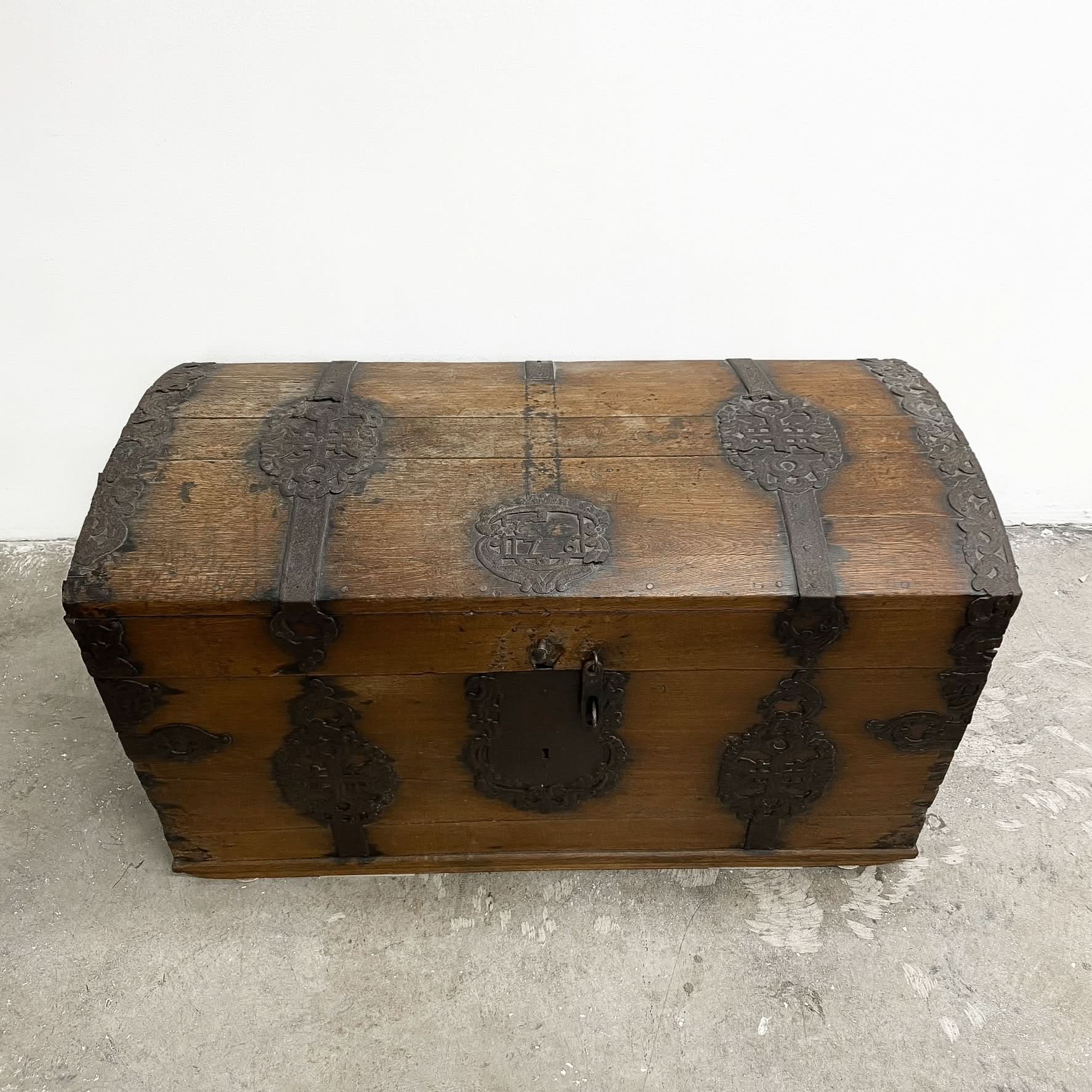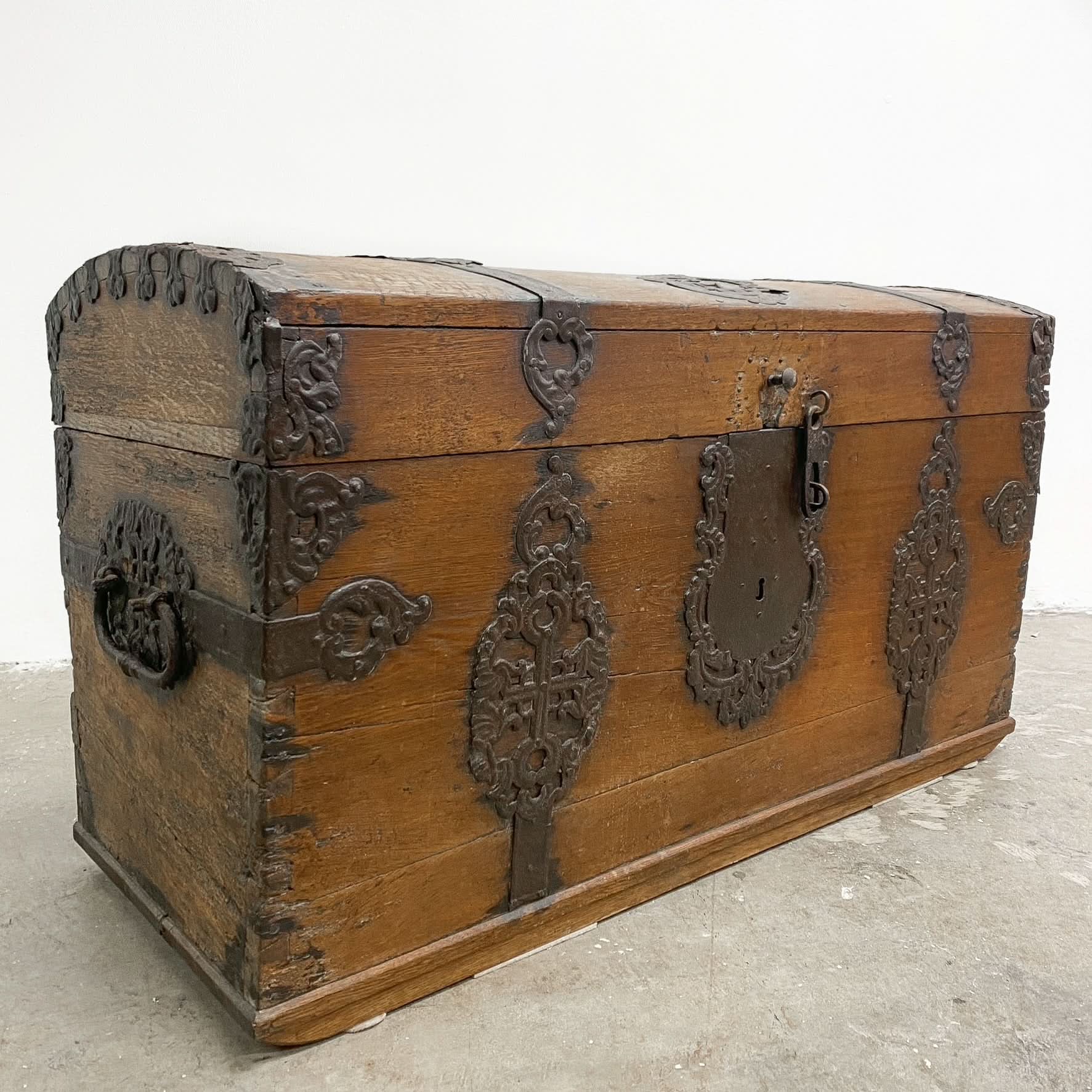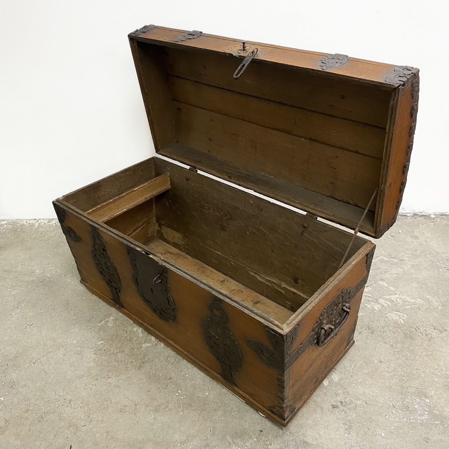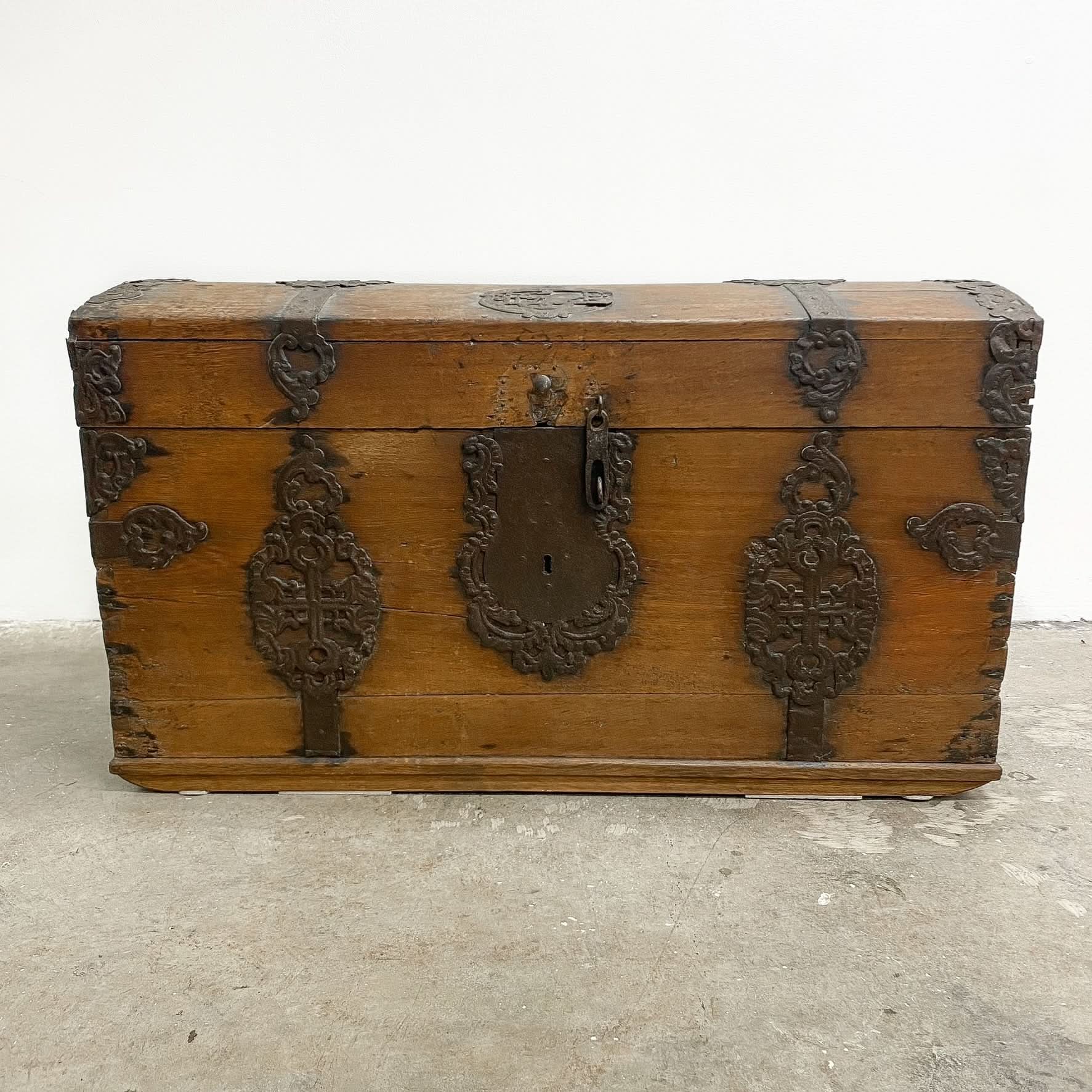 Great patina and wear with bits missing from the ironwork as you would expect from something that probably travelled the high seas many times. If only this chest could talk!