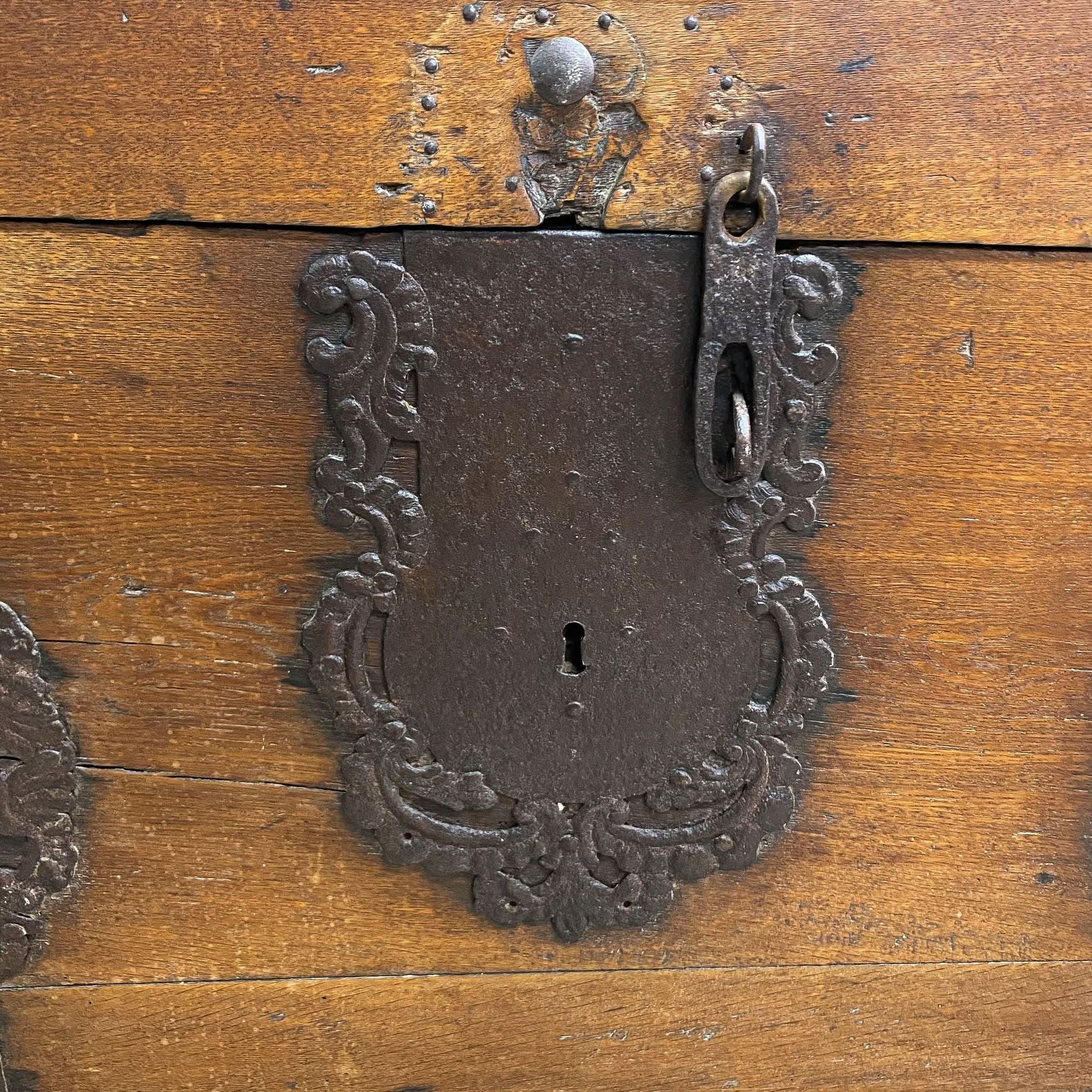Amazing Antique 18th Century Dutch oak chest/trunk with ornate iron bound strap work and corners. There is a date on the ironwork and can make out 17?6, so it's anywhere from 1706 to 1796.