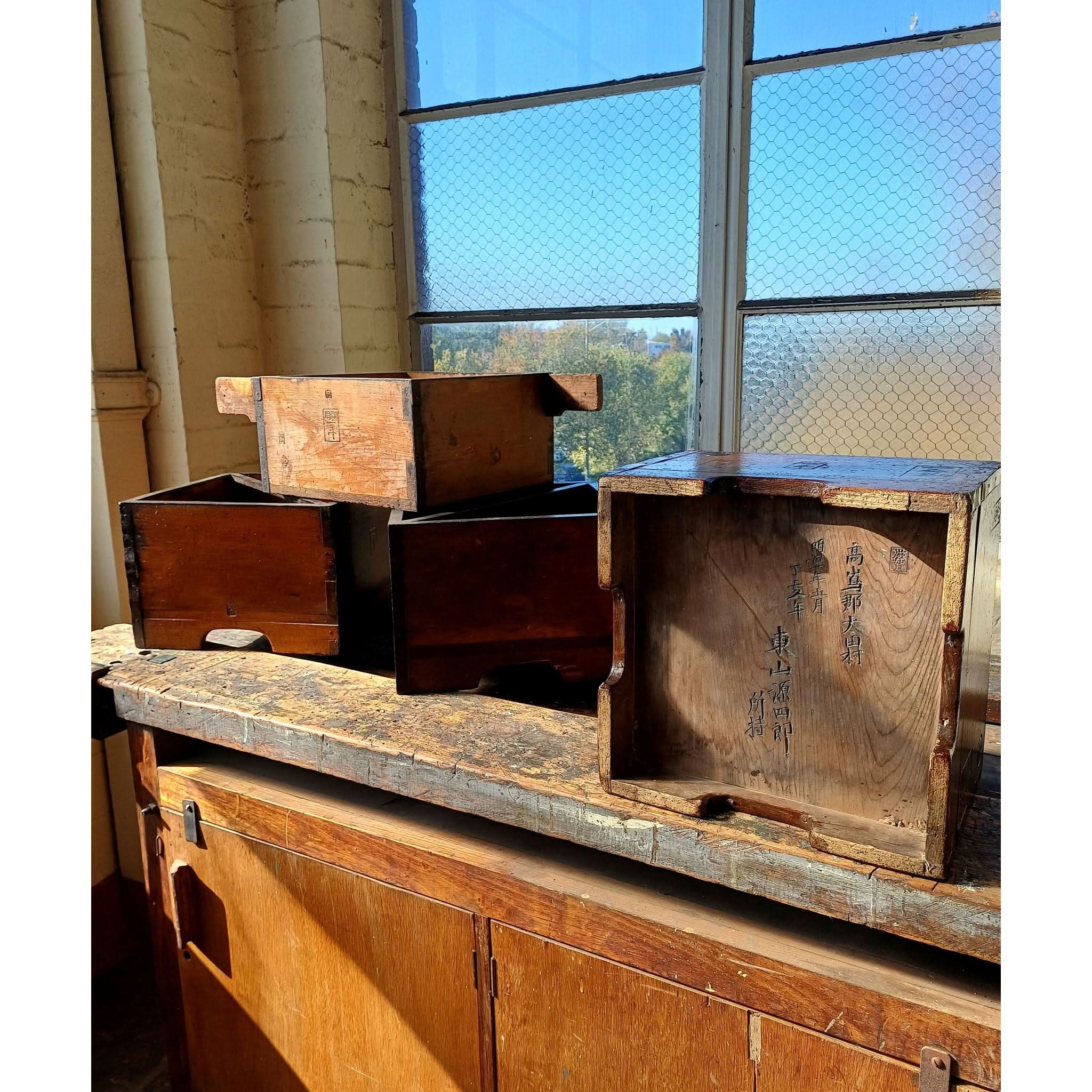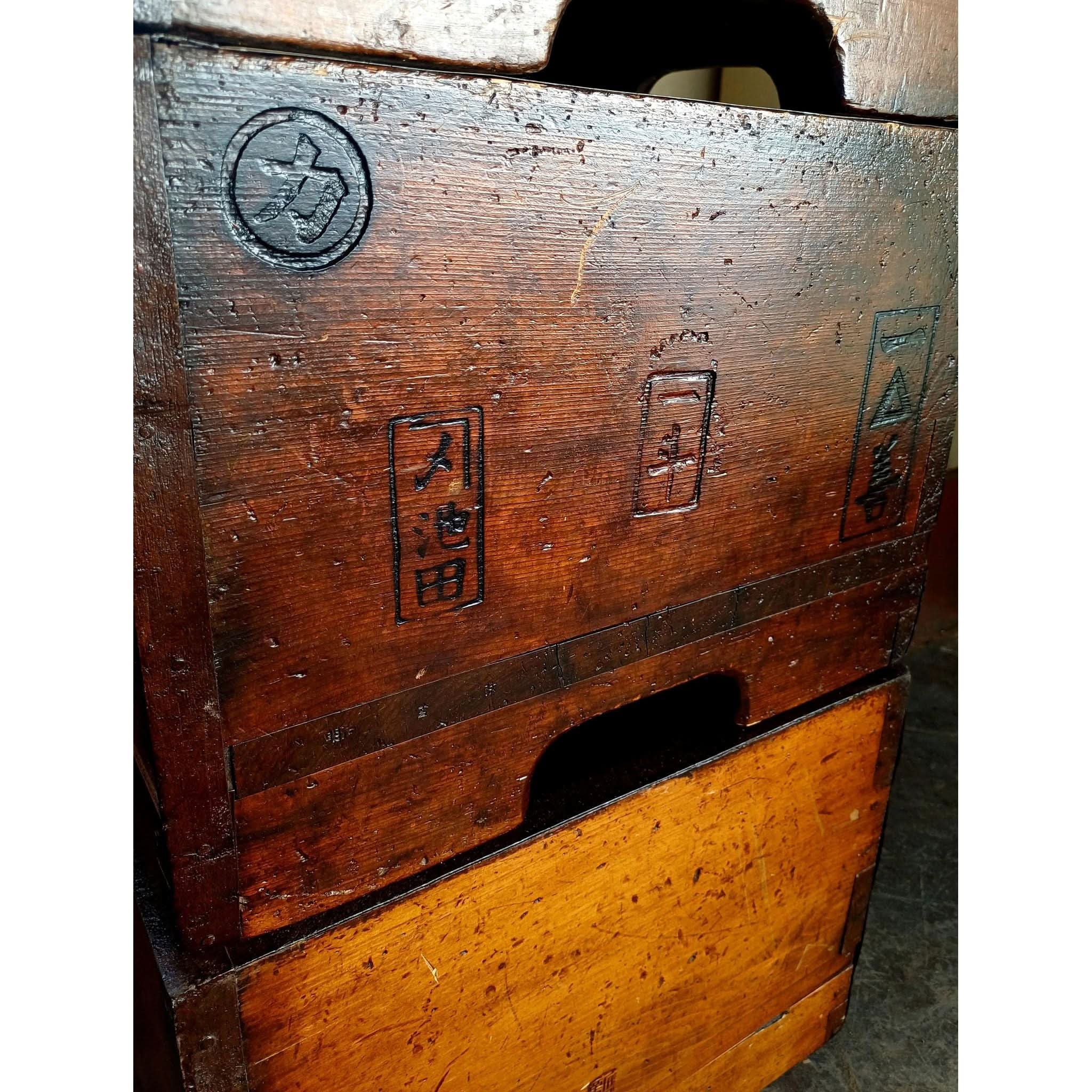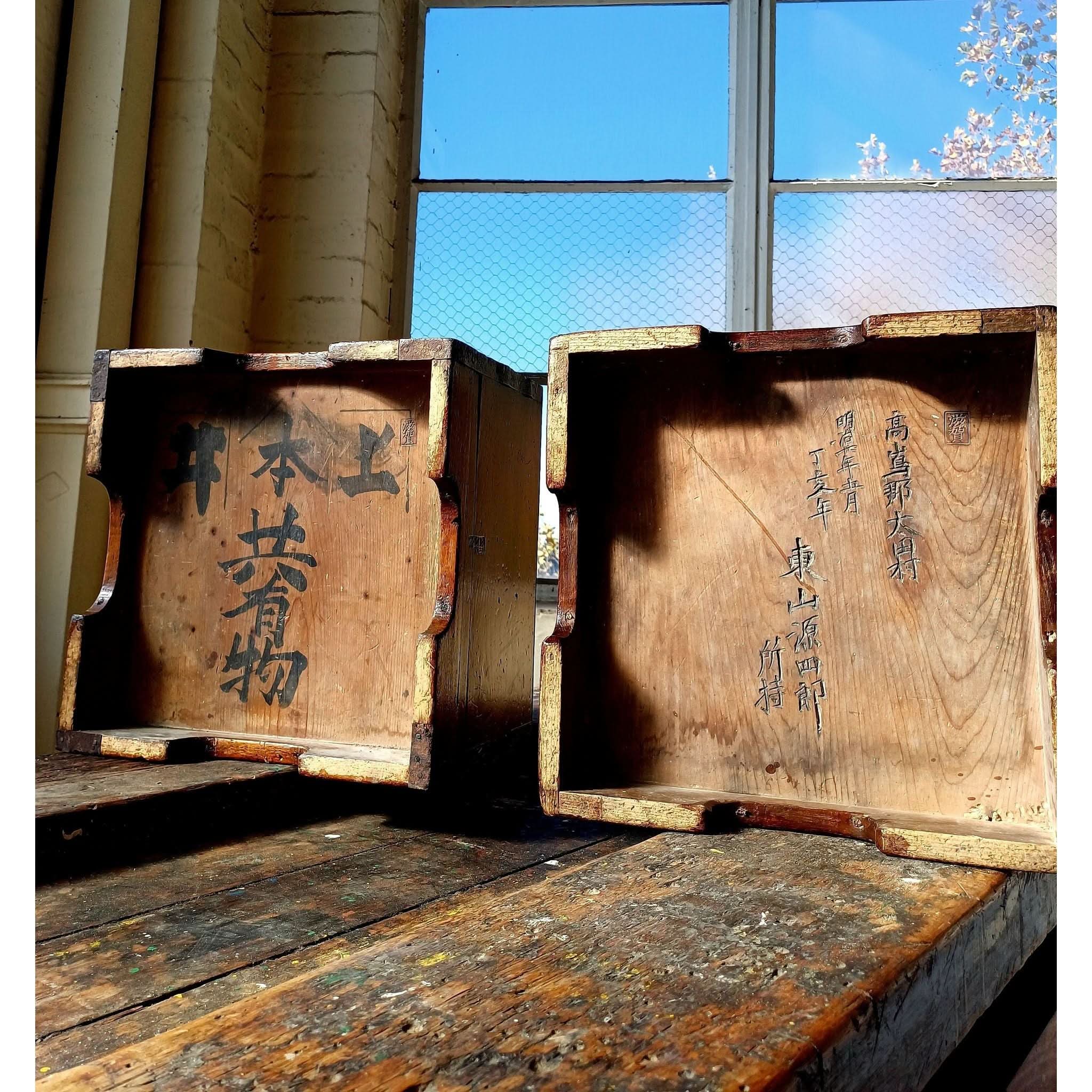 Antique handmade Japanese Itomatsu boxes. Pre-metric measuring devices with set dimensions for use in agriculture to transport, store and measure grains. Adorned with stamps, branding and kanji, these boxes give hints of their histories over the past >100 years ago. For example, one box reveals that it was owned by a Higashiyama Genshirō from Ōmizo village, Takashima district of Shiga Prefecture, during October 1902 (Meiji 35). Located on the western shore of lake Biwa, Takashima is noted for its woodwork production particularly in Hinoki timber. Hinoki is a type of cypress known for its beauty, durability, resistance to rot, decay, and pests. The perfect timber for the function