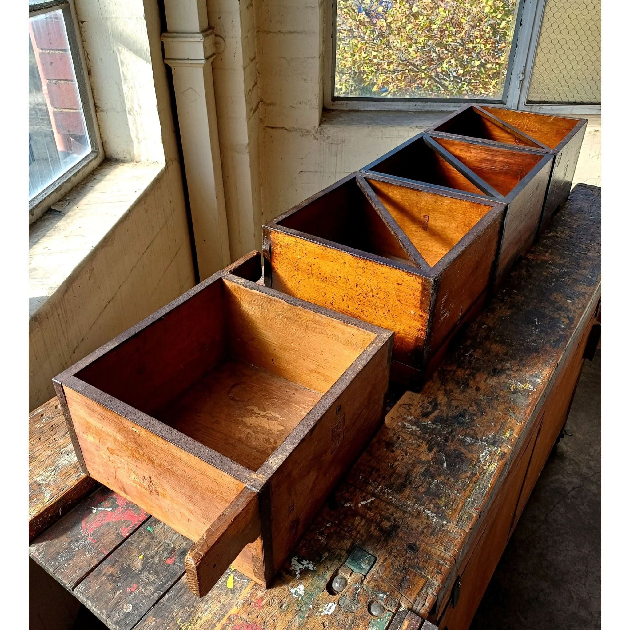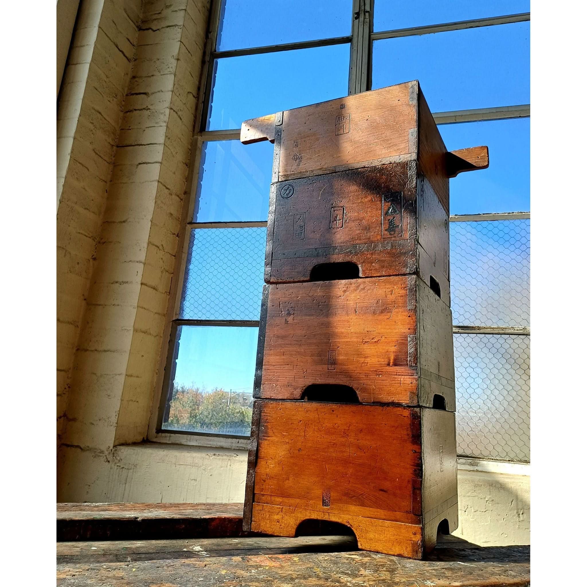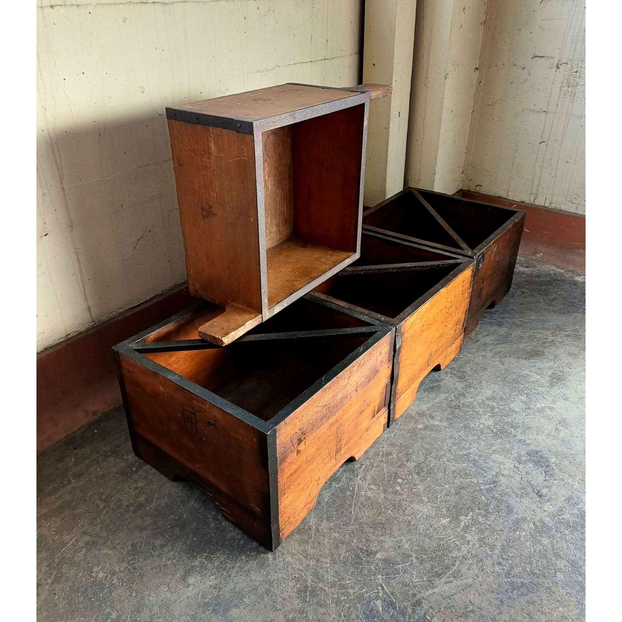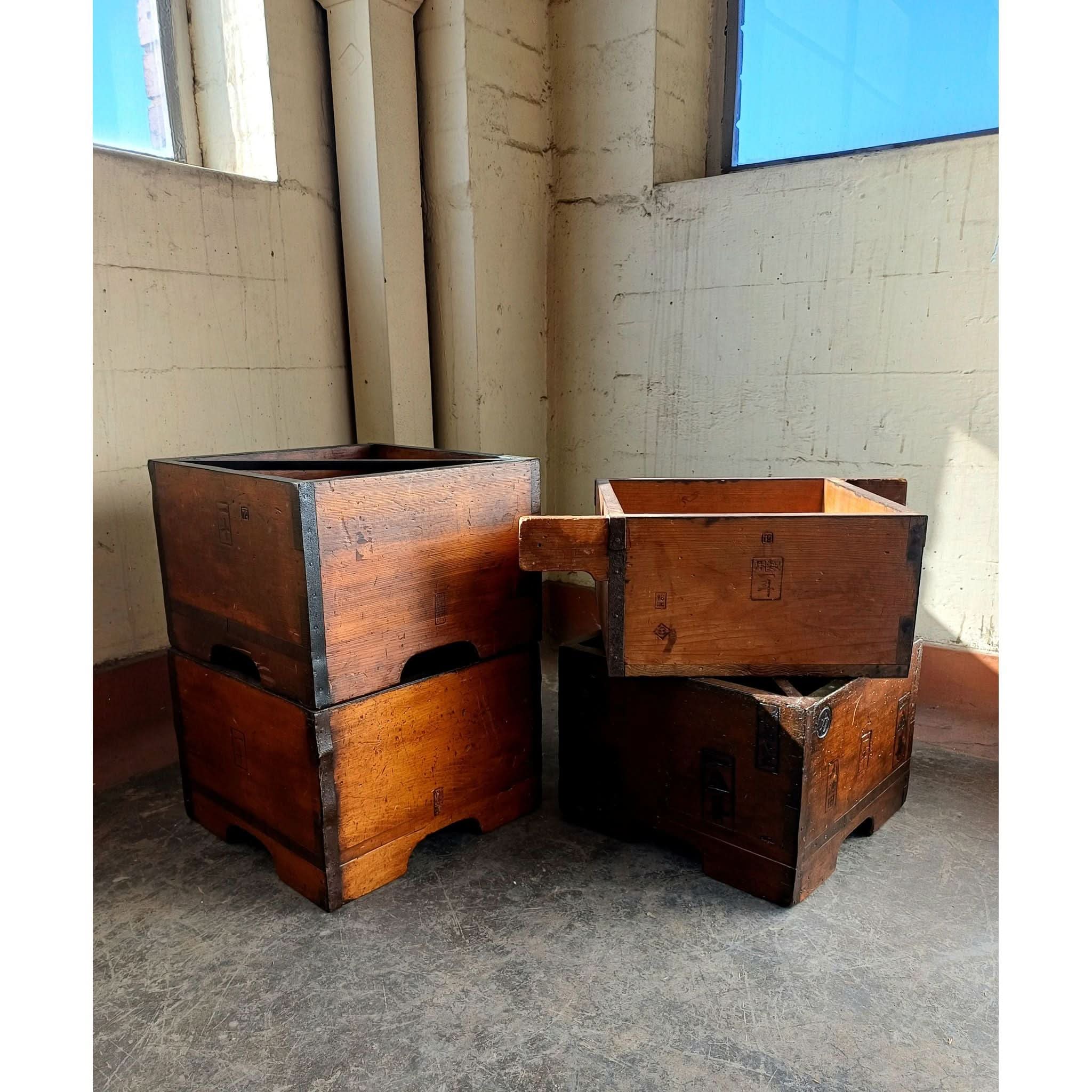 Antique handmade Japanese Itomatsu boxes. Pre-metric measuring devices with set dimensions for use in agriculture to transport, store and measure grains. Adorned with stamps, branding and kanji, these boxes give hints of their histories over the past >100 years ago. For example, one box reveals that it was owned by a Higashiyama Genshirō from Ōmizo village, Takashima district of Shiga Prefecture, during October 1902 (Meiji 35). Located on the western shore of lake Biwa, Takashima is noted for its woodwork production particularly in Hinoki timber. Hinoki is a type of cypress known for its beauty, durability, resistance to rot, decay, and pests. The perfect timber for the function