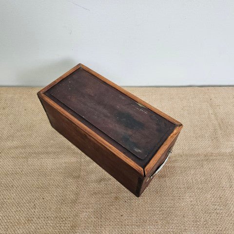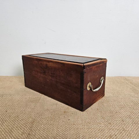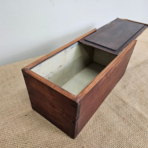This antique wooden storage box features a sliding top with a beveled lid that runs through carved side grooves. Slide-top boxes like this were widely used in the 19th and early 20th centuries for household and workshop storage. Today it works well as a decorative storage piece for keepsakes, letters, or small trinkets.