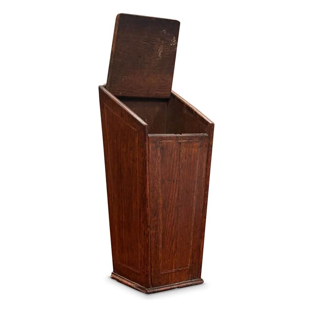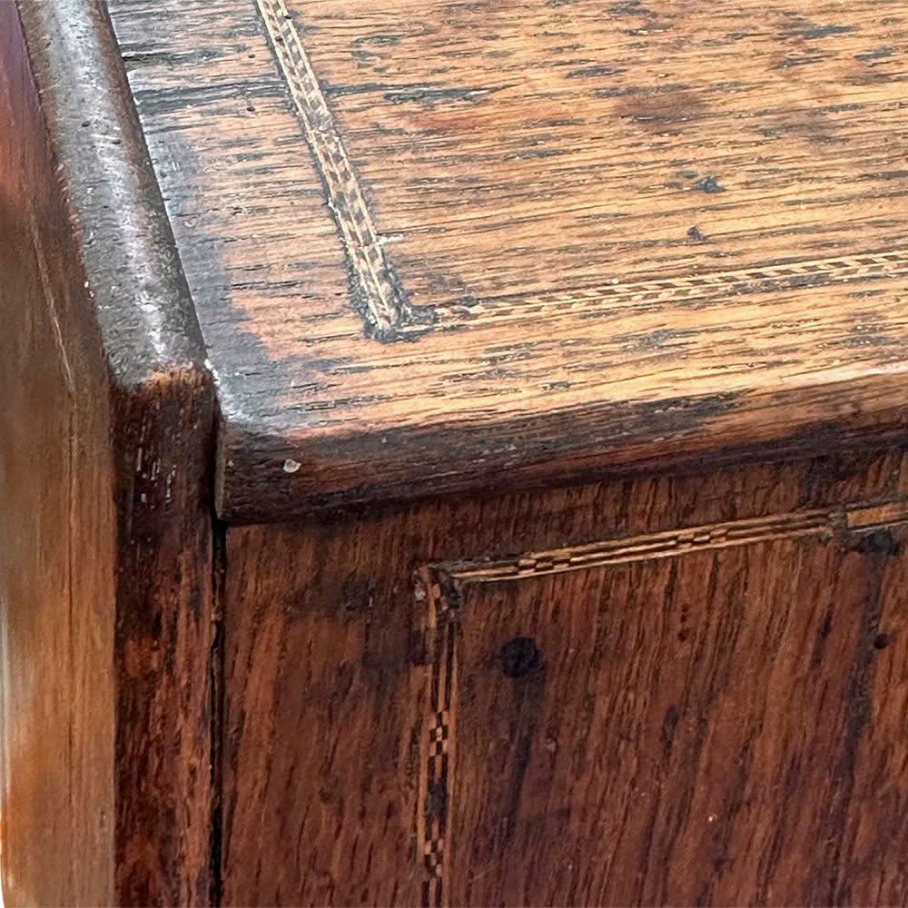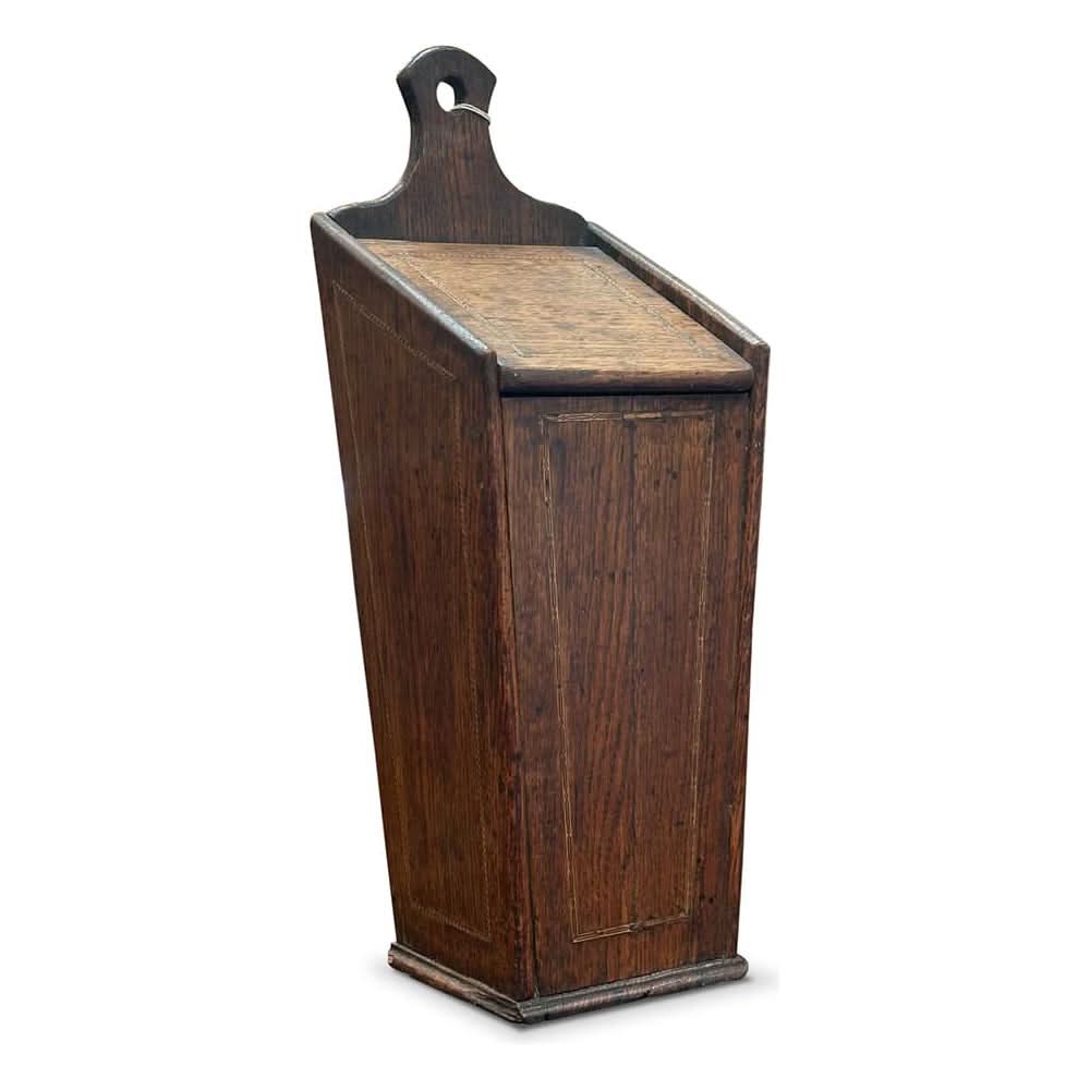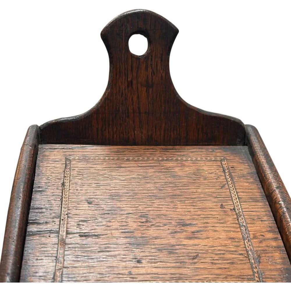 Crafted from English oak, this humble box features a lift up lid and lovely inlays in the wood. It would have been used to store candles.
