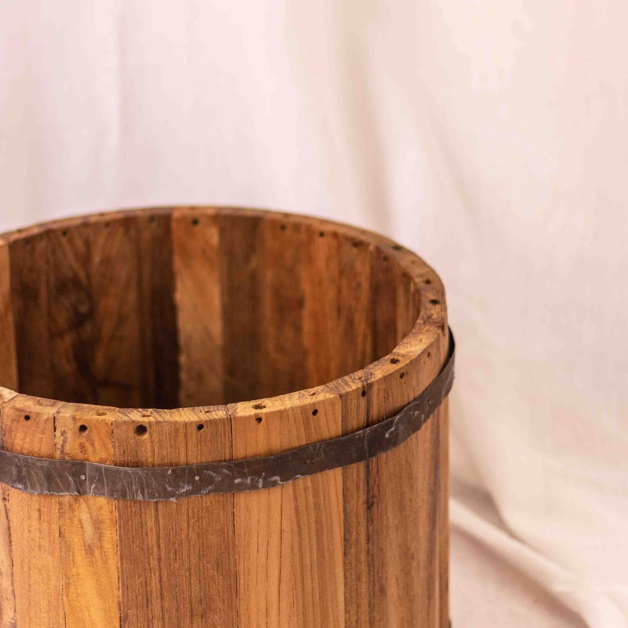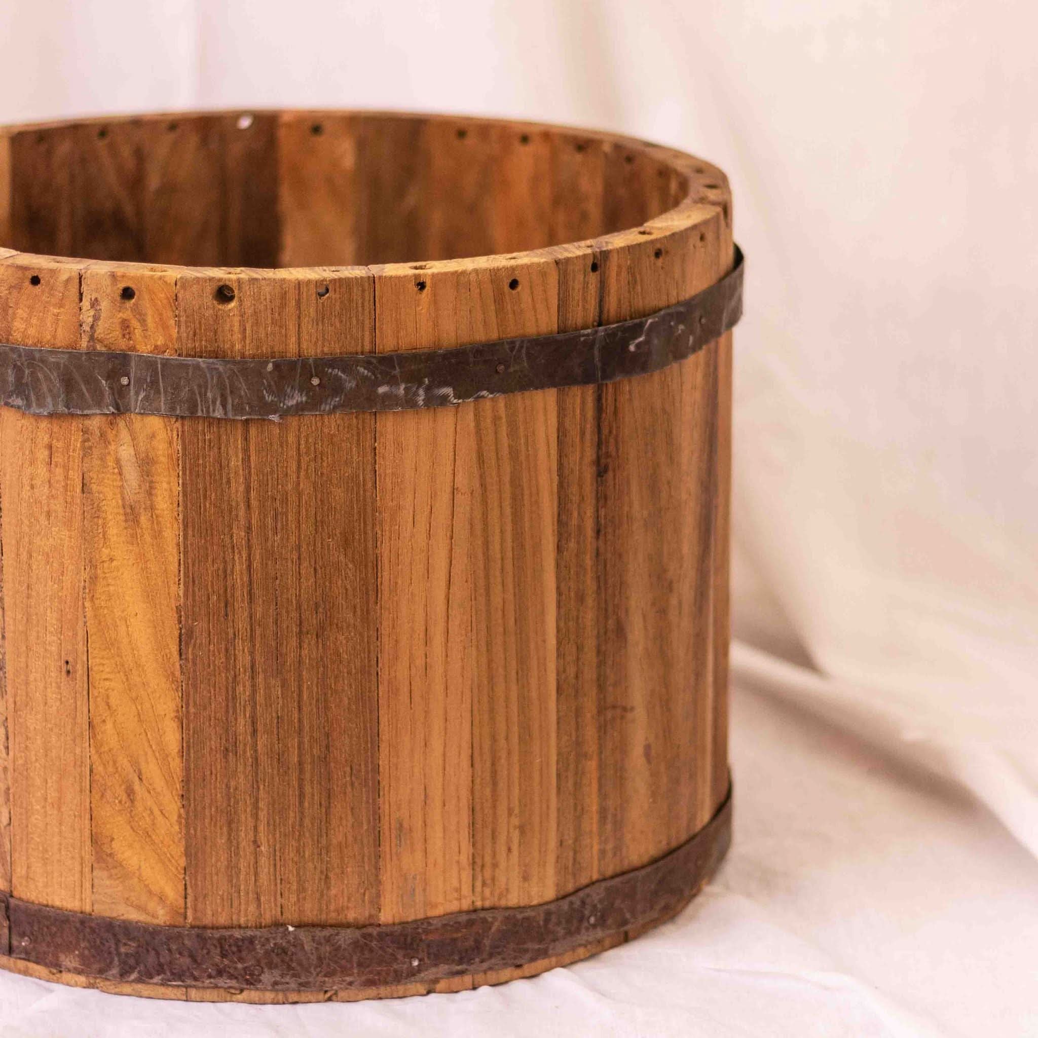 A unique round wooden bucket with metal detail. This lovely piece will make the perfect statement piece in your home and feature original hardware and a rustic patina.