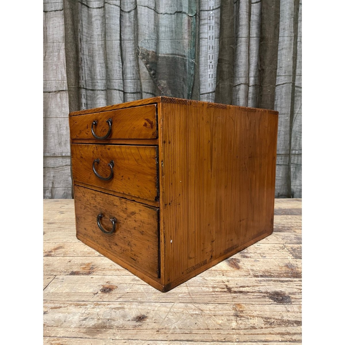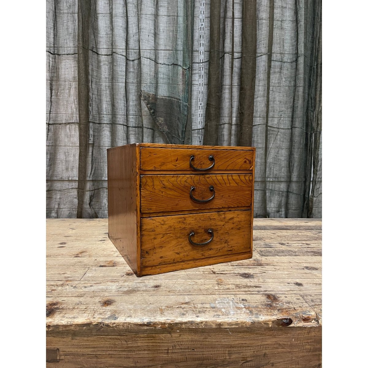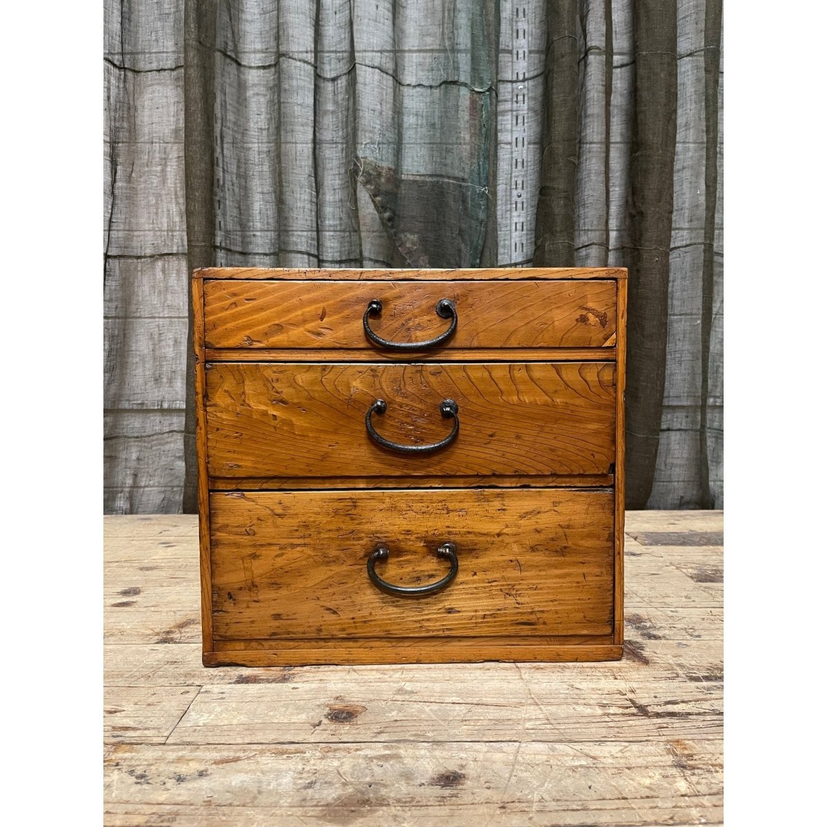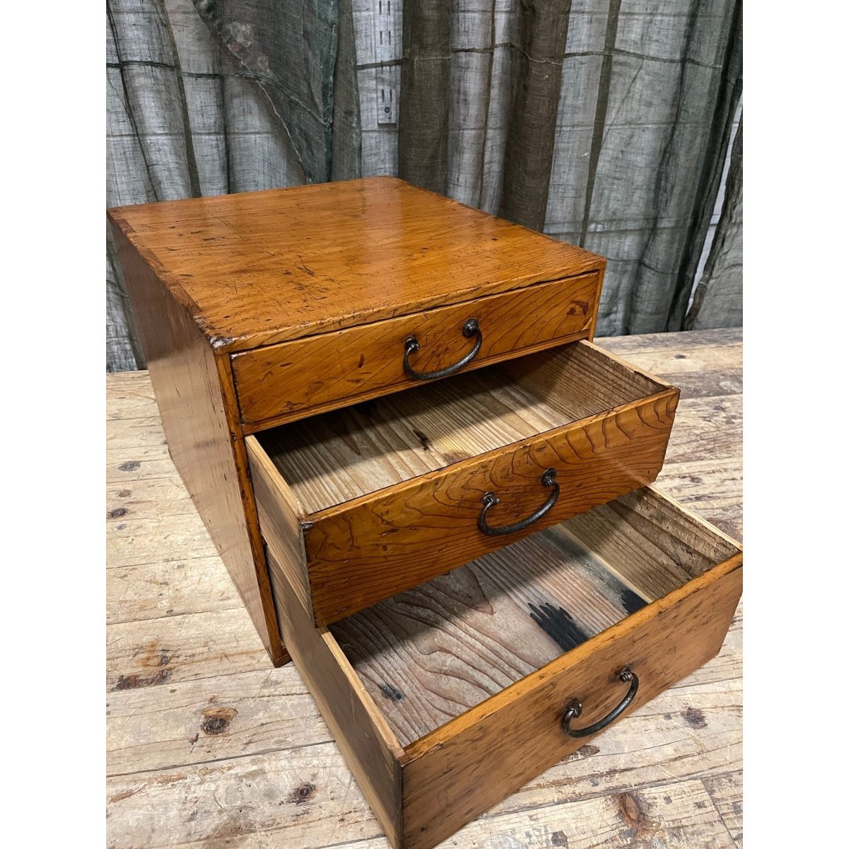 A Japanese three -drawer document box , made from hinoki (cypress) wood.