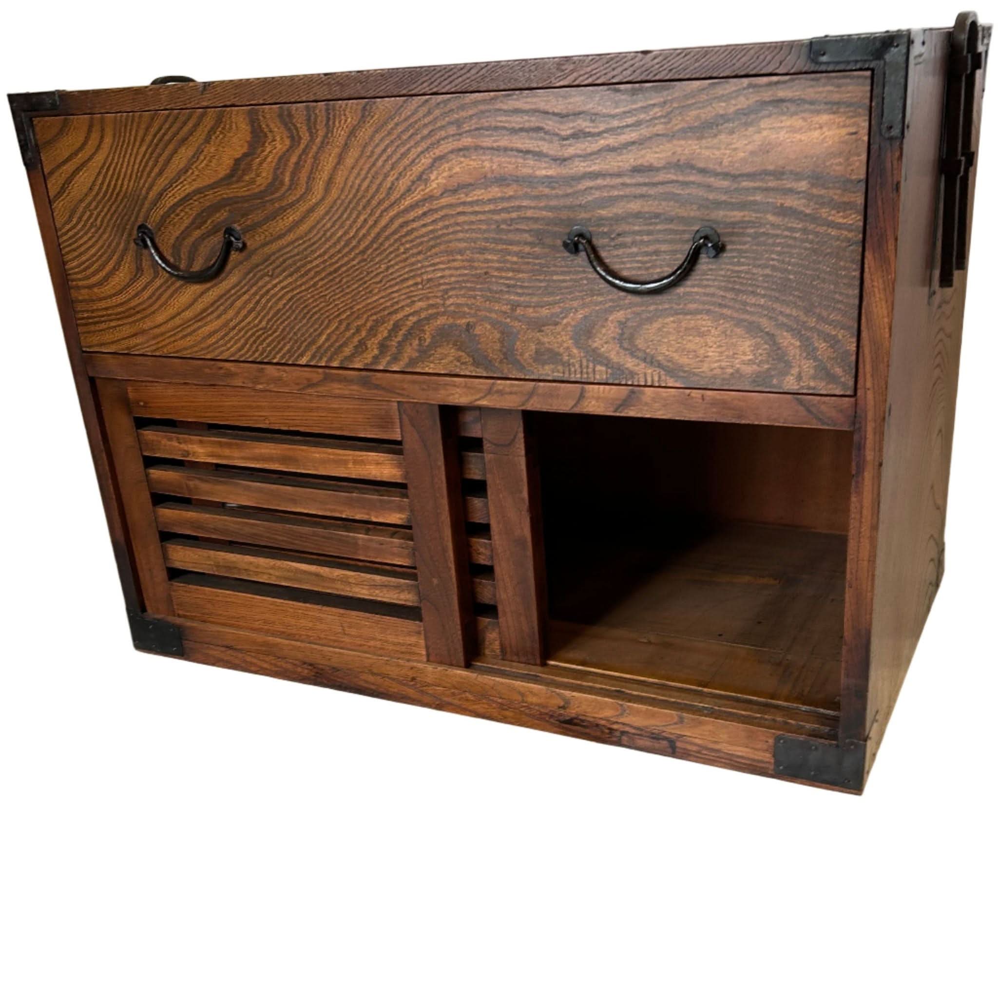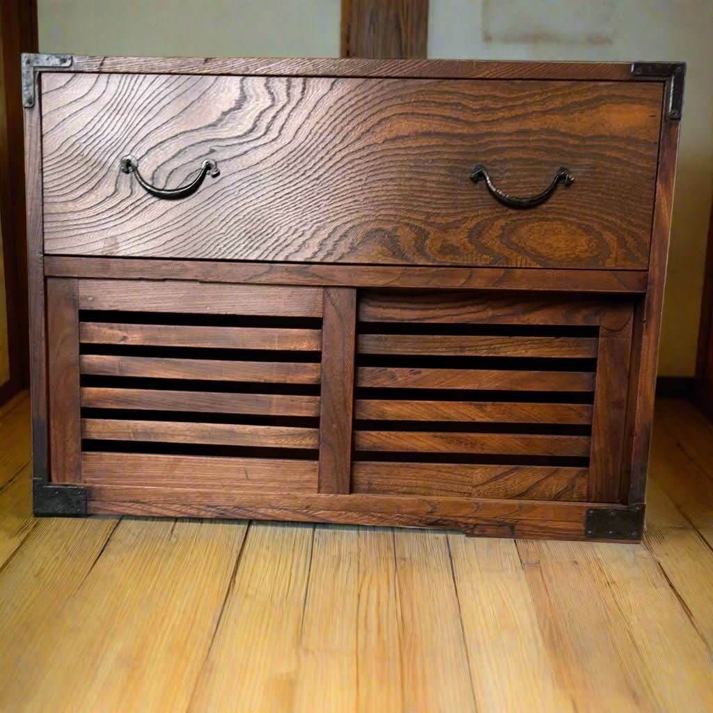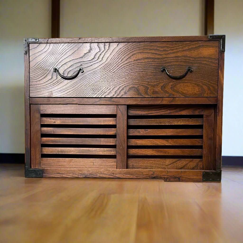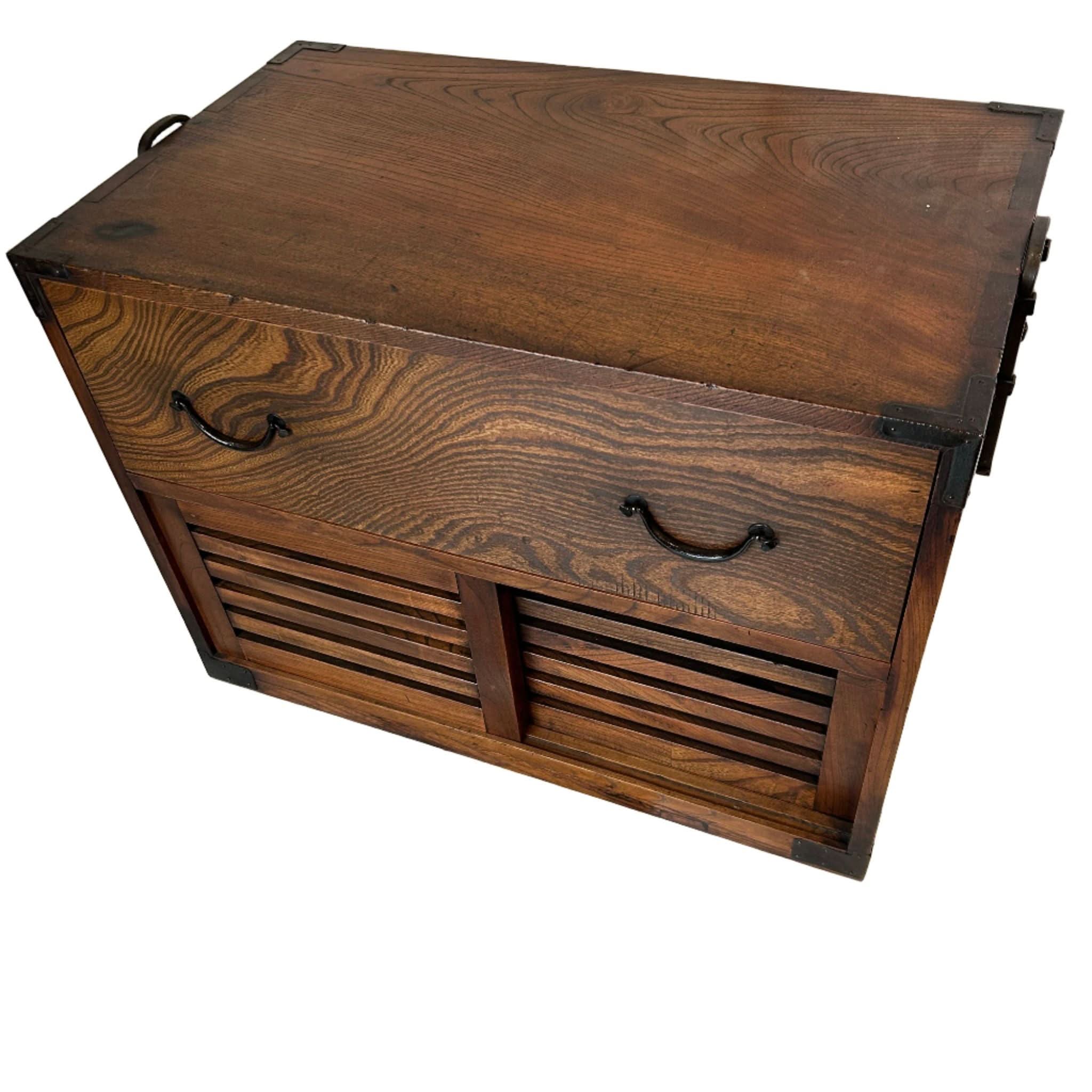 A Japanese zelkova (keyaki) wood chest with iron hardware.