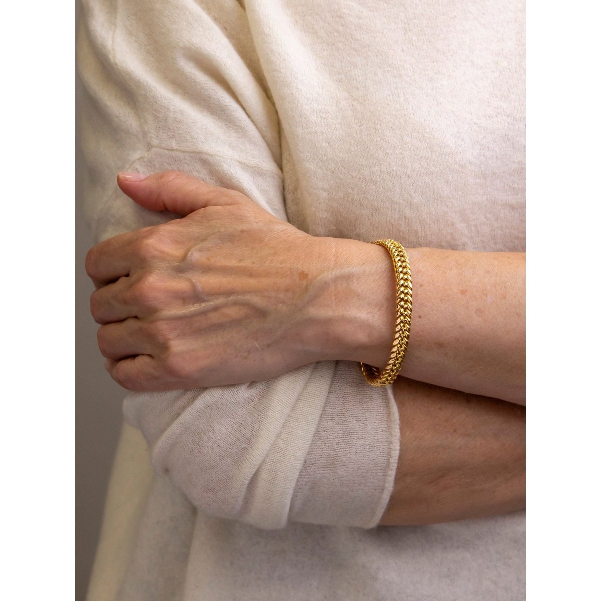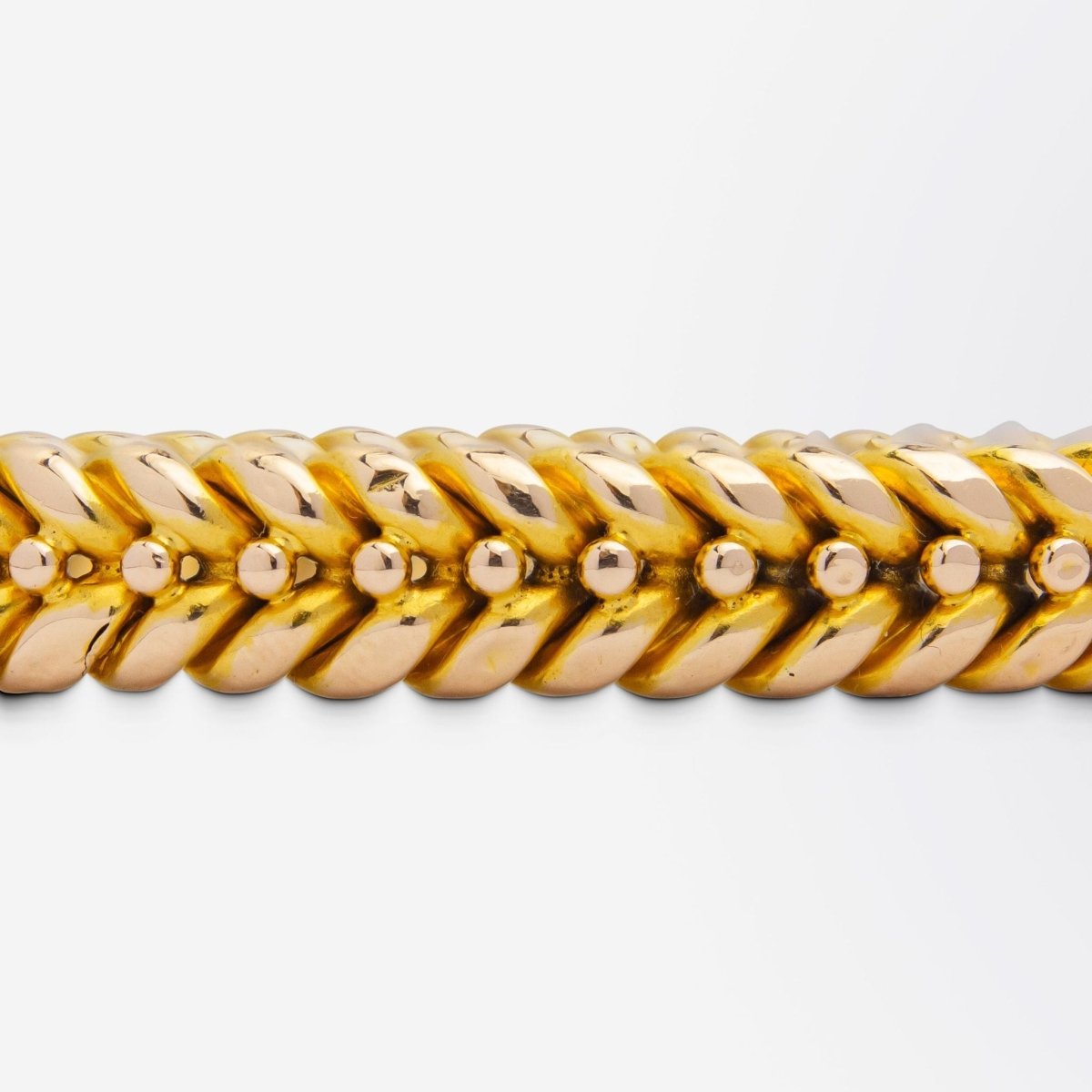 This delightful antique bracelet was likely made in England at the turn of last century. Crafted from 15 karat yellow gold, this is often what is referred to as an 'illusion' bracelet, because of the optical illusion it displays when looked at front on. The hollow bracelet is hinged so it can fit over the hand, and terminates with a tongue and box clasp with attached safety chain. The bracelet is a perfect piece to stack with multiple other gold bangles and chains to create a layered effect. The piece presents in good antique condition with the usual minor dents and abrasions present associated with age and use. A lovely and very wearable piece of antique jewellery.