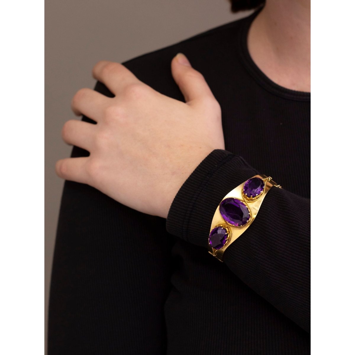 One of our favourite jewellery styles is Etruscan Revival, and this bangle is a lovely example of English jewellery from the last quarter of the 19th century. Crafted from 15 karat yellow gold the hinged oval bangle has been set to one side with three oval cut amethysts weighing approximately 53 carats in total. The amethysts are a typical stone used in English jewellery during the 1870s and 1880s, the era this bangle dates to, and paired with gold it creates a striking piece of jewellery. Surrounding the amethysts is some very fine twisted wirework which is a common feature in jewellery made in the Etruscan Revival taste. The bracelet terminates with a secure tongue and box clasp and features a fine gold safety chain for extra security. The piece is in very good antique condition, with minor wear to the surface of the gold and some abrasions to the facets of the amethyst, commensurate with age and use. An absolutely gorgeous example of Victorian period Etruscan Revival jewellery.