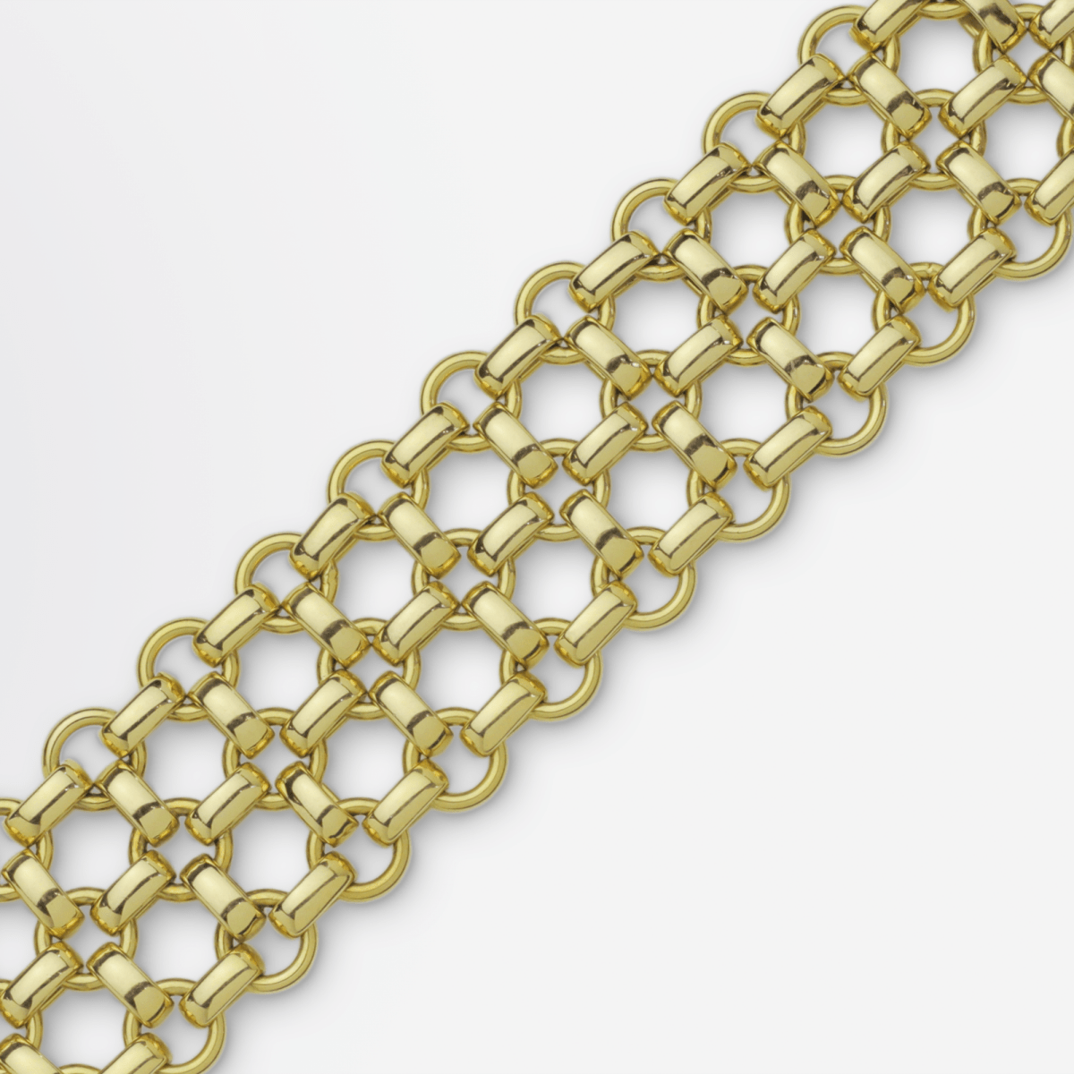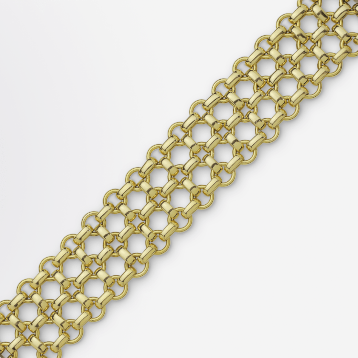 A bold 18 karat yellow gold fancy link bracelet in a lattice work style. The piece which is incredibly weighty consists of oval belcher and round wire gold links interconnected to form a lattice work mesh. There is a domed white gold 'bar' style clasp which is secure and working well. Unfortunately it is unmarked apart from a gold purity stamp, however is likely Italian in origin. A real knockout piece of gold armwear which due to its articulated construction is comfortable and heavenly to wear.