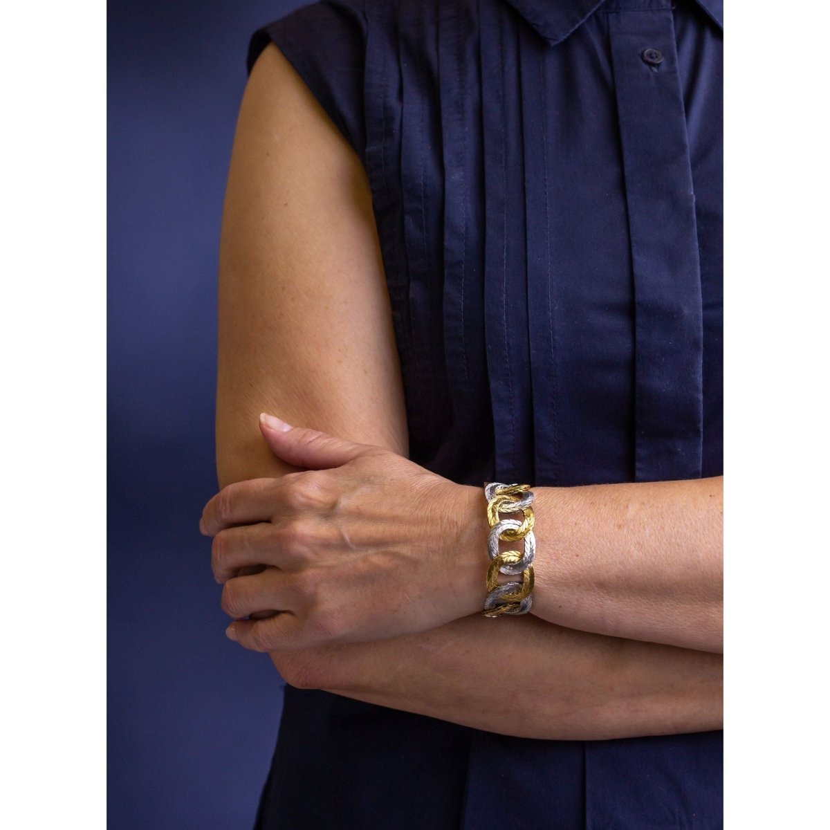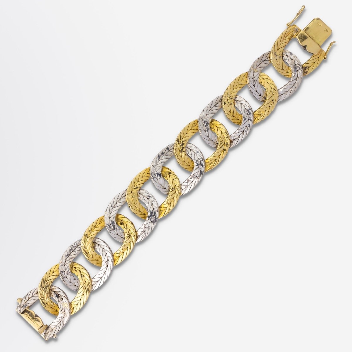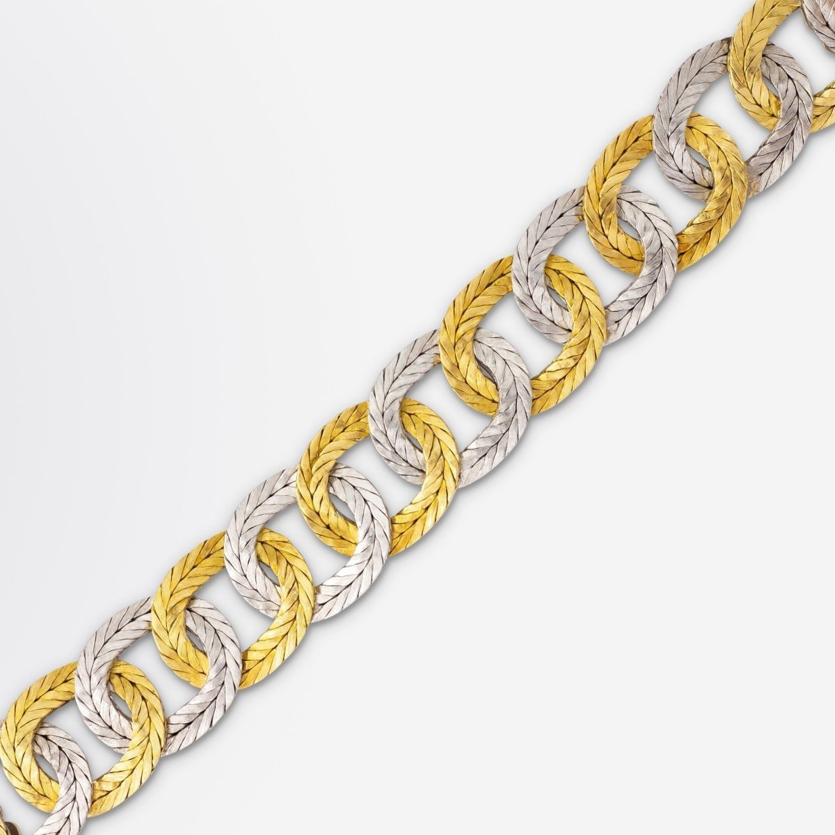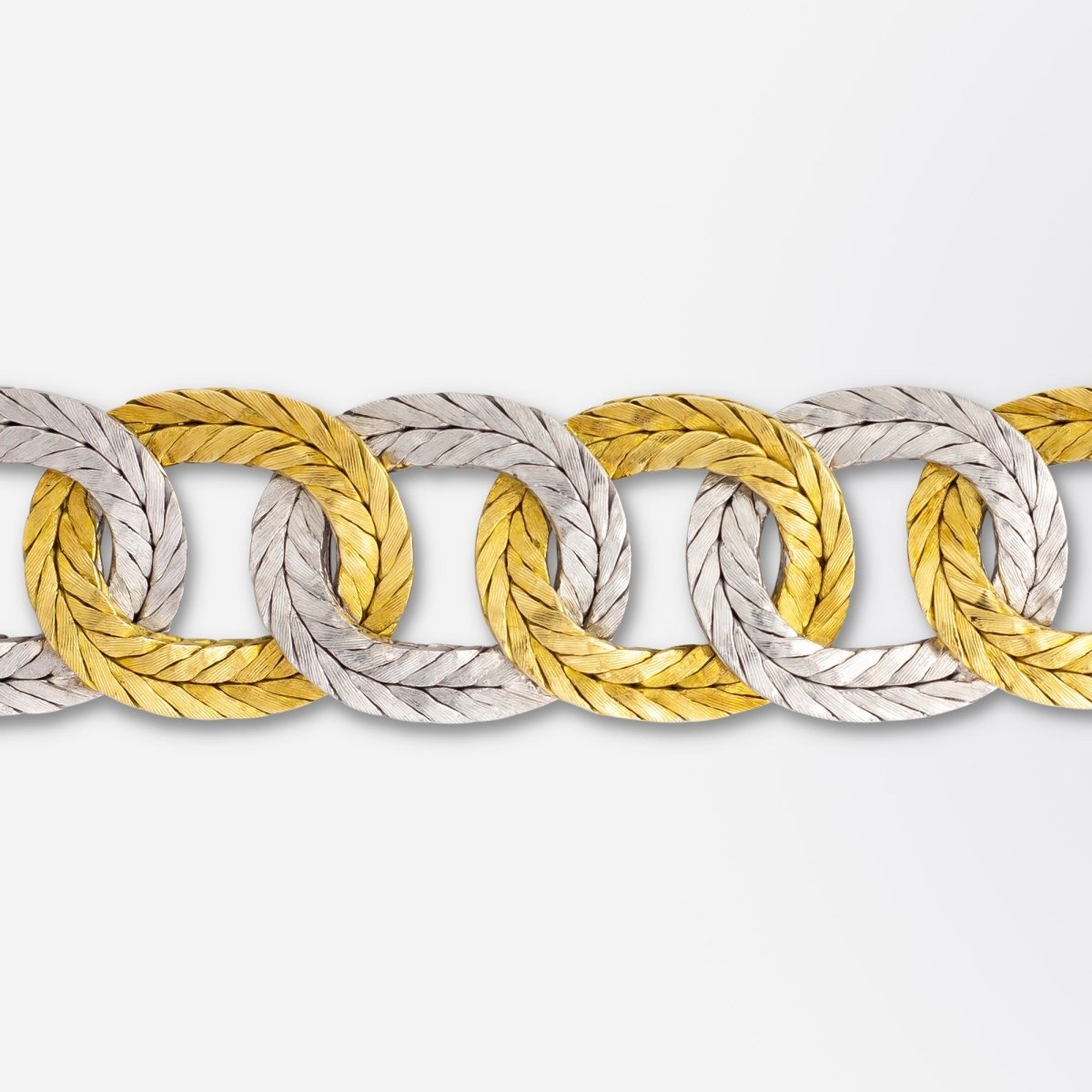We are very excited to present this wonderful handcrafted bracelet by Mario Buccellati. The two tone bracelet consists of woven gold ovals of alternating 18 karat yellow and 18 karat white gold that has been woven or braided. The interlocked links have then been very finely brushed to give a softer matte finish which could be described as a Florentine finish. The bracelet features a tongue and box clasp and two figure of eight safety catches which are all incorporated into an integrated link clasp. The clasp and safety catches are working well and are secure, ensuring the piece stays on tightly with three points of attachment. Whilst this bracelet is on the smaller side in terms of its circumference it certainly makes up for that in its quality craftsmanship by arguably Italy's most highly regarded goldsmith, Mario Buccellati. Whilst it is hard to give a precise date for its manufacture it is likely to date to the late 20th Century. An exceptional piece of Italian gold jewellery.