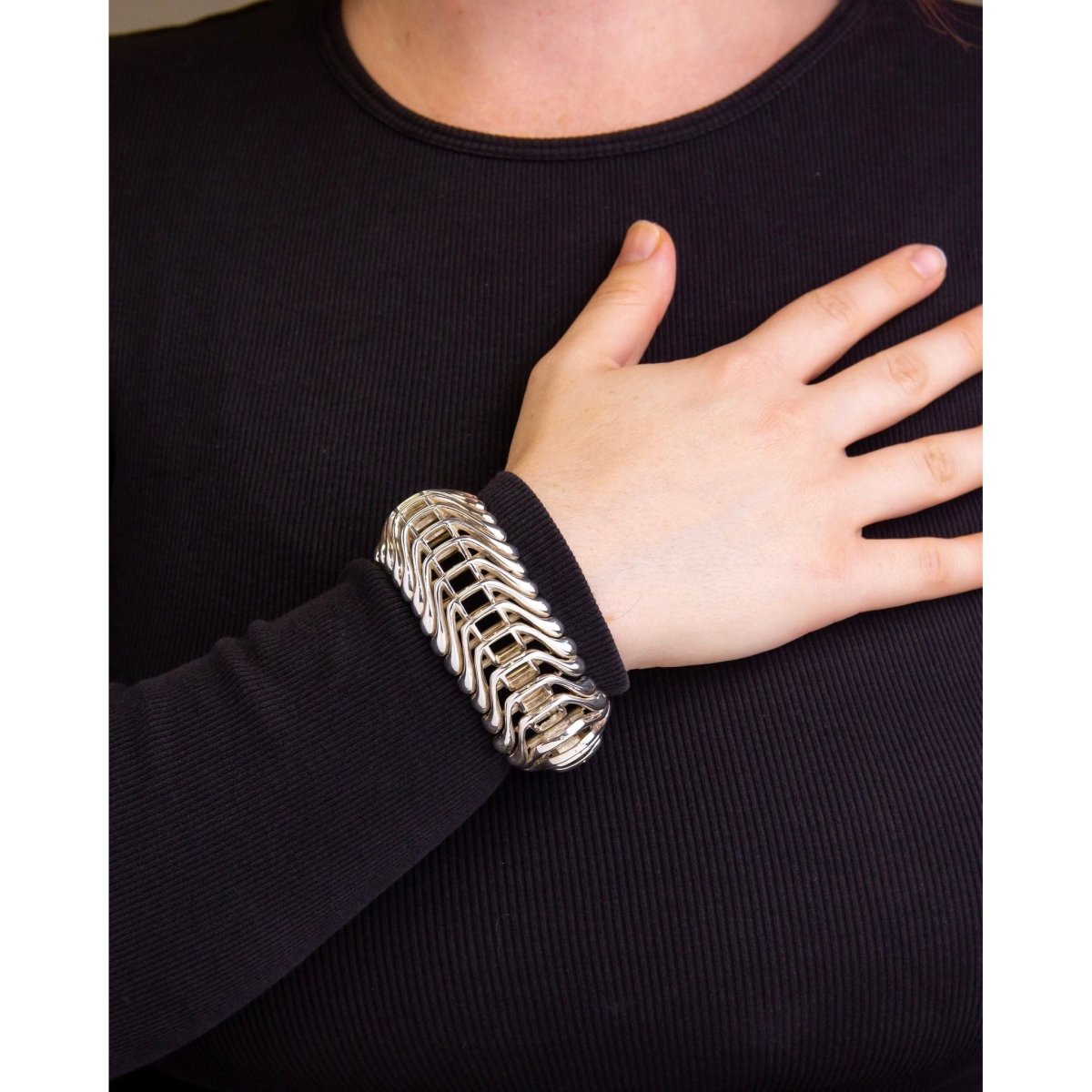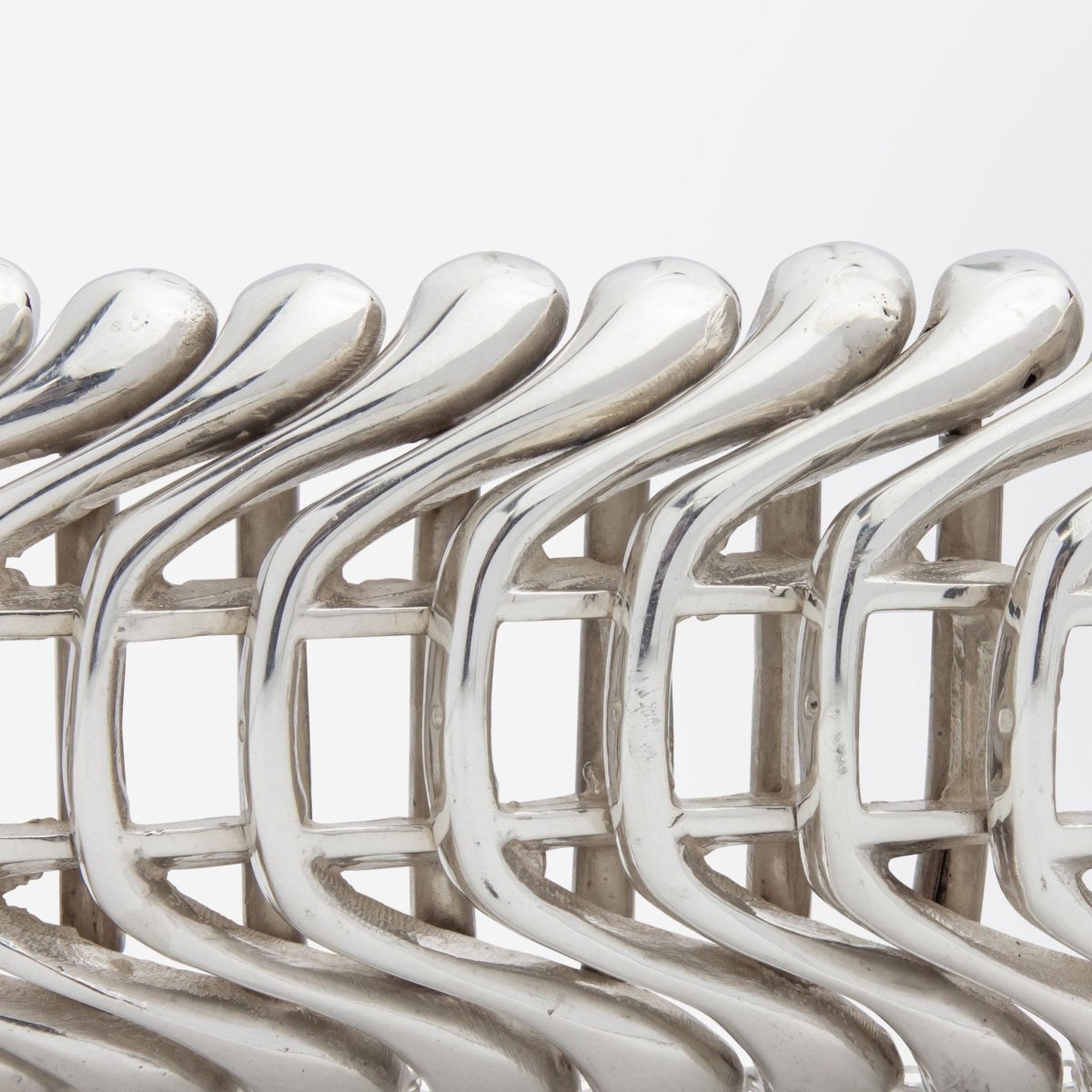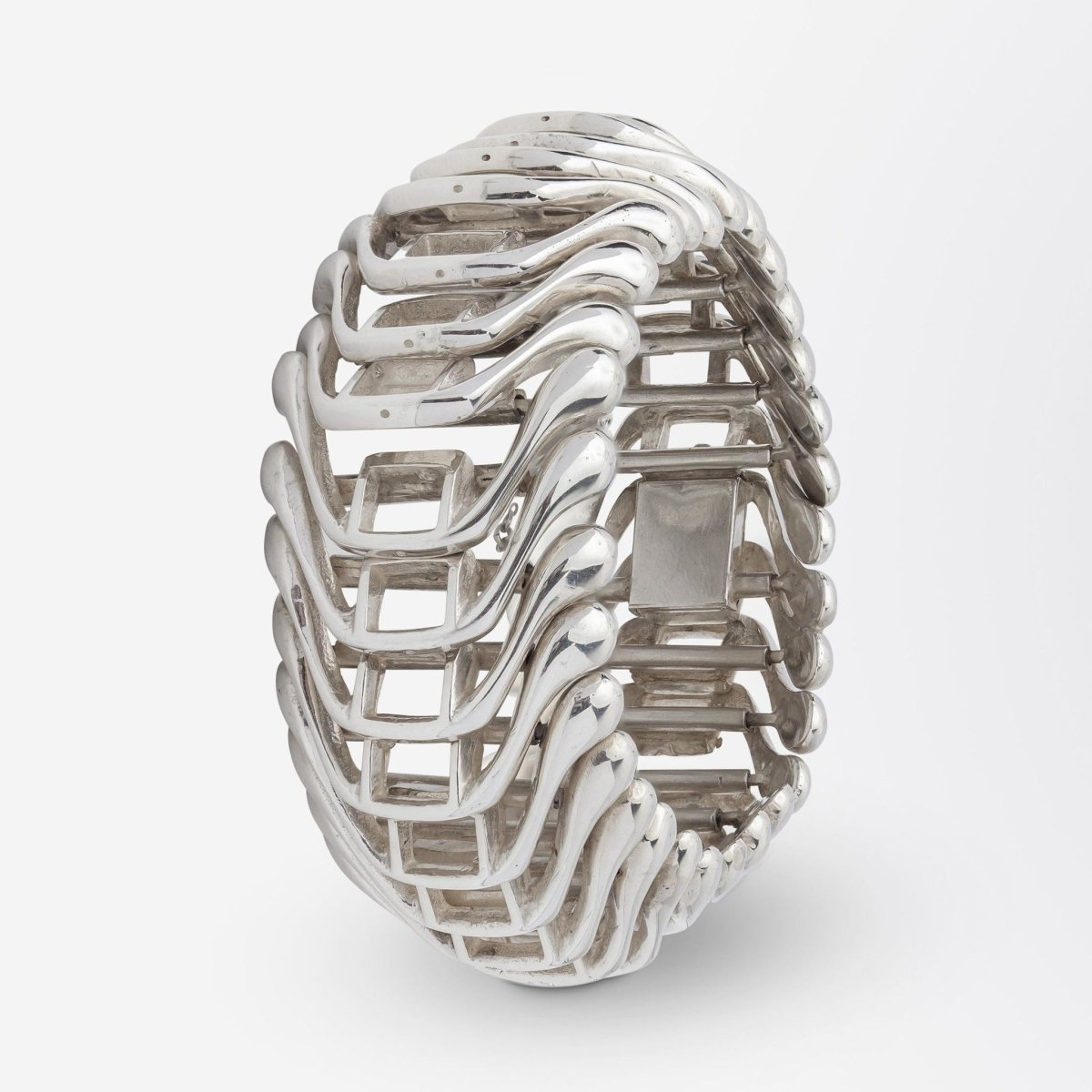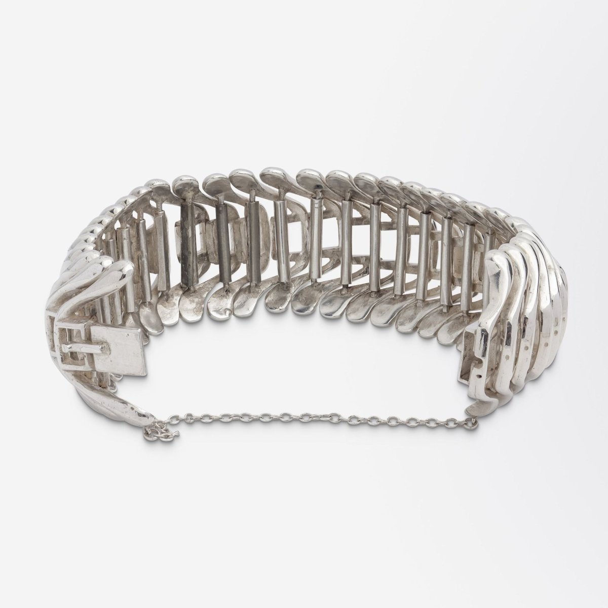 Crafted during the mid 20th century this bracelet is reminiscent of the designs produced by Scandinavian silversmiths in the 1960s and 1970s. The unmarked bracelet has been tested as sterling silver, is articulated, and terminates with a tongue and box clasp and attached safety chain. Whilst unmarked the bracelet could be inspired by some of the designs coming out of Georg Jensen in the mid to late 20th century or a silversmith like Hans Hansen or Bent Knudsen from the same era. The interesting design is almost reminiscent of vertebrae or the skeletal system and is undeniably modernist in style. In lovely condition and with a great amount of weight this piece would be a beautiful addition to a silver jewellery collection.