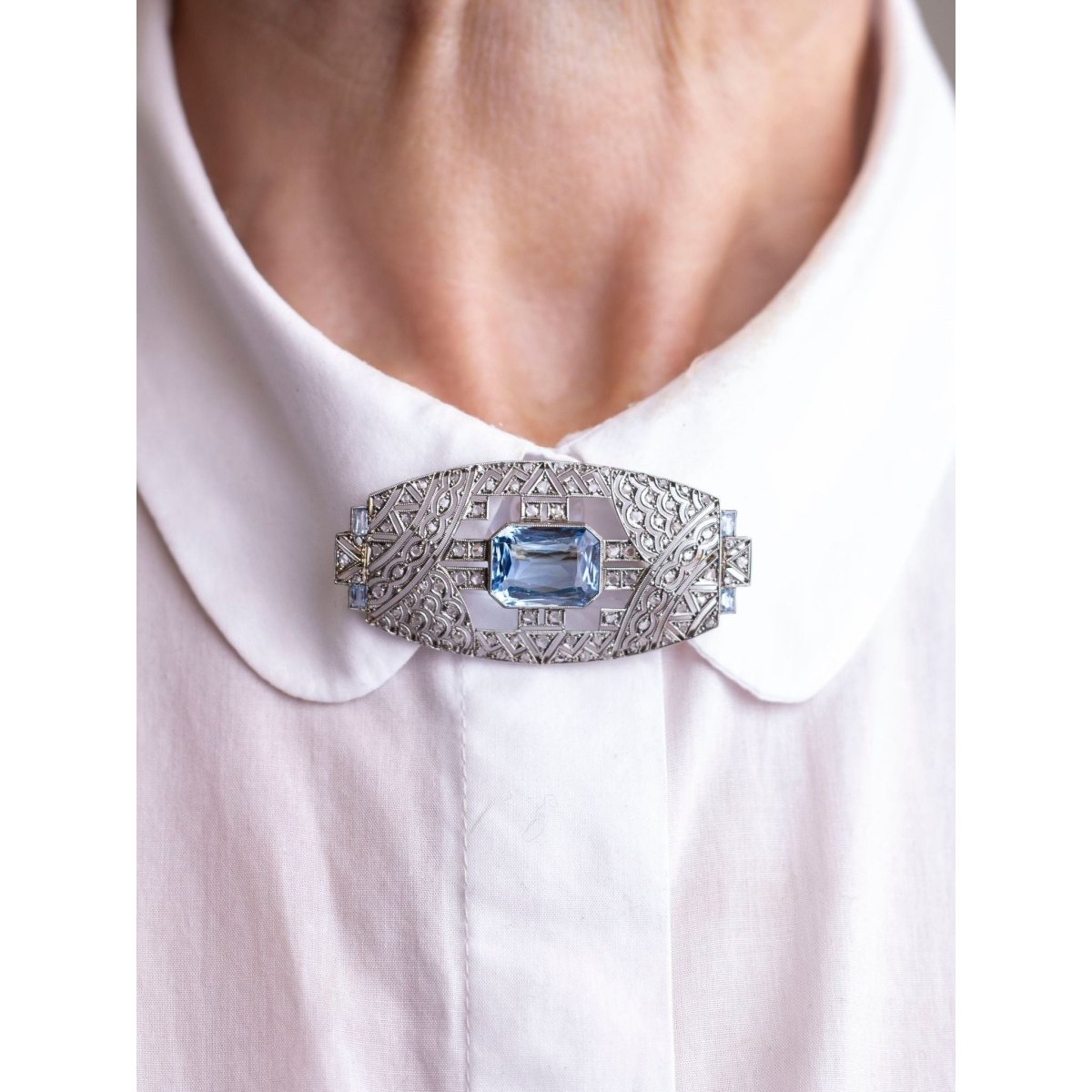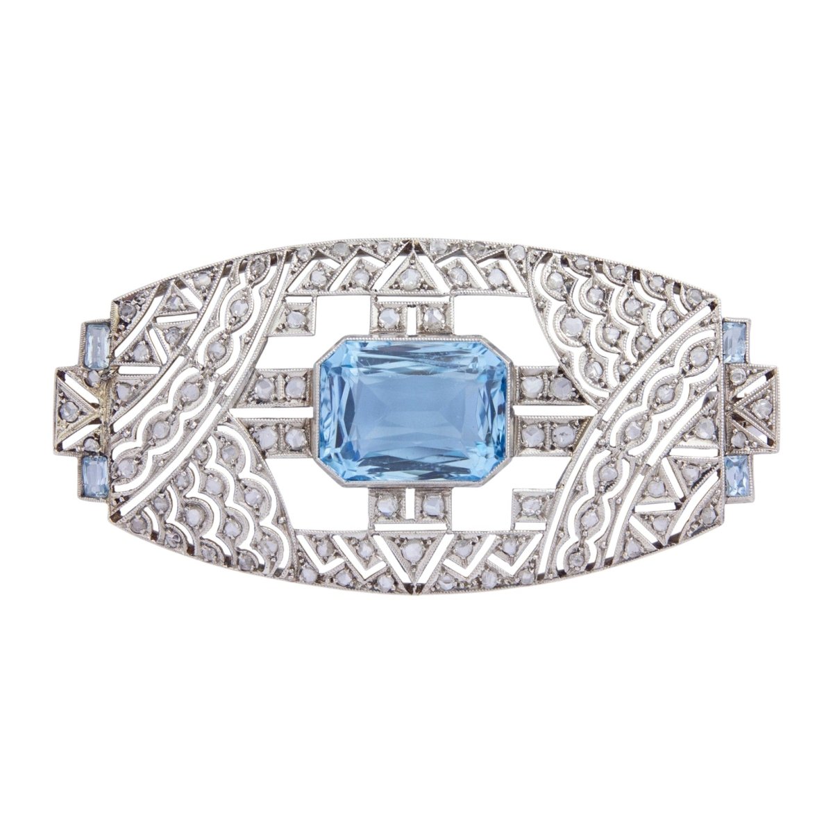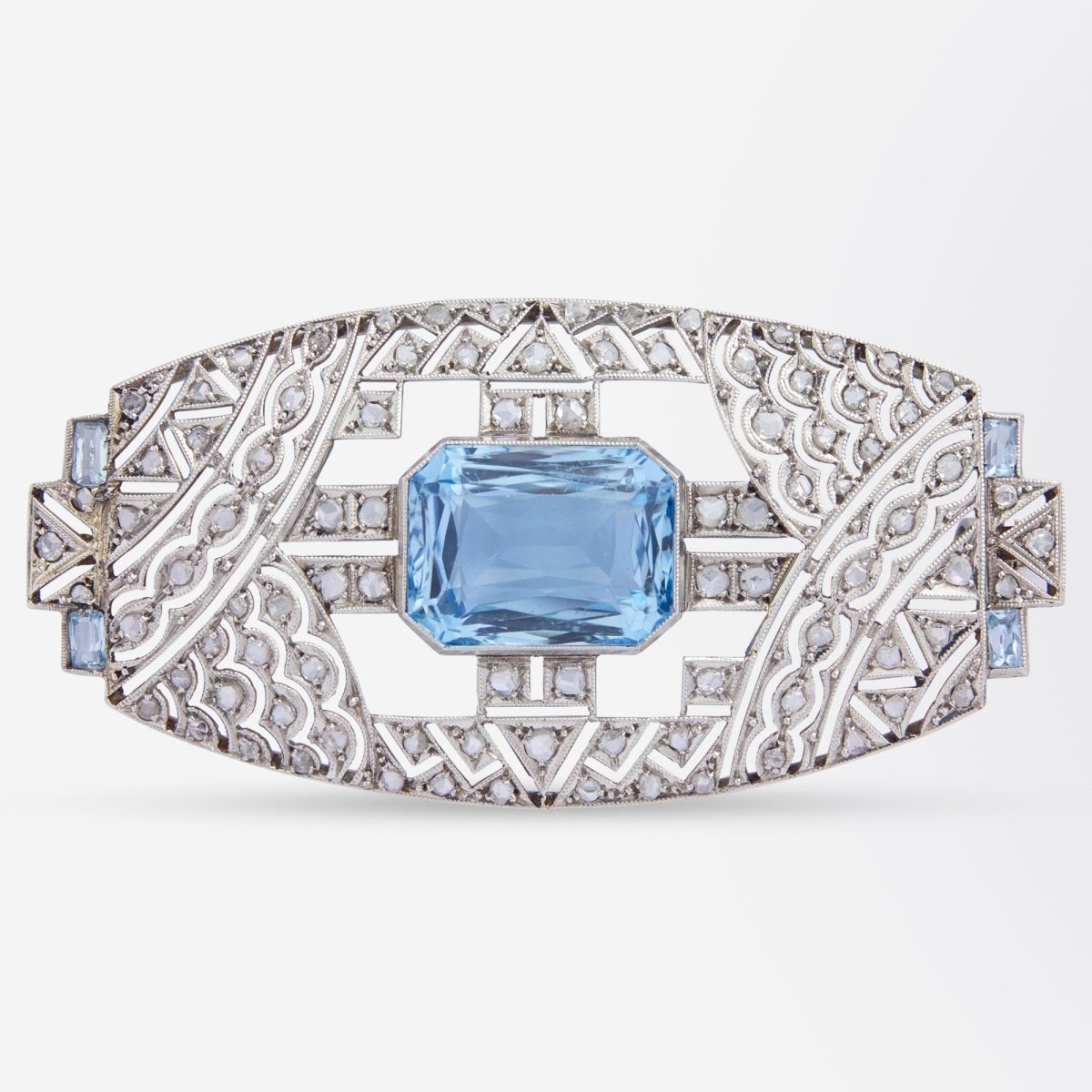 This stunning Art Deco brooch pin has been crafted from platinum and set with bright aquamarines and old cut diamonds. The central aquamarine is an emerald cut stone weighing 8.10 carats that has been rubover set. To the corners of the brooch are a further four aquamarines, these being baguette cut stones finished with a millegrain edge. The balance of the openwork brooch is set with eighty eight old cut diamonds each of H colour and SI clarity, totalling 1.50 carats. To the rear of the brooch is a yellow gold hinged pin with a platinum hook type clasp with safety catch, which are both working well and are secure. Whilst unmarked, the pin which dates to the 1920s likely originates from the United States, a perfect example of a 'Gatsby' era jewel. Whilst designed to be worn on a piece of clothing, with some imagination it could be fastened into the hair or around the neck on a velvet ribbon.