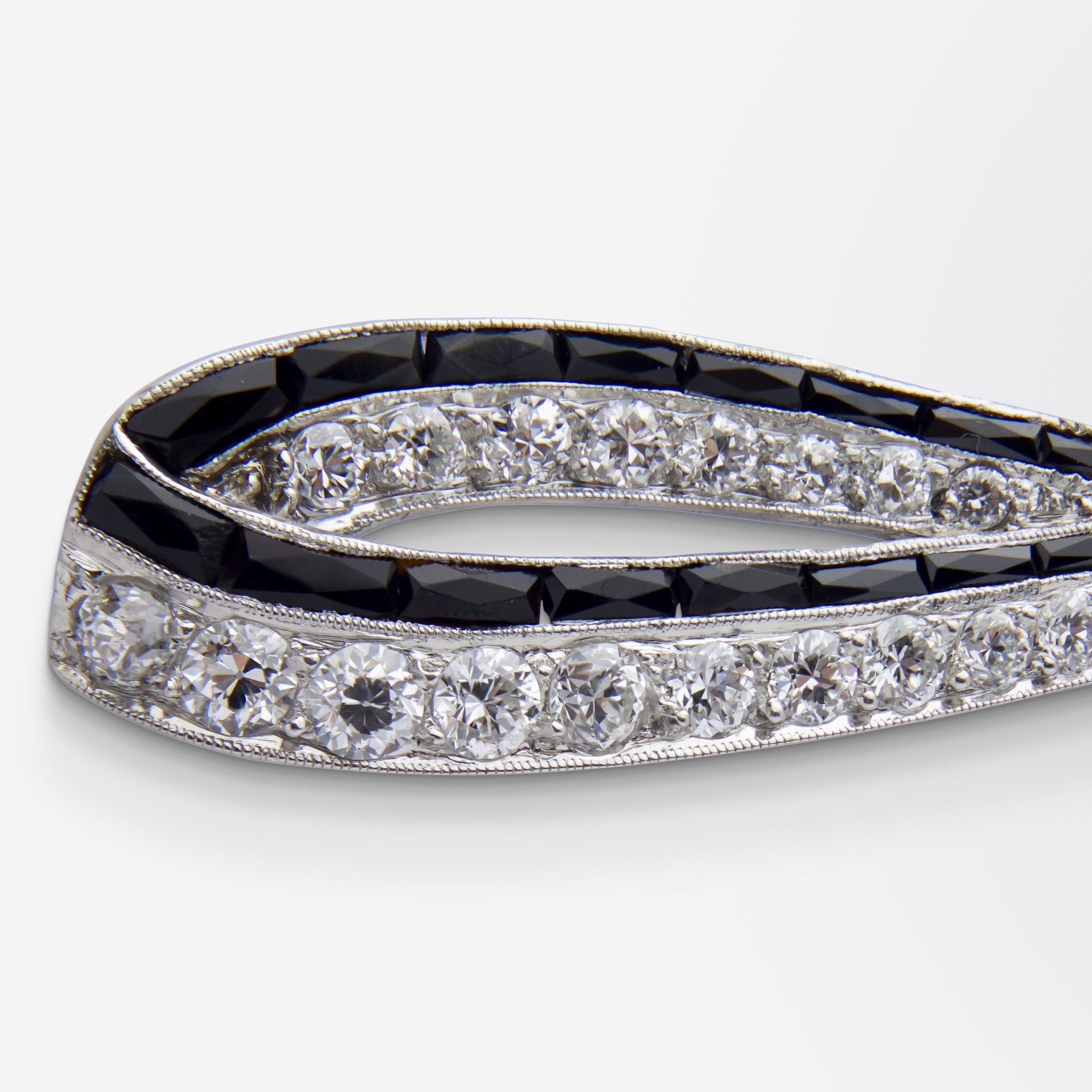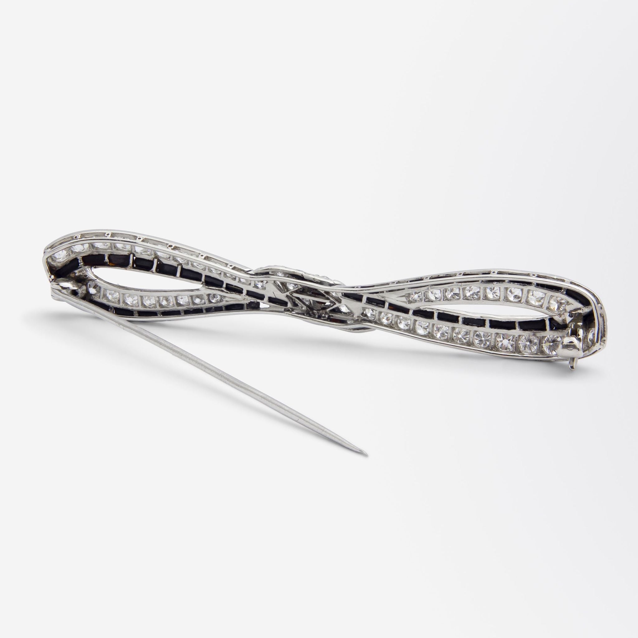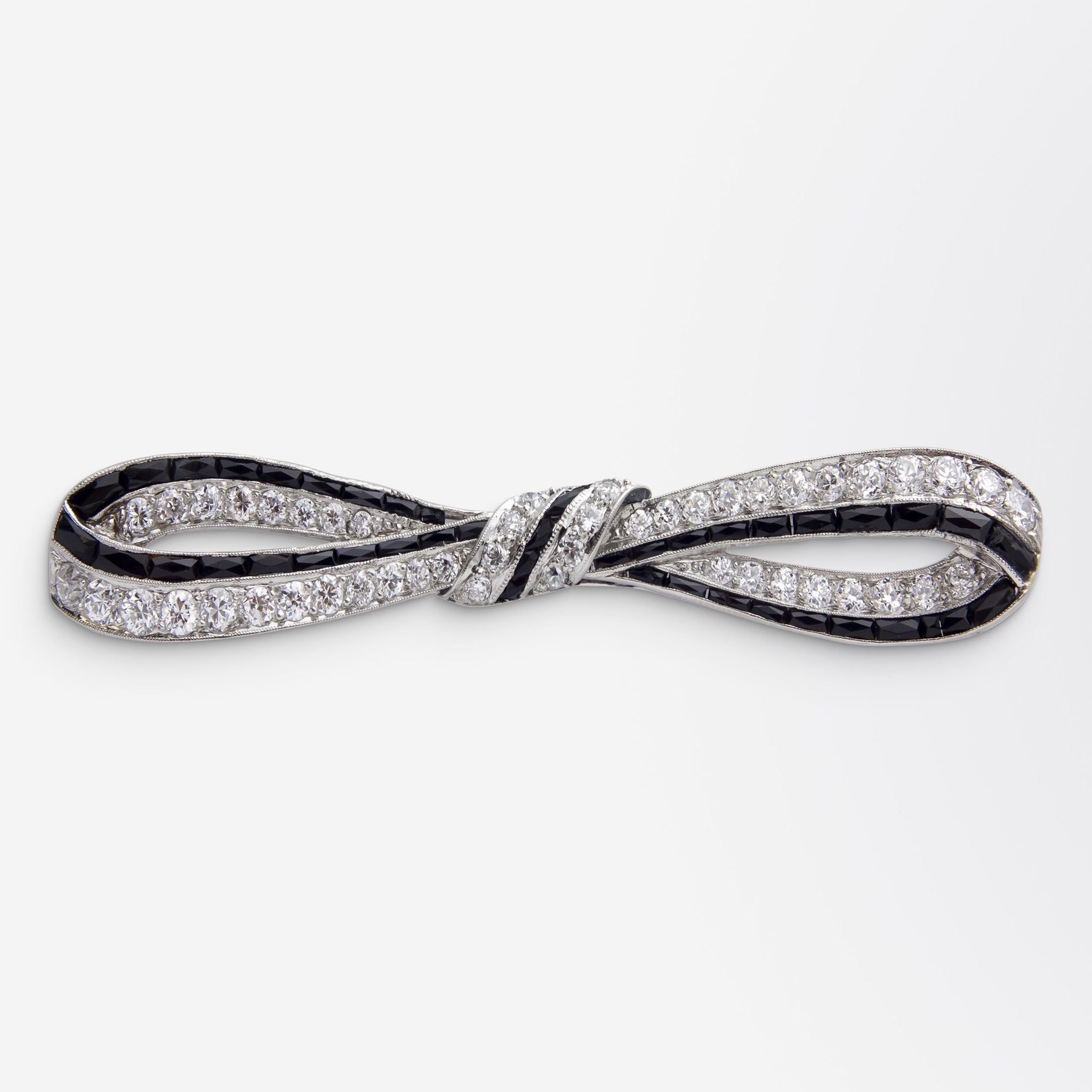 This exceptionally beautiful 'bow' brooch was made during the Art Deco period and has been set with diamonds and black onyx. The handmade platinum frame takes the form of a delicate bow which has been set with 48 old European cut diamonds graded between G and H in colour and SI in clarity totalling 2.10 carat. To add to the Art Deco flair of the piece it has been further set with 43 baguette cut pieces of black onyx, a very popular accompaniment to diamonds in Deco jewellery. To the rear the piece is finished with a hinged pin and 'C' type catch with safety closure, ensuring the piece stays firmly attached to a garment. The brooch retains what we believe to be its original retailing box from Johnson, Walker & Tolhurst who operated from Conduit Street in London. The firm was founded in 1849 and counted Winston Churchill and Indian Maharajas among their clientele. The piece likely dates to the 1930s and presents in good condition, however has been worn throughout its life and several of the onyx pieces have cracks or chips, along with a single diamond showing a chip. These imperfections are not noticeable unless very closely inspected and are commensurate with age and use. This is perhaps the most exquisite Art Deco bow brooch we have had and is bound to be an elegant addition to an evening gown or black jacket.