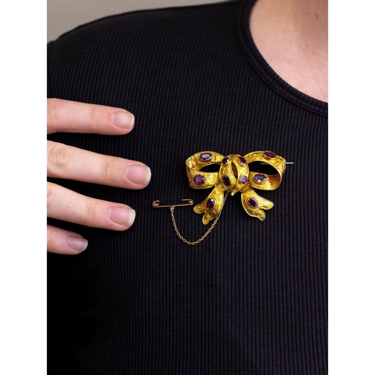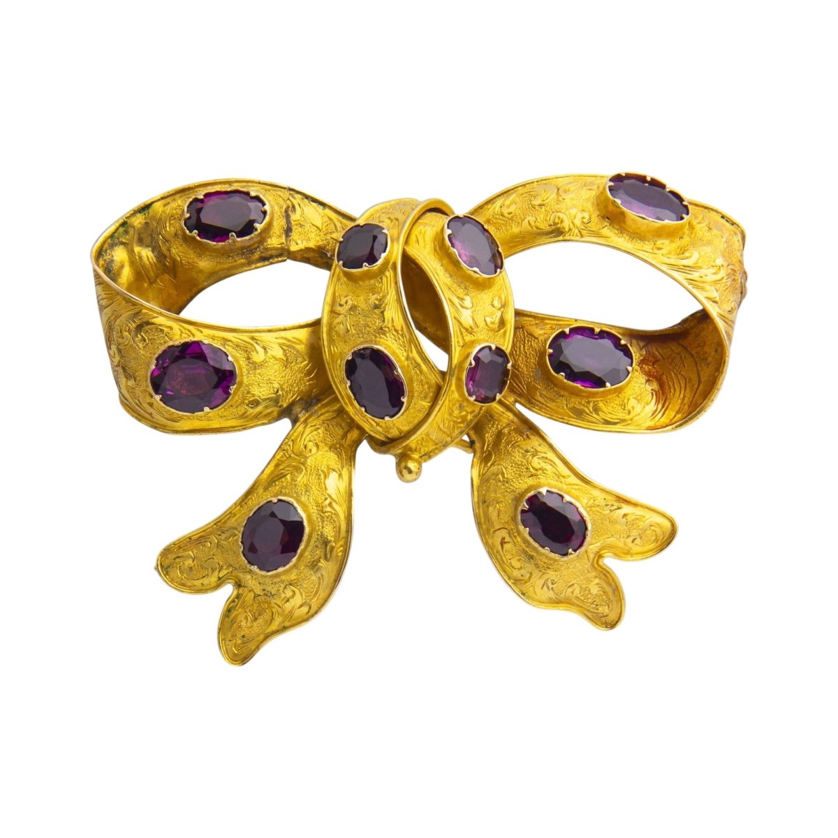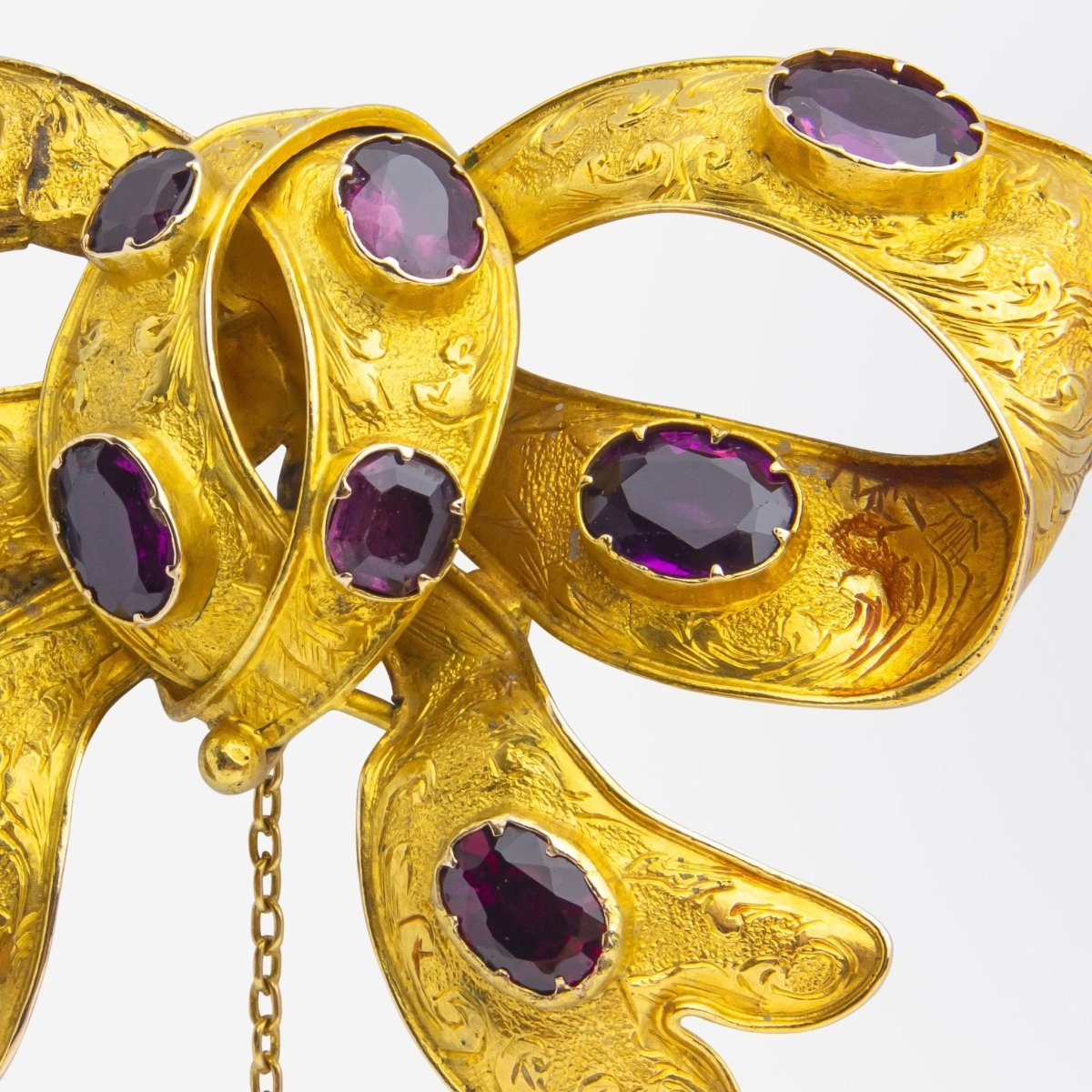This unique and historical brooch pin was manufactured in Victoria in the mid 19th century. By family repute, the brooch was crafted from gold that Alexander Fyfe (1826-1903) had mined in Ballarat as an early prospector, and later had manufactured into a brooch for his to be wife, Jane (pictured), in around 1854. The ornately engraved high carat gold bow has been set with 10 oval cut Australian 'almandine' type garnets and finished with a hinged pin and catch to the rear. Alexander Fyfe is noted as one of the first prospectors in Ballarat during the beginning of the gold rush before moving into a successful career in Victorian and Queensland politics. Fyfe held a seat in the Victorian Legislative Assembly in the 1850s and represented Rockhampton in the Queensland Legislative Assembly in the early 1870s. The realistically modelled brooch has been well worn and shows signs of use and repair, especially to the rear, all commensurate with age and use. There is a fine gold safety chain with additional pin attached to the piece for added security, however this could be removed if desired. This jewel has remained in the Fyfe family until being recently acquired by The Antique Guild in 2025 and is an important example of early Australian colonial jewellery. A remarkable survivor from the mid 19th Century, when Australia as we know it was still in its infancy.